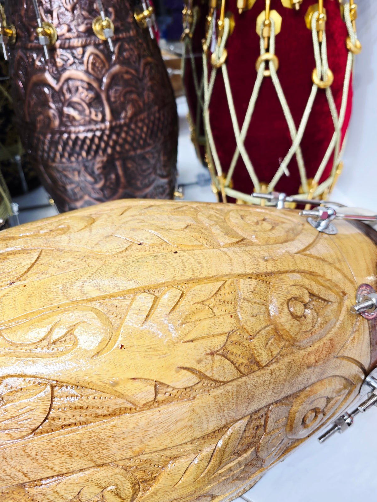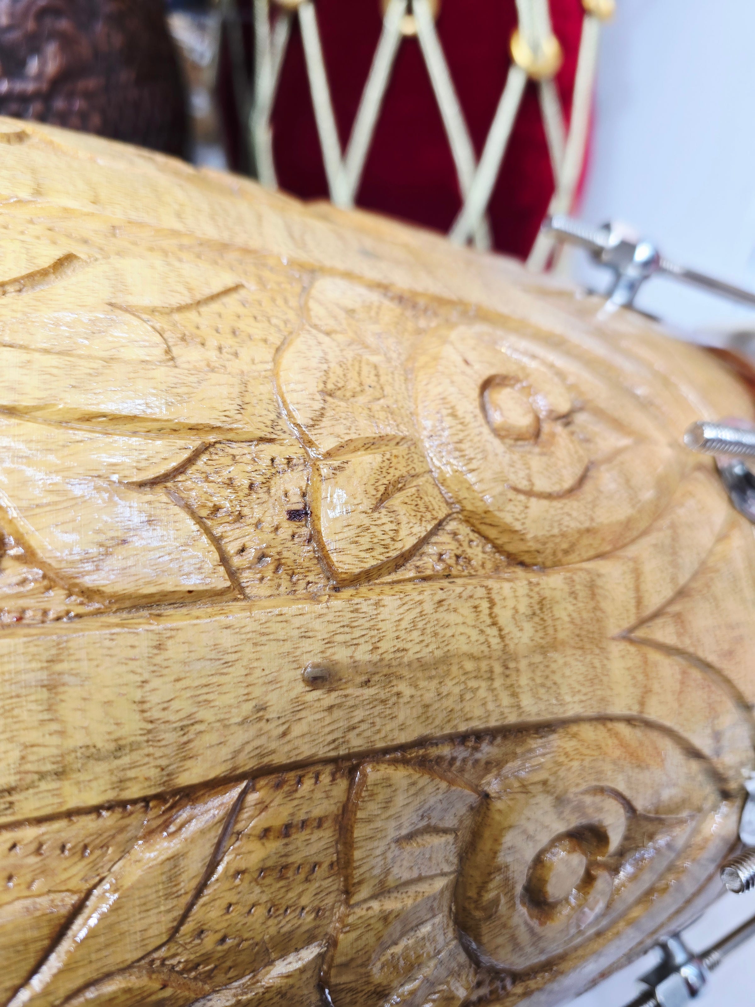 Aaroh Crest is a concert-quality red sheesham dholak, defined by its deep hand-carved shell and a natural satin wood finish that lets the craftsmanship speak for itself. The carving isn’t just decorative—it adds rigidity and mass balance, giving the instrument a focused, powerful projection suited for stage use and high-energy playing.