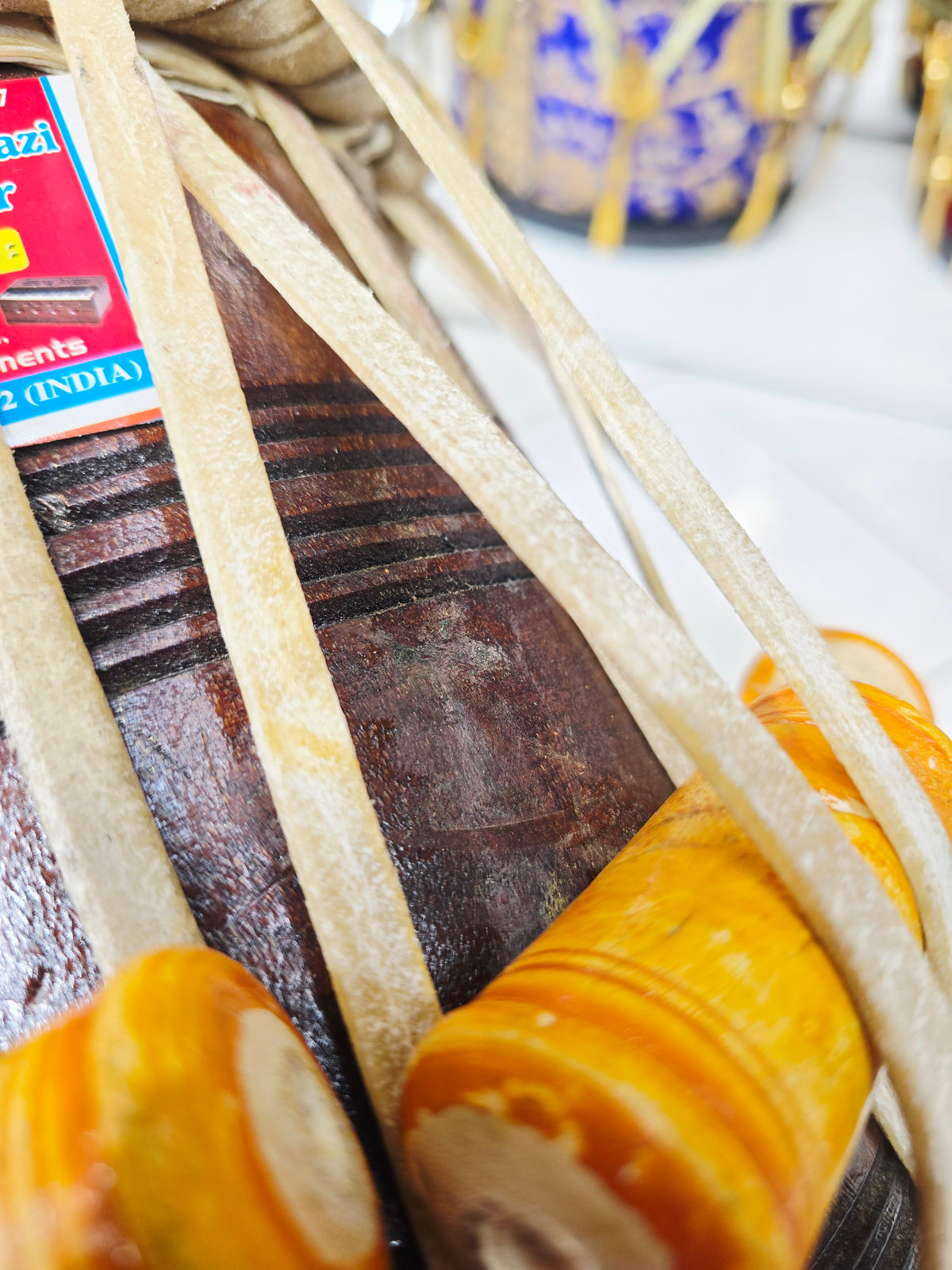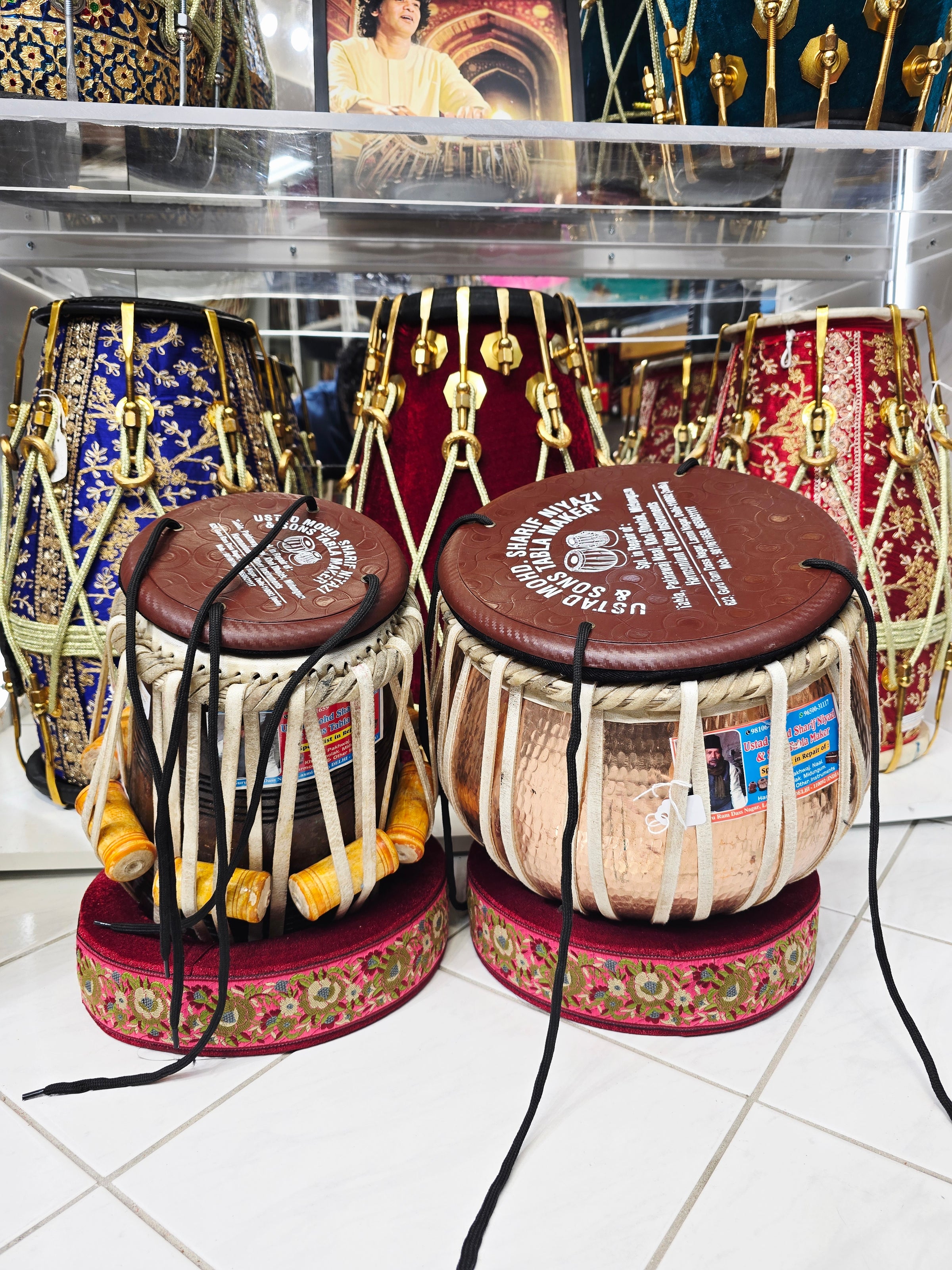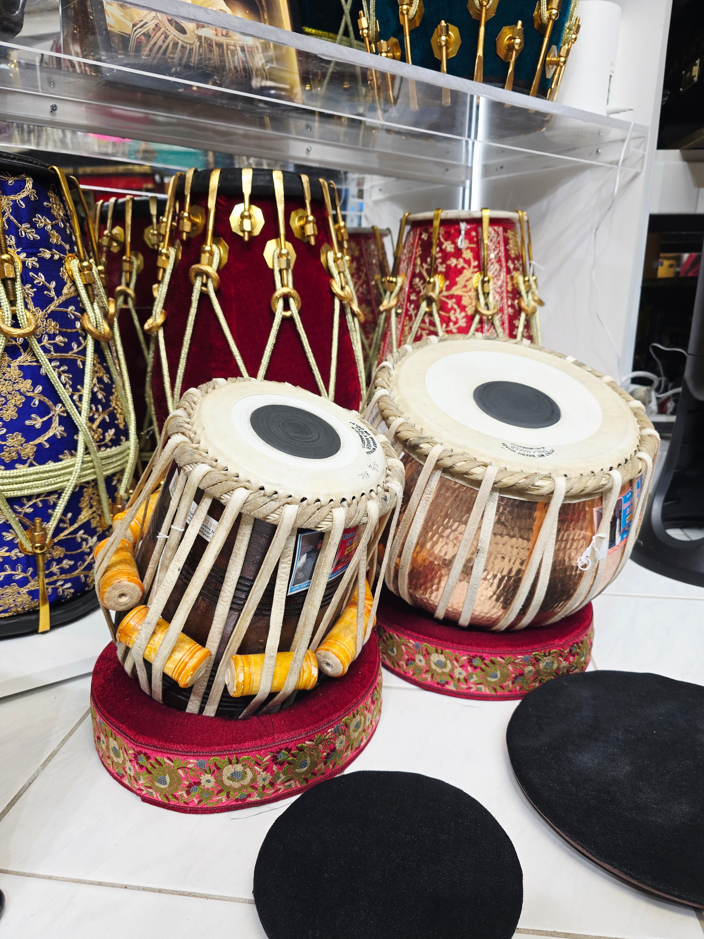 A powerful concert-grade tabla pairing crafted in the celebrated Mohd. Sharif style. The 5.75" B/C red sheesham dayan offers sharp articulation and bright projection, balanced by a deep, weighty 4.5kg copper bayan designed for rich meend, stability, and stage presence. Ideal for professional performance and advanced riyaaz.