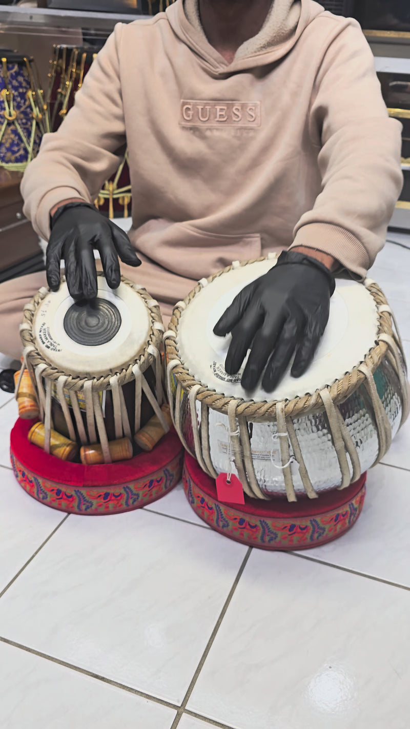A premium tabla ensemble crafted in the Mohd. Sharif style, featuring a bright and articulate 5.5" D# red sheesham dayan paired with a powerful 9.25" 4.5kg silver copper bayan. Designed for musicians seeking clarity, projection, and rich tonal depth for both stage and studio.