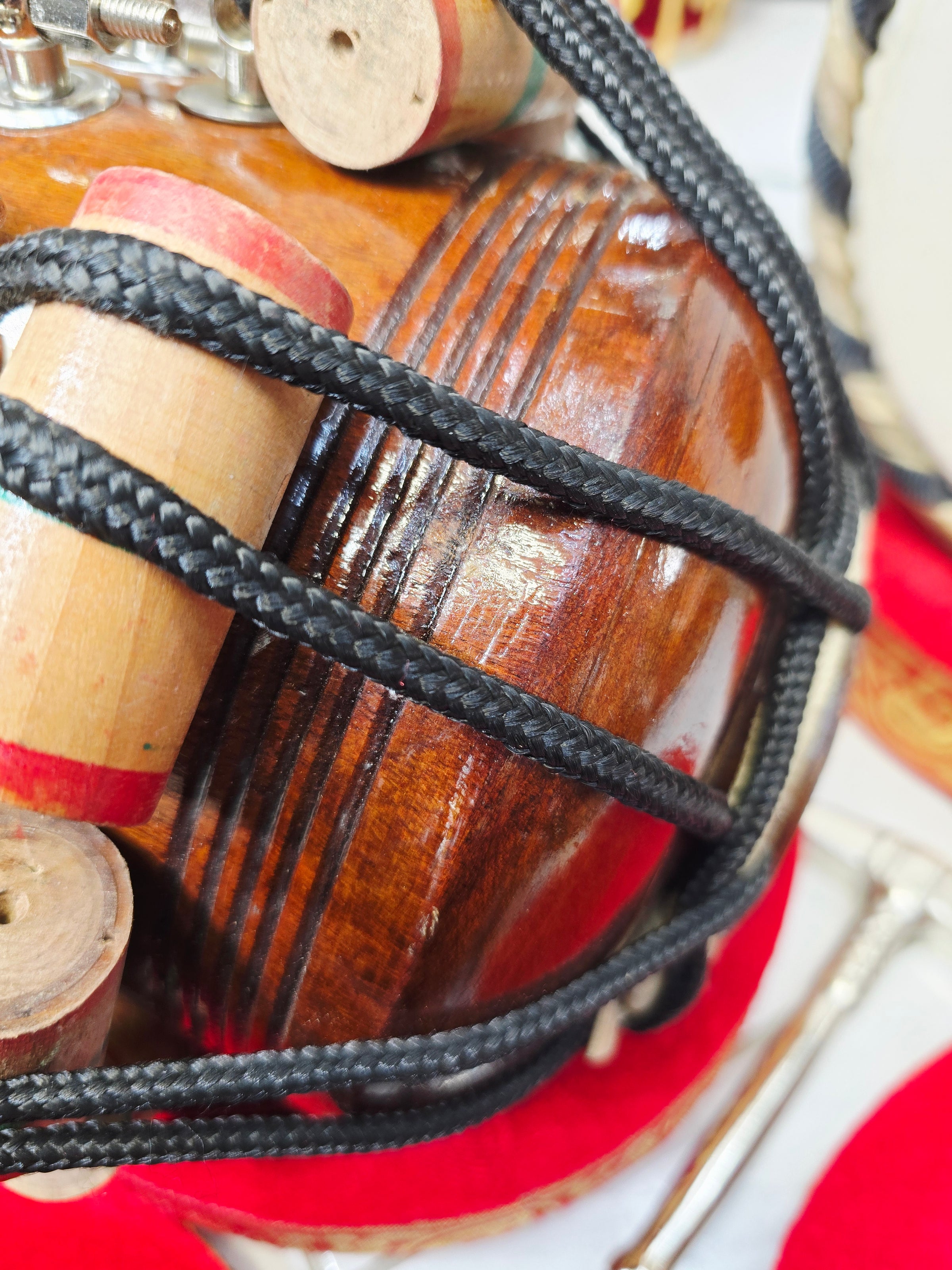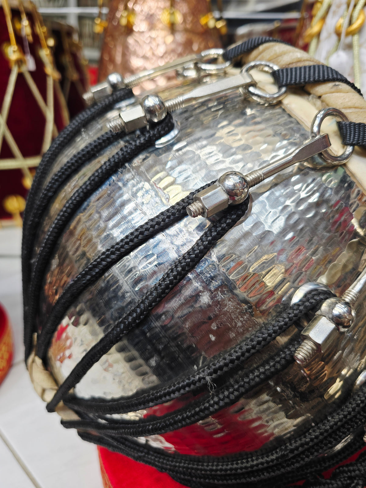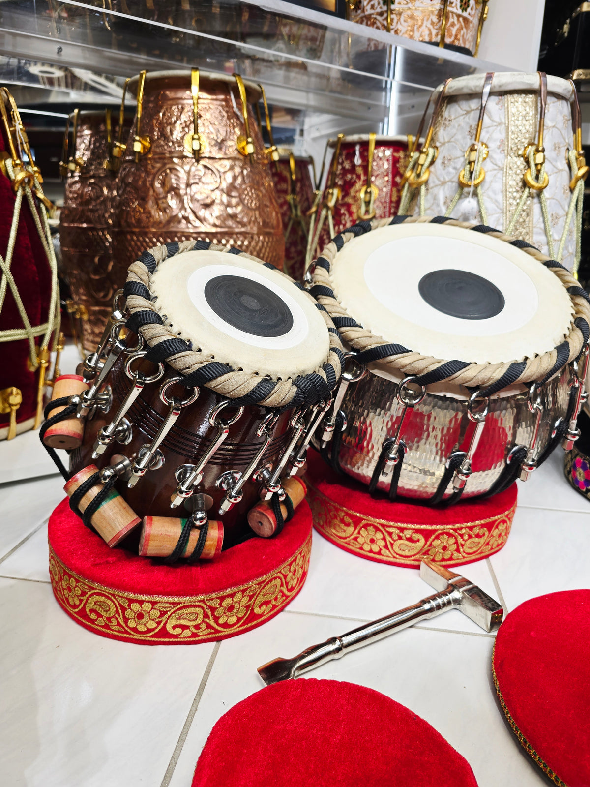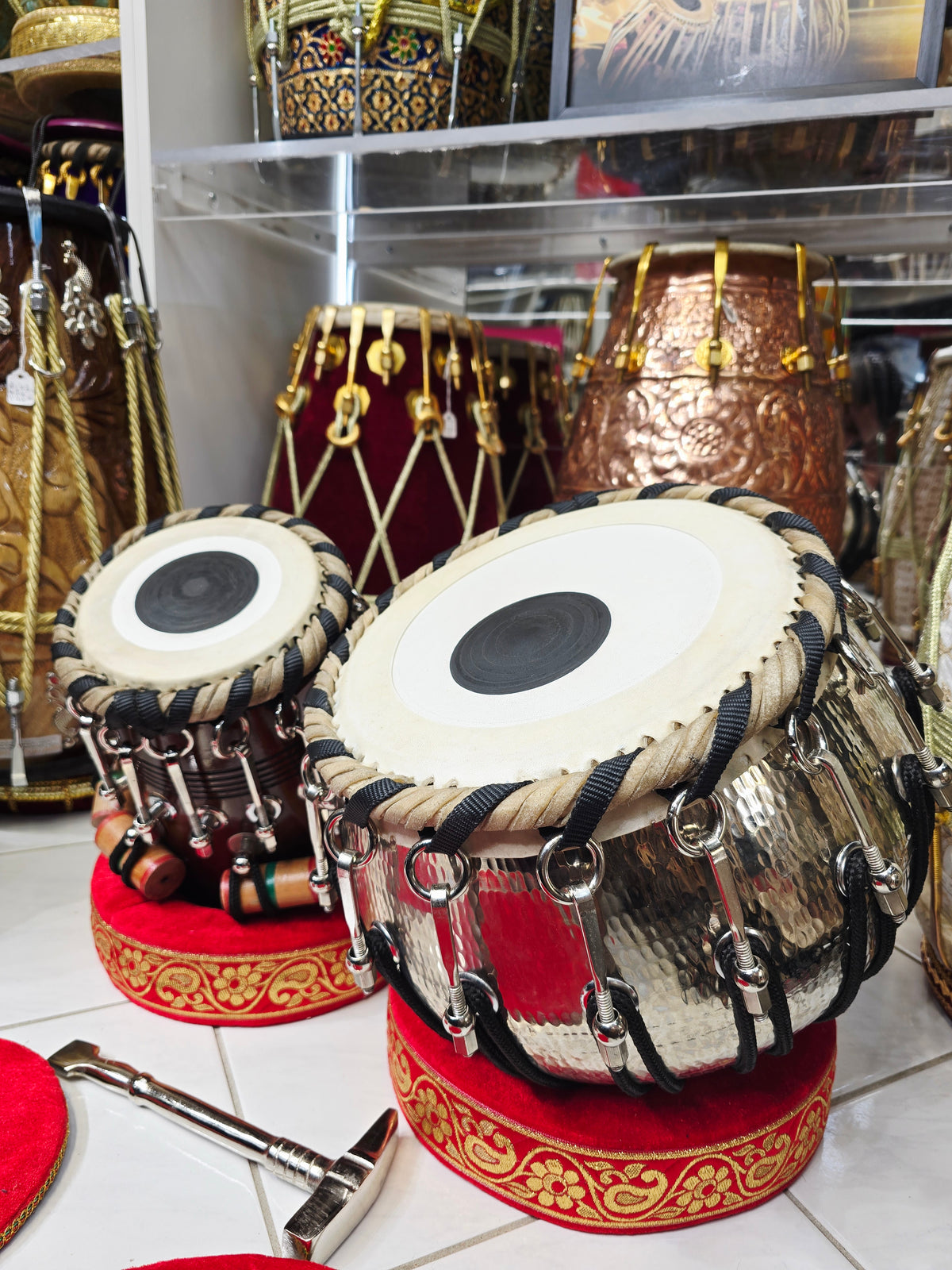 The Sterling Naad set unites durability with refined tonal artistry. The 9.25" silver-polished copper bayan delivers a deep, commanding resonance, while the 5.75" red sheesham dayan tuned to C#/D offers crisp, articulate treble. Enhanced with a bolted design for reliable stability and long-term tuning, this tabla set is crafted for serious performers who demand both strength and sonic precision. A professional blend of tradition and innovation, the Sterling Naad is built to shine on stage and endure in practice.