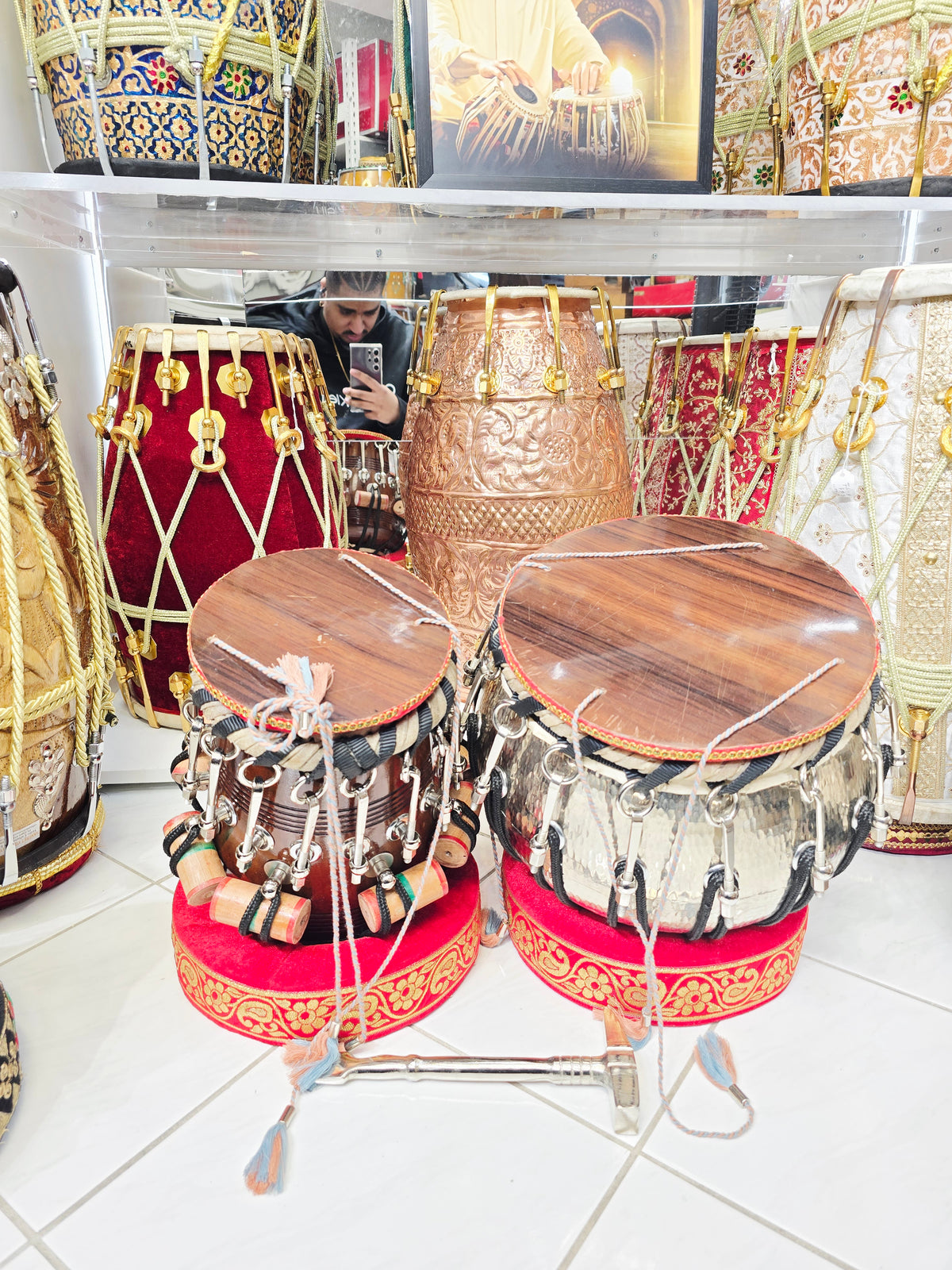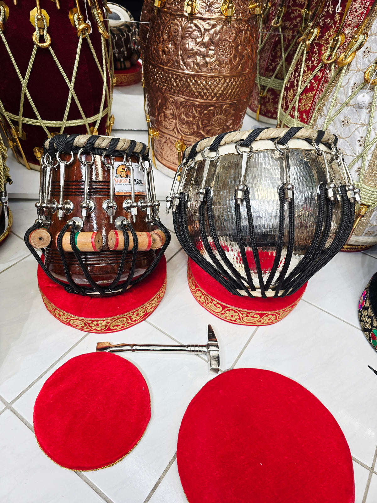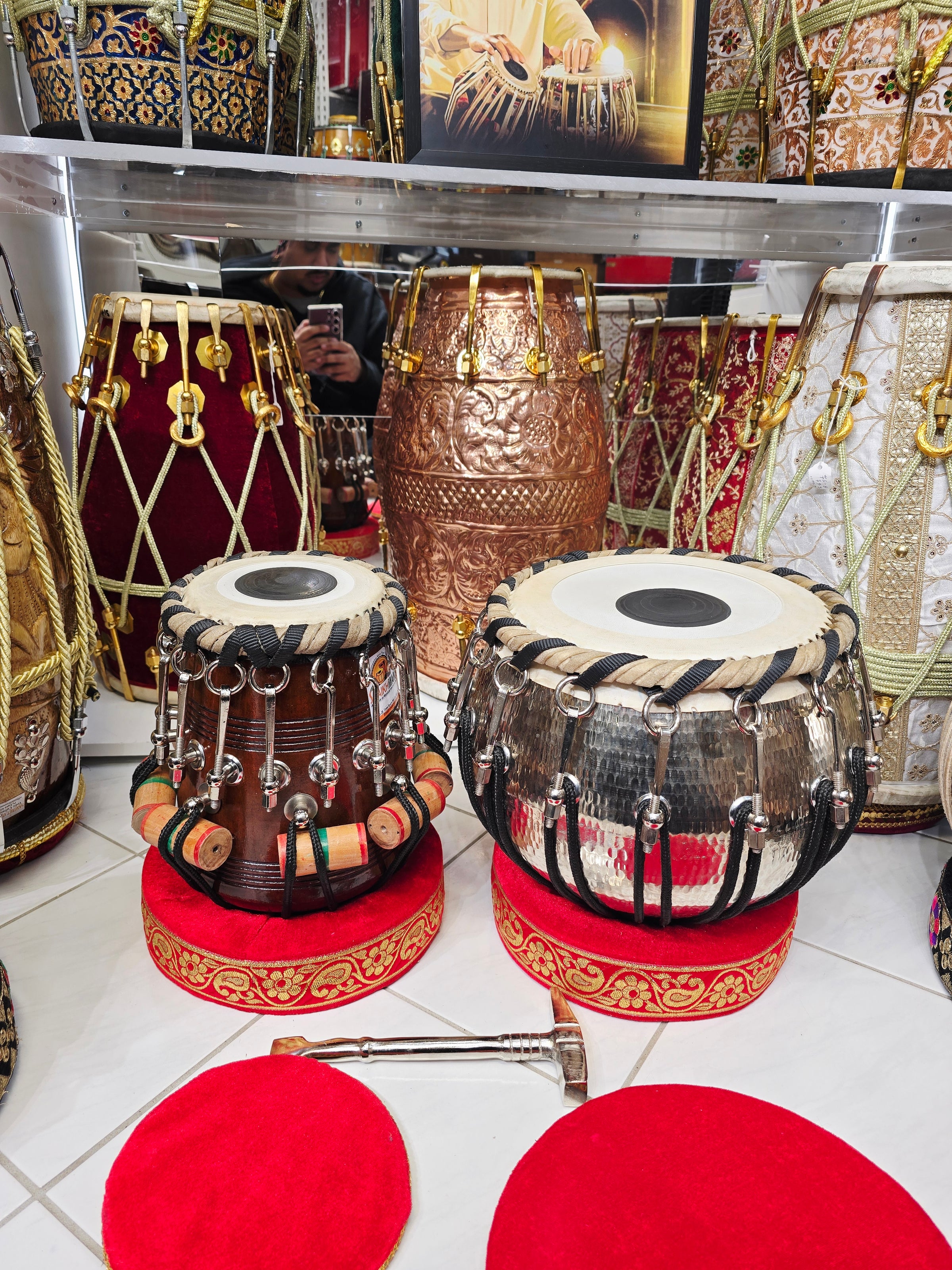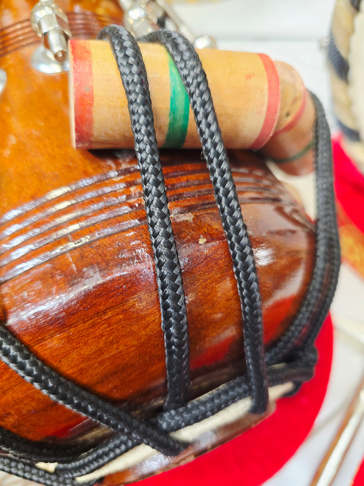 The Sterling Naad set unites durability with refined tonal artistry. The 9.25" silver-polished copper bayan delivers a deep, commanding resonance, while the 5.75" red sheesham dayan tuned to C#/D offers crisp, articulate treble. Enhanced with a bolted design for reliable stability and long-term tuning, this tabla set is crafted for serious performers who demand both strength and sonic precision. A professional blend of tradition and innovation, the Sterling Naad is built to shine on stage and endure in practice.