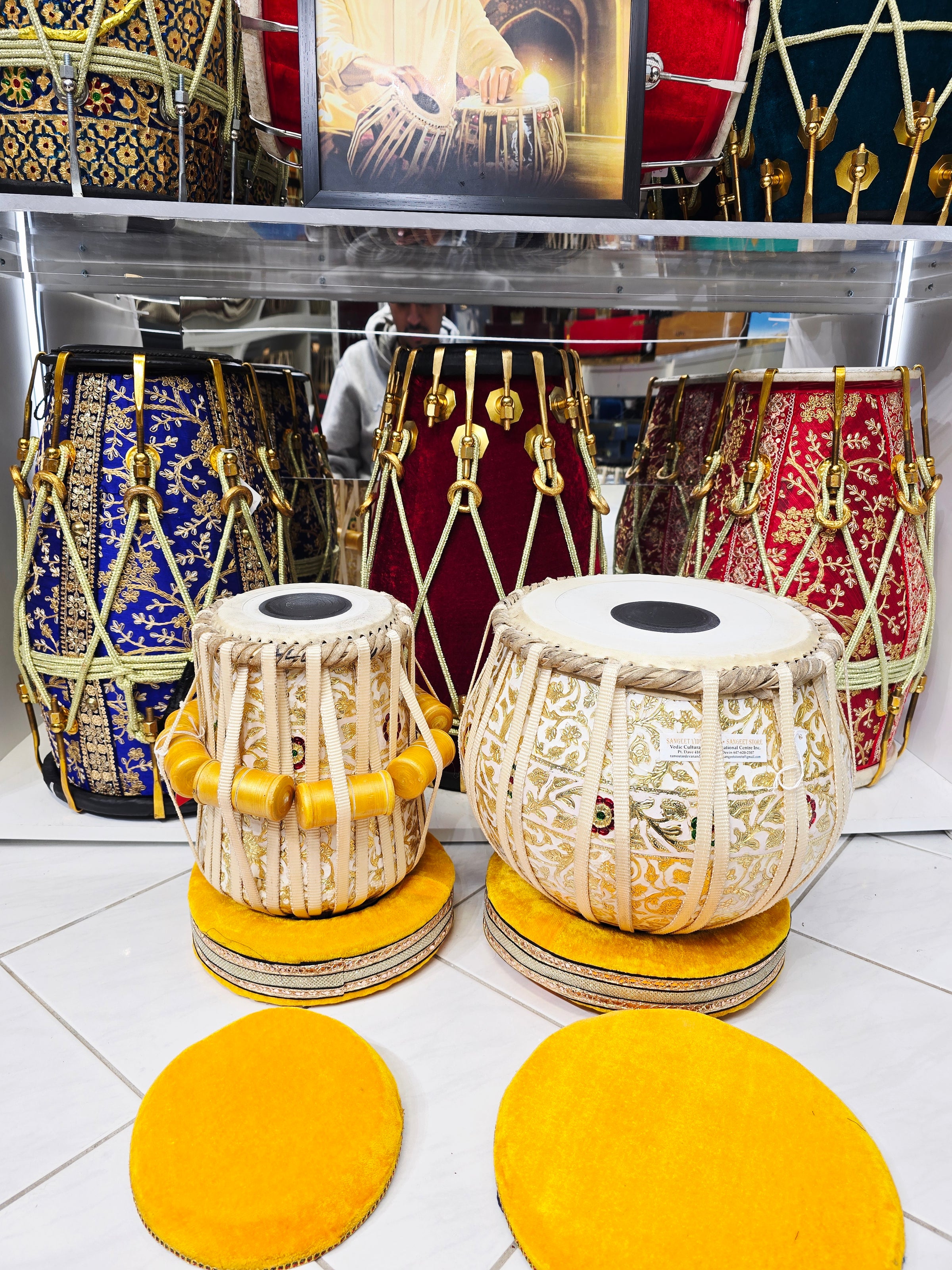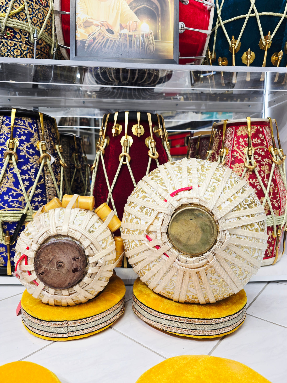 A refined exotic tabla set that blends luxury presentation with commanding sound. The responsive 5.5" red sheesham dayan offers crisp articulation, while the heavyweight 9.25" brass bayan (5.7kg) delivers deep, powerful bass. Finished in an elegant white and gold designer wrap with durable nylon strapping, this set is ideal for stage performance, ceremonial use, and premium collections.