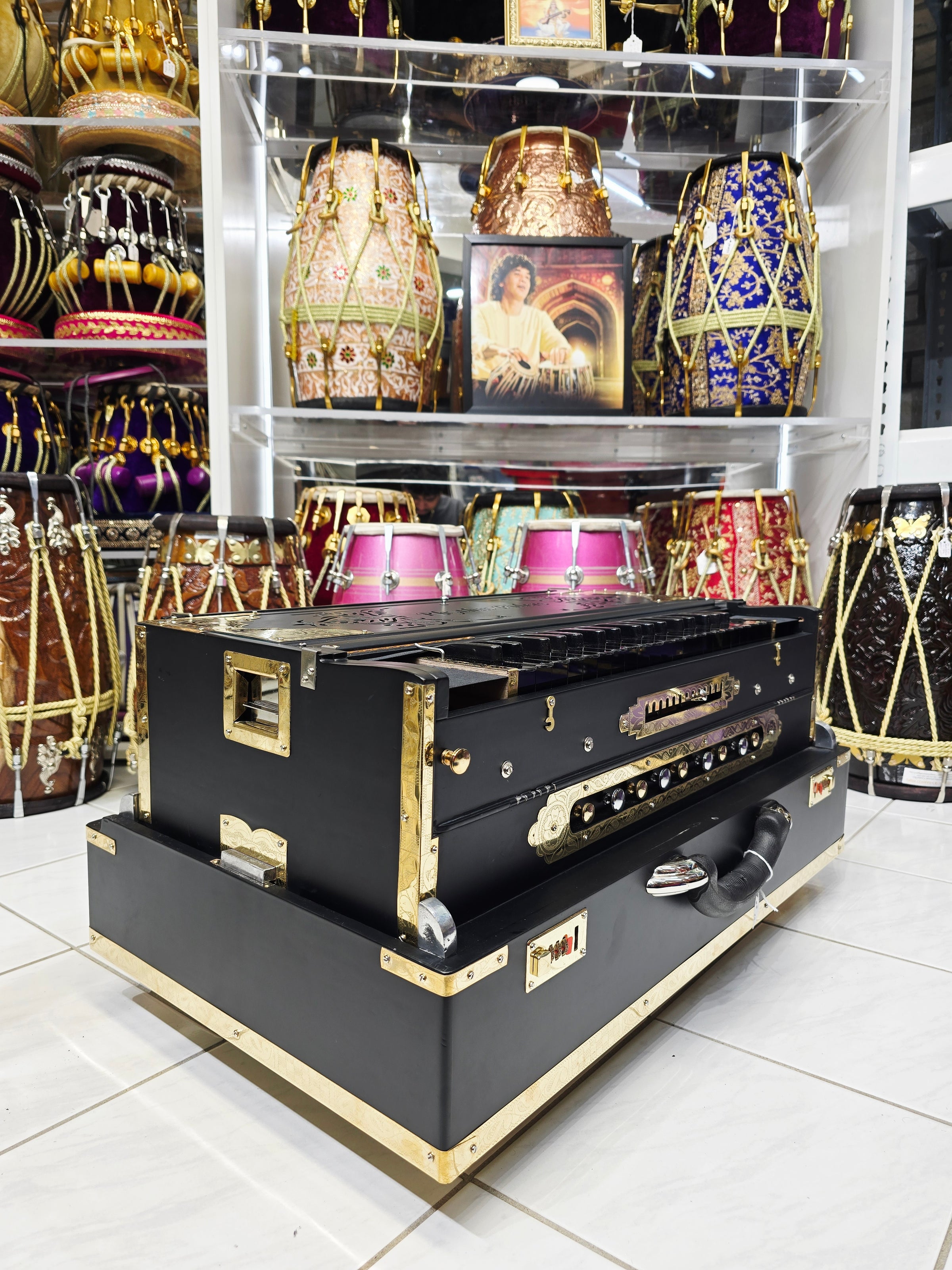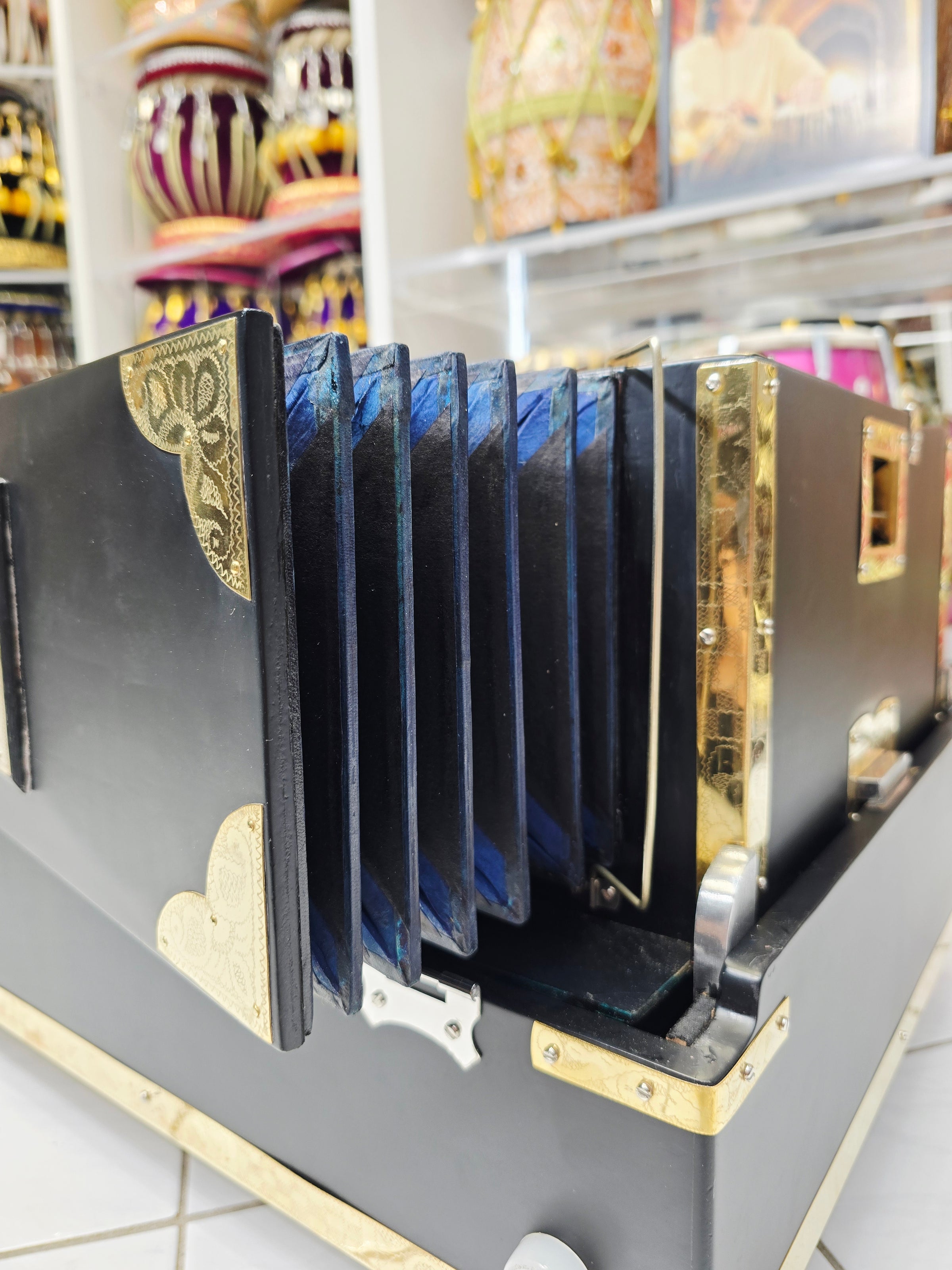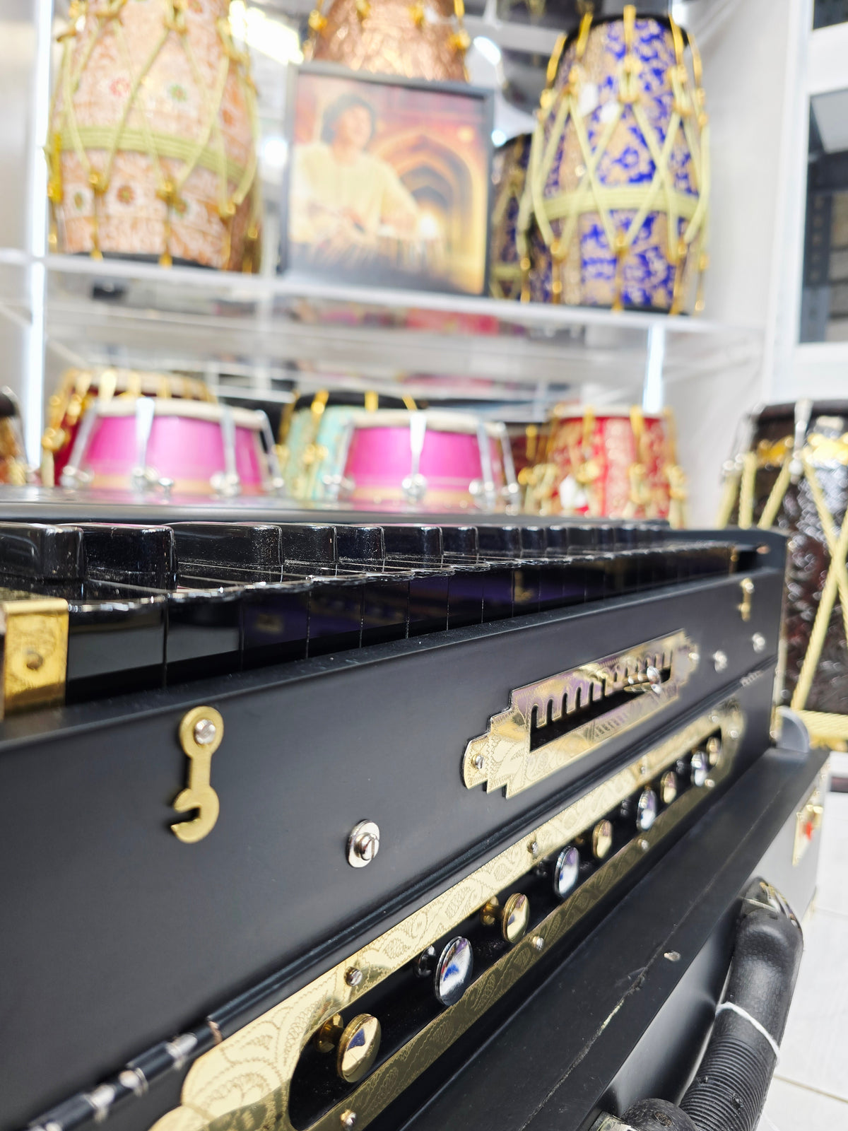 Bold, elegant, and deeply intentional — Reshma Raag is a one-of-a-kind matte black harmonium, handcrafted with subtle power and modern artistry. Featuring a 3-reed Bass-Male-Female configuration and a 9-scale changer, it offers professional tonal range wrapped in minimalist style.