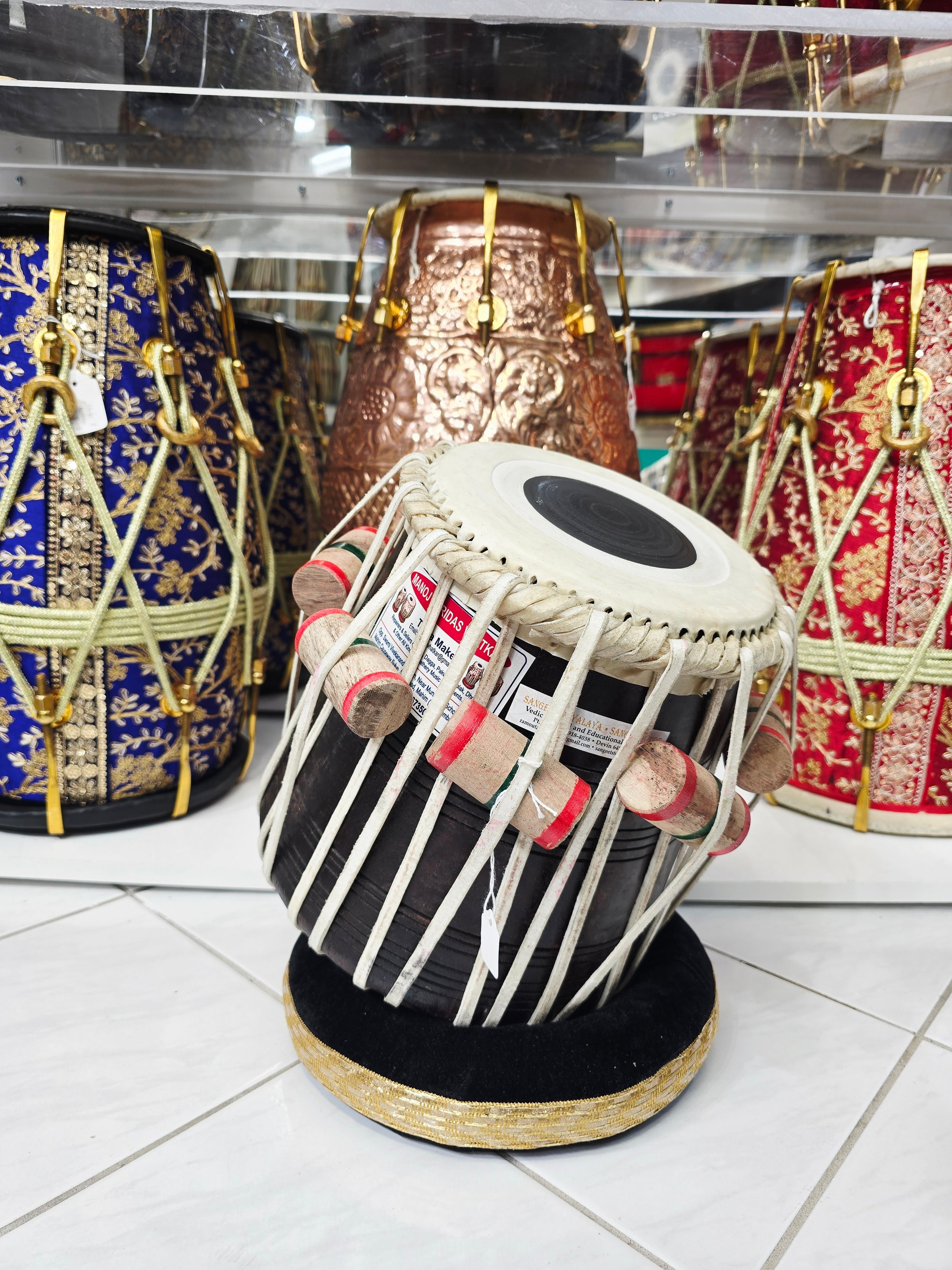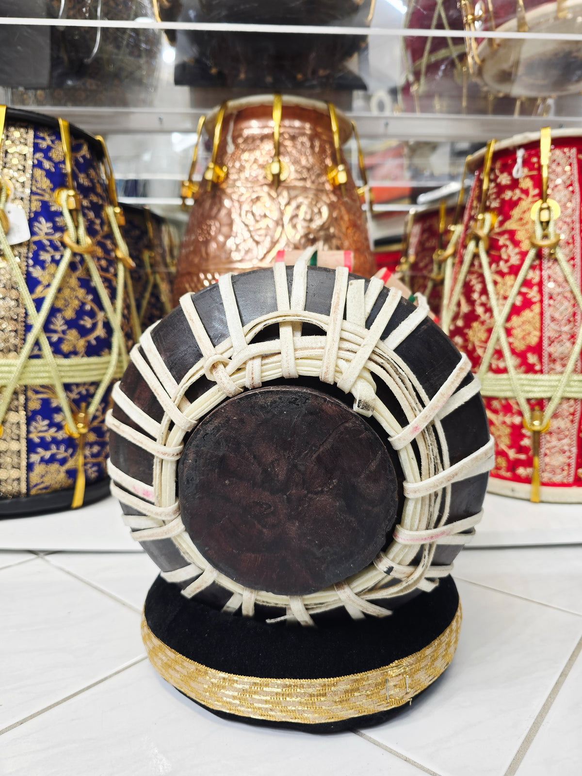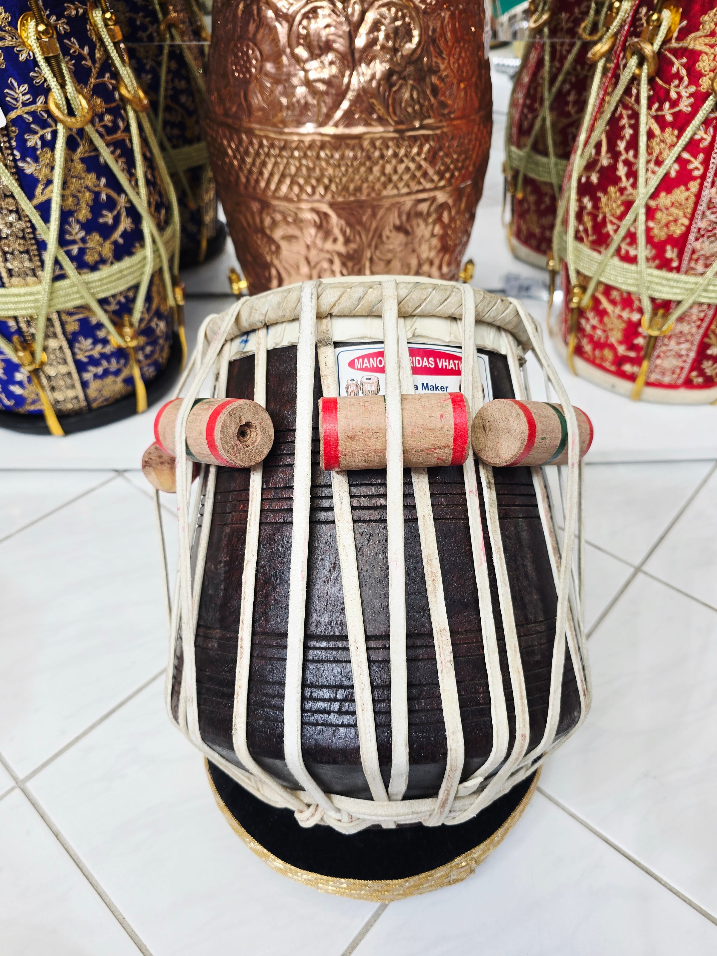Hand-carved from deep black sheesham, the Krishnadhaara Jori Dayan embodies the flowing, meditative resonance of traditional low-octave Punjab gharana instruments. Tuned to a rich D♯, its 7⅛" profile delivers a warm, weighty foundation with beautifully rounded bols, ideal for kirtan, alaap-style accompaniment, and long-form riyaaz. Crafted by master builder Manoj Vhatkar, this dayan blends classical purity with modern precision, offering a rare combination of tonal depth, stability, and aesthetic elegance.