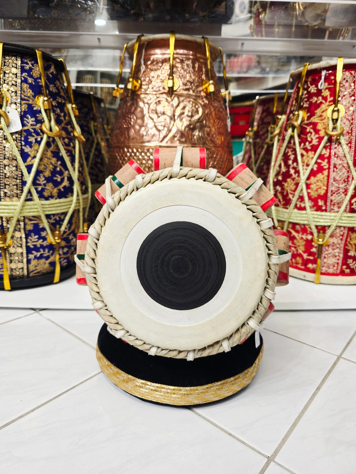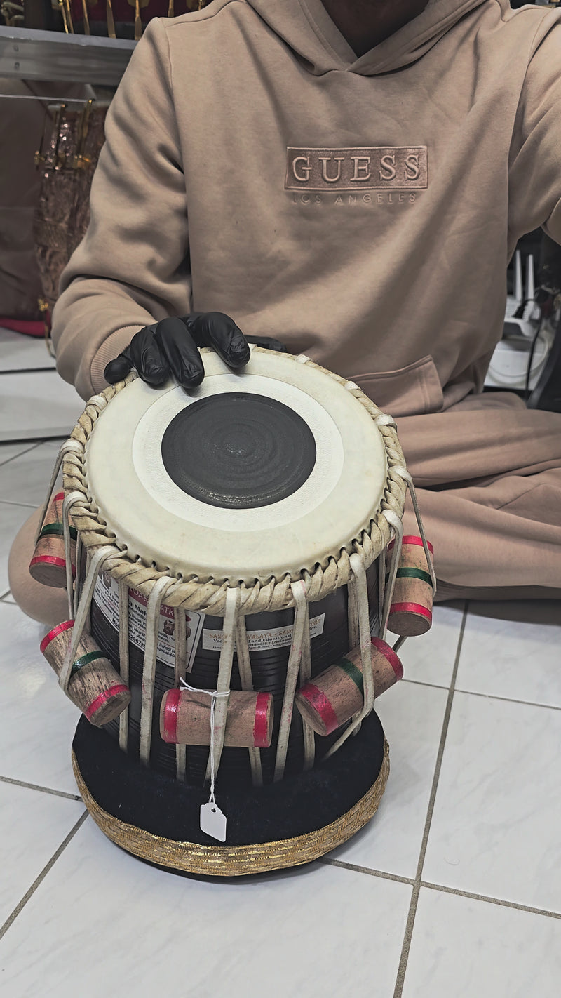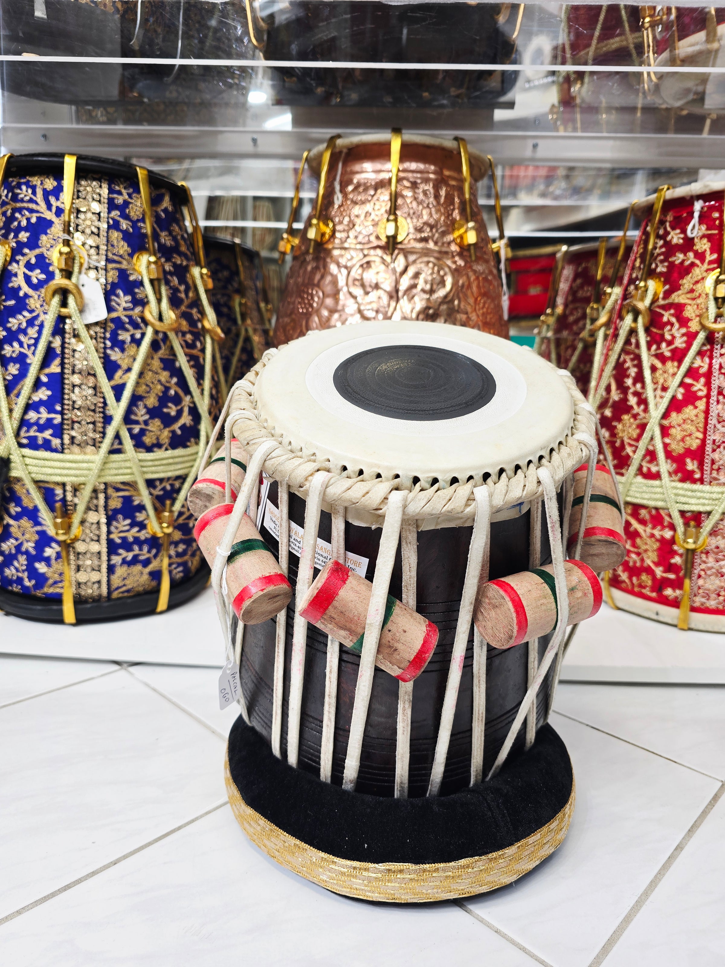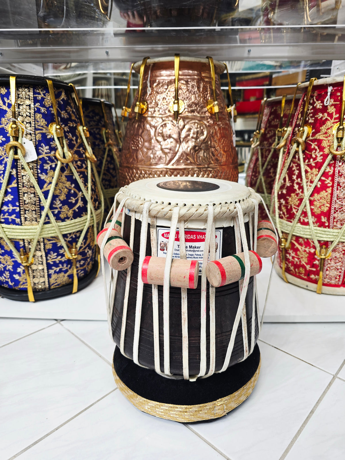 Hand-carved from deep black sheesham, the Krishnadhaara Jori Dayan embodies the flowing, meditative resonance of traditional low-octave Punjab gharana instruments. Tuned to a rich D♯, its 7⅛" profile delivers a warm, weighty foundation with beautifully rounded bols, ideal for kirtan, alaap-style accompaniment, and long-form riyaaz. Crafted by master builder Manoj Vhatkar, this dayan blends classical purity with modern precision, offering a rare combination of tonal depth, stability, and aesthetic elegance.