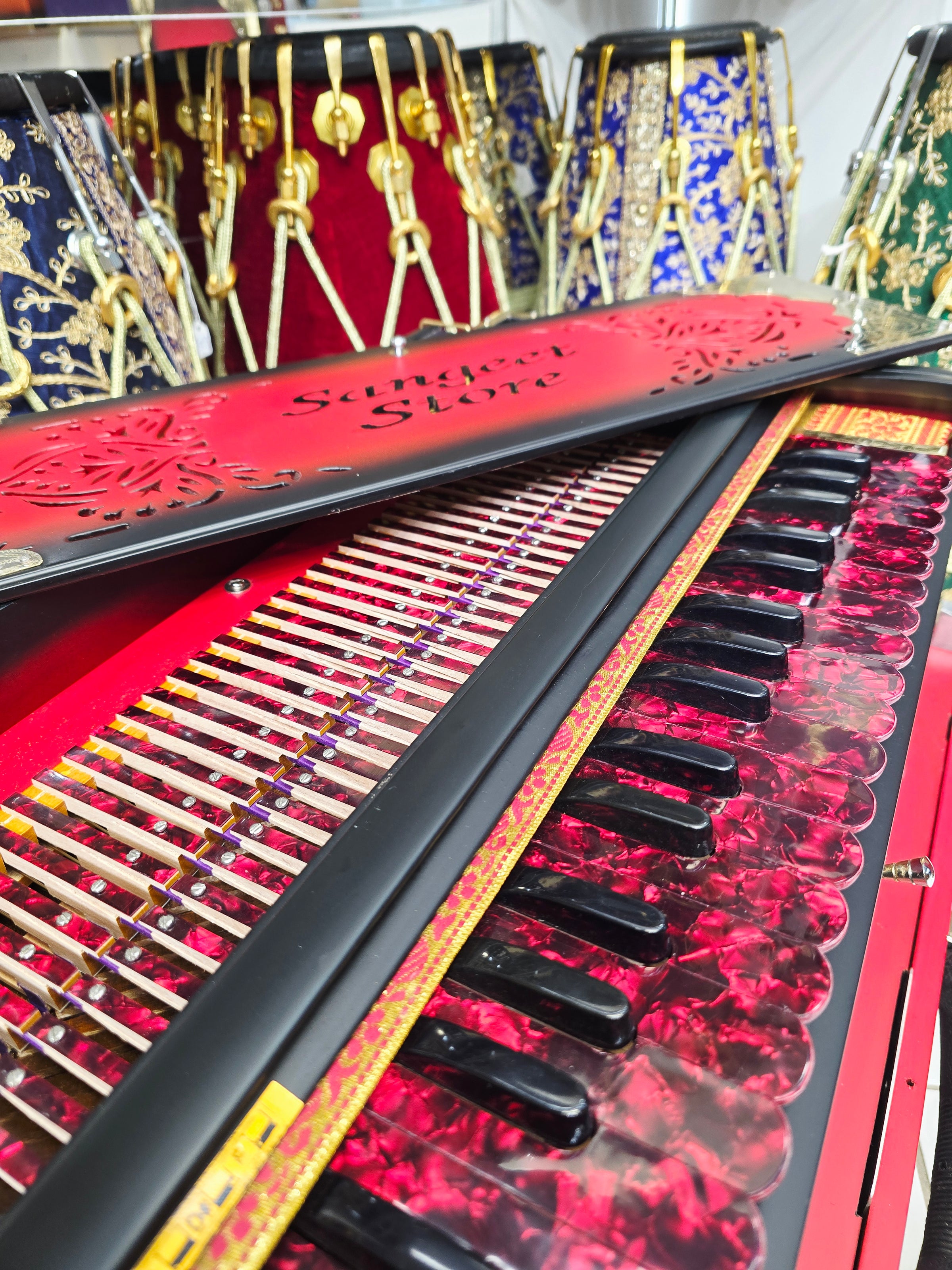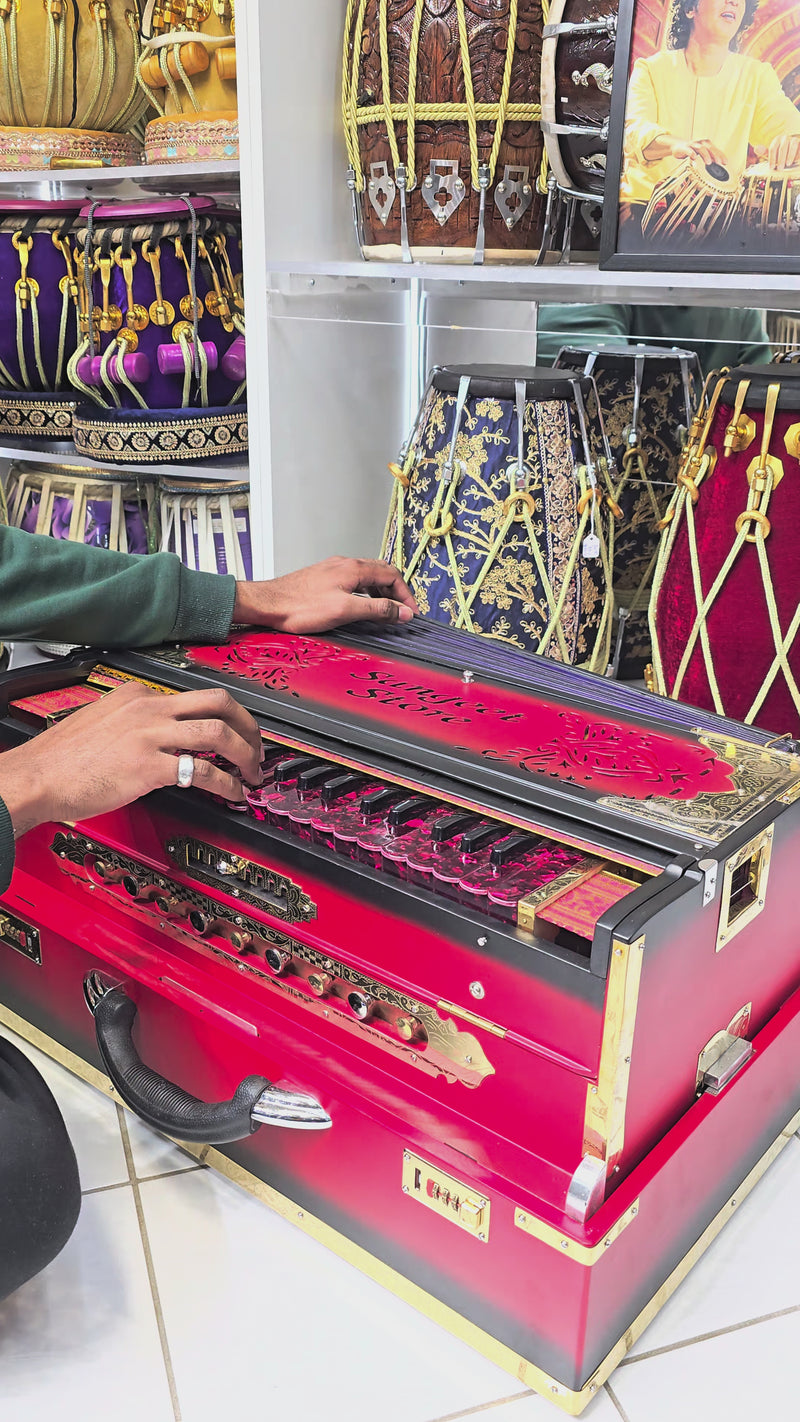 The Agniraag Fusion™ Premium Harmonium showcases a bold matte red and black blended finish paired with striking red German-style keys, giving it a powerful and modern stage presence. Built with a 3-reed BMF configuration, it produces a deep, full bass with crisp, articulate highs, making it well-suited for kirtan, vocal accompaniment, and ensemble performance. The 9-scale changer system offers smooth, reliable transposition while preserving airflow consistency and tuning stability. Encased in a boxed, travel-ready body, this premium-grade harmonium is crafted for players who want standout aesthetics without compromising tonal authority.