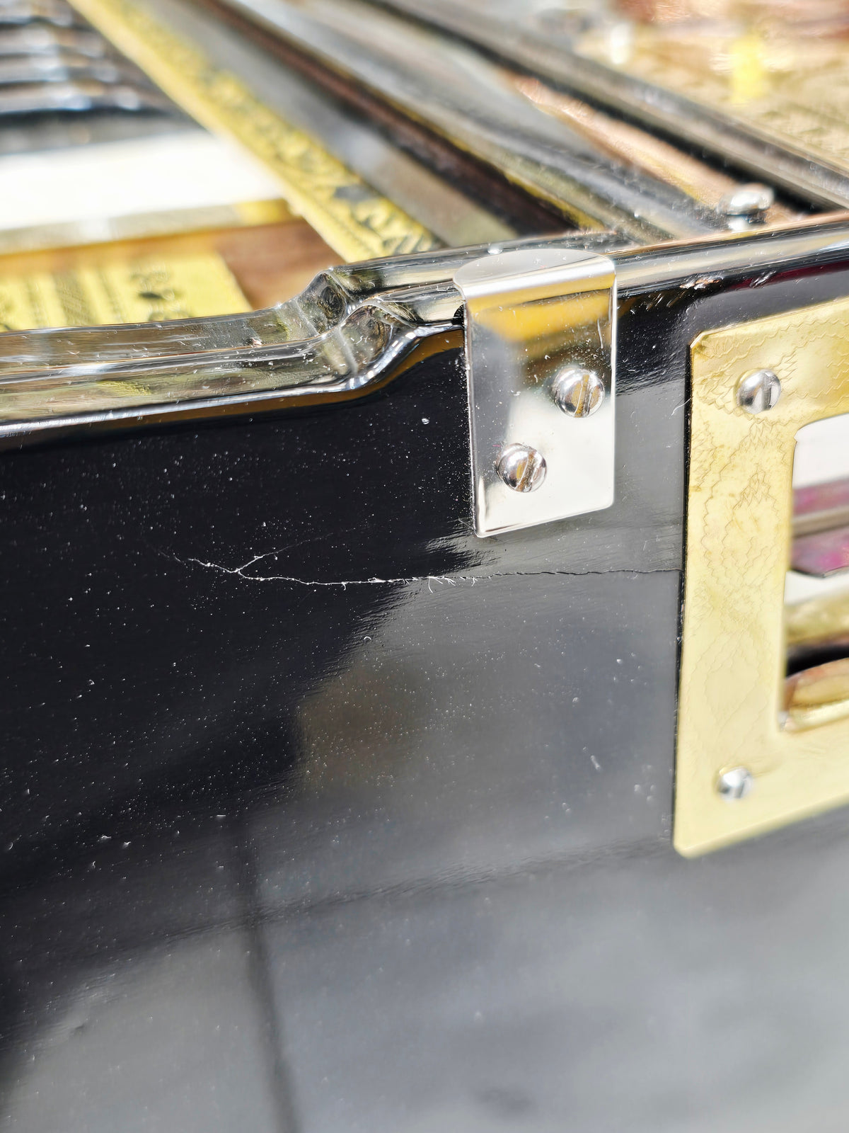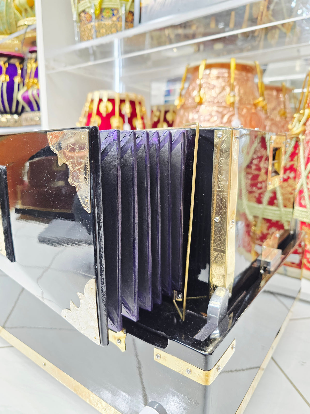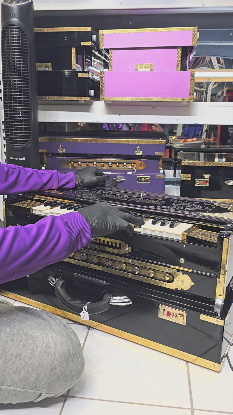 A striking creation in glossy black and gold, the Ebon Sovereign delivers a sweet yet powerful tone through its BMF Palitana Premiere Star reeds. With a 13-scale changer, 4" German keys, and matching black bellows and accents, this custom build for Ramel embodies refined sound, precision, and royal craftsmanship.