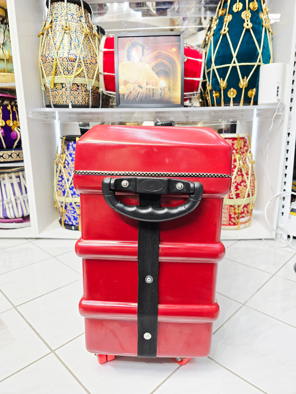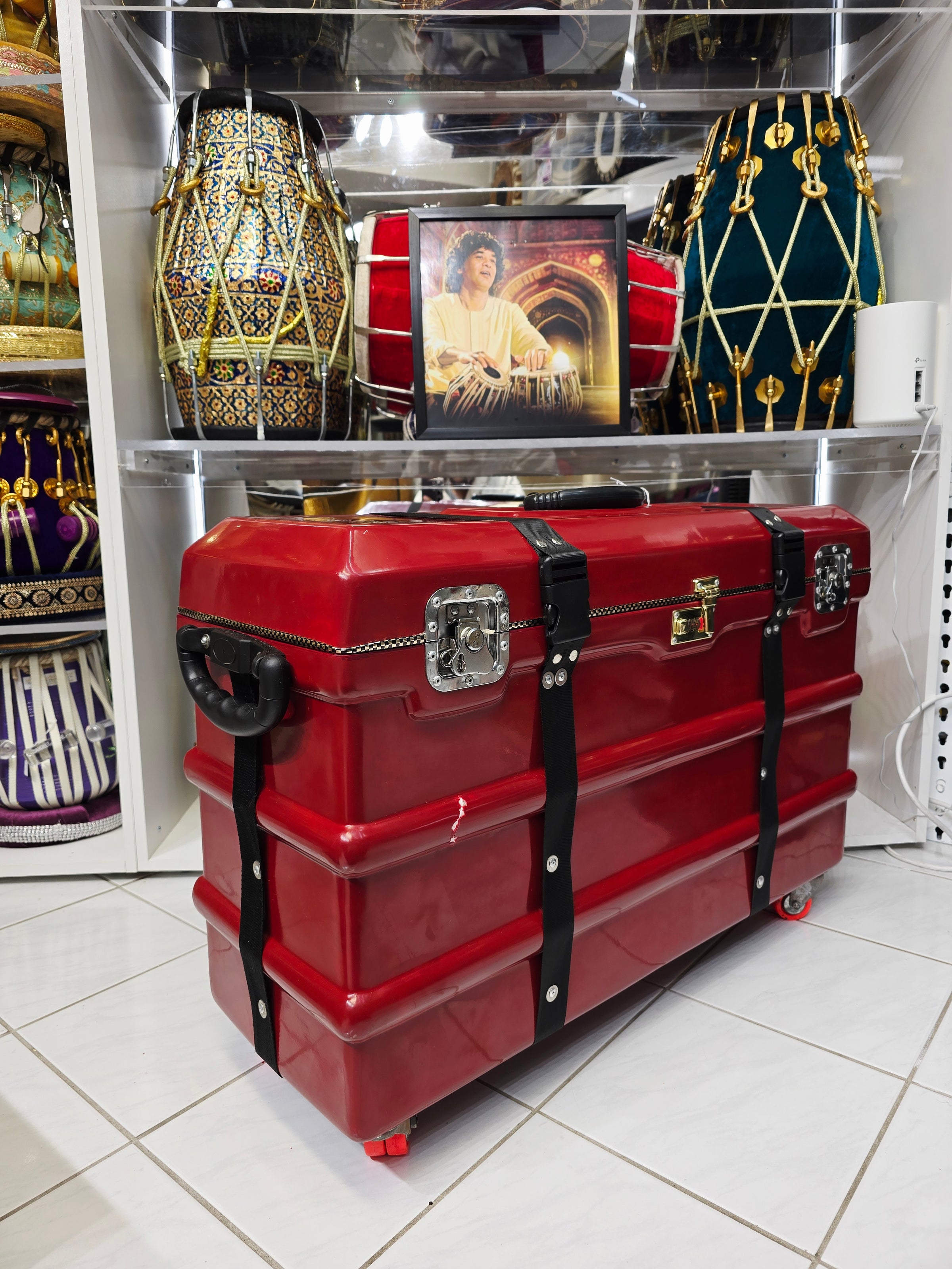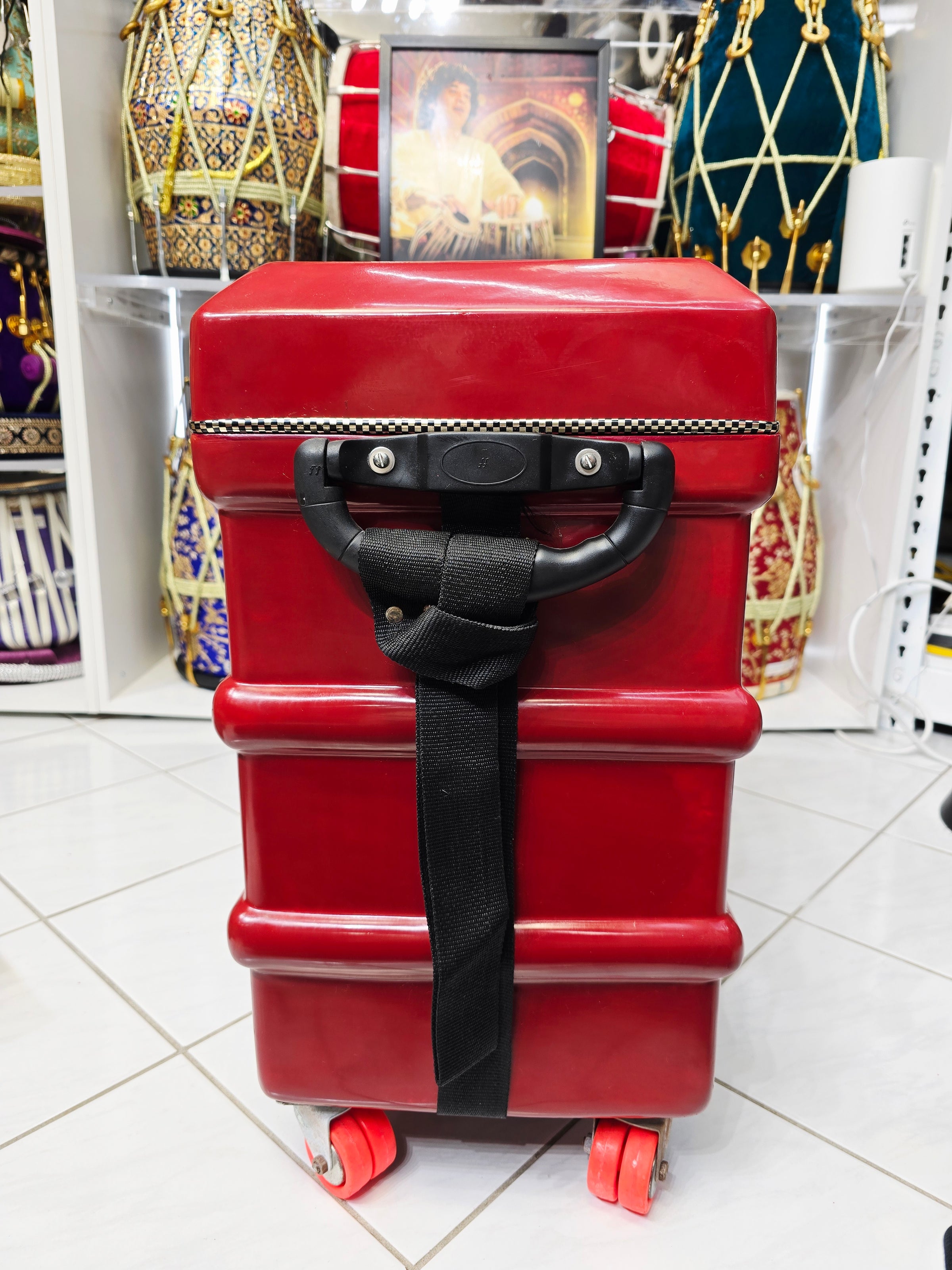 The Crimson Guardian harmonium case is designed to offer superior protection and ease of transport for your scale-changer harmonium. This robust case features four 360-degree wheels for effortless maneuverability, along with side handles and a top handle for versatile carrying options. The buckles provide secure closure, while a metal locking mechanism adds an extra layer of security. Inside, the case is lined with a lush felt interior, ensuring your instrument is cushioned and protected from any damage. Despite minor cosmetic defects, the Crimson Guardian stands out with its vibrant red finish, combining durability with a touch of style for both practicality and elegance.