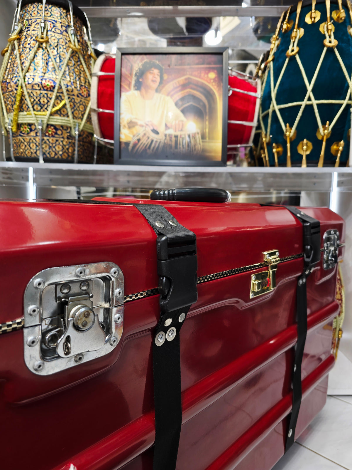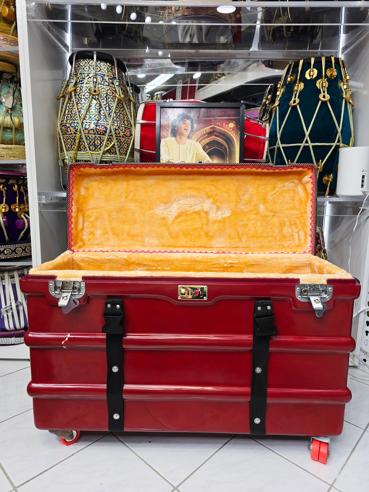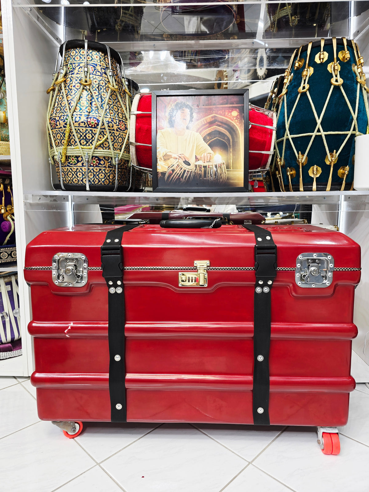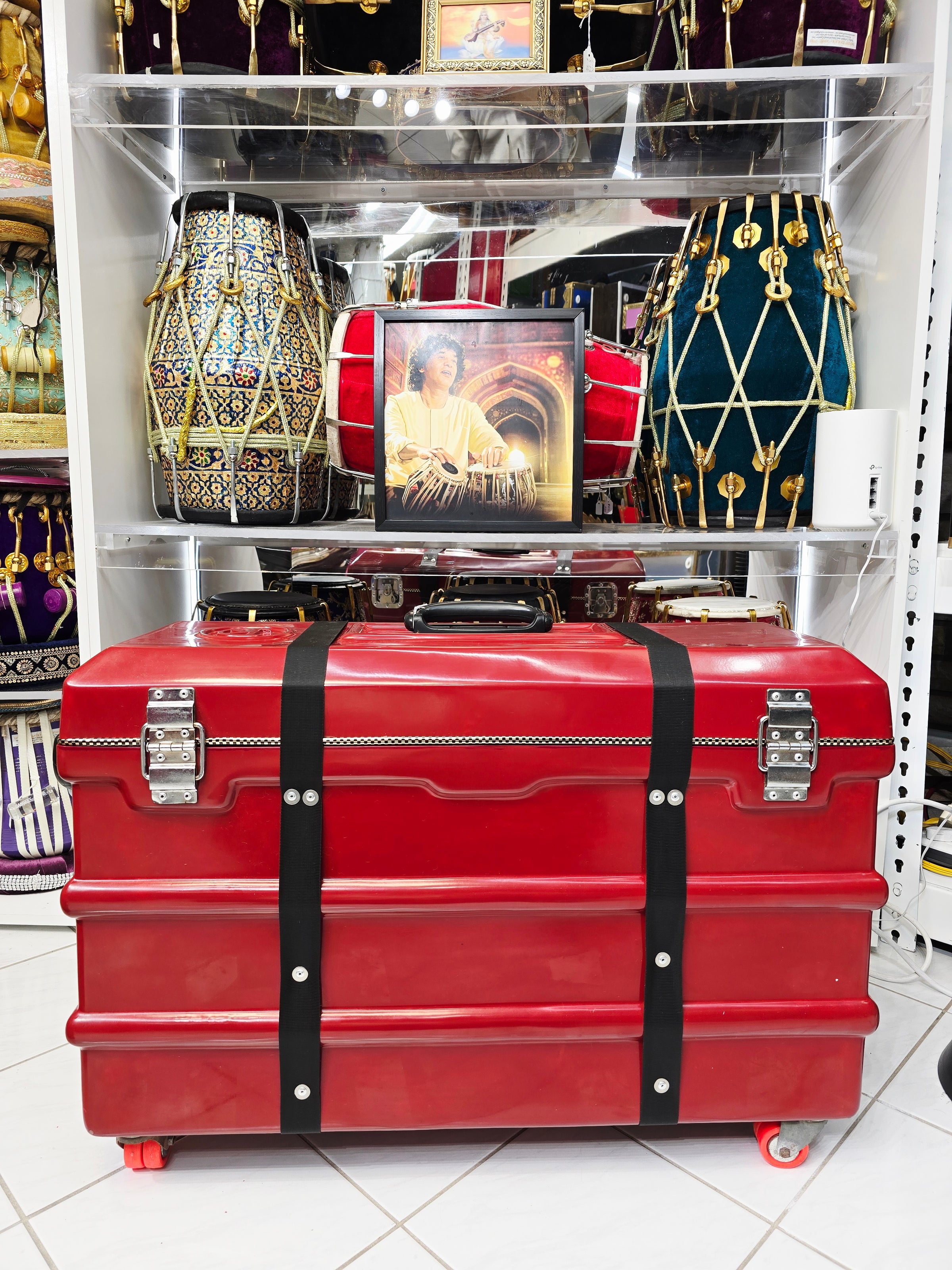 The Crimson Guardian harmonium case is designed to offer superior protection and ease of transport for your scale-changer harmonium. This robust case features four 360-degree wheels for effortless maneuverability, along with side handles and a top handle for versatile carrying options. The buckles provide secure closure, while a metal locking mechanism adds an extra layer of security. Inside, the case is lined with a lush felt interior, ensuring your instrument is cushioned and protected from any damage. Despite minor cosmetic defects, the Crimson Guardian stands out with its vibrant red finish, combining durability with a touch of style for both practicality and elegance.