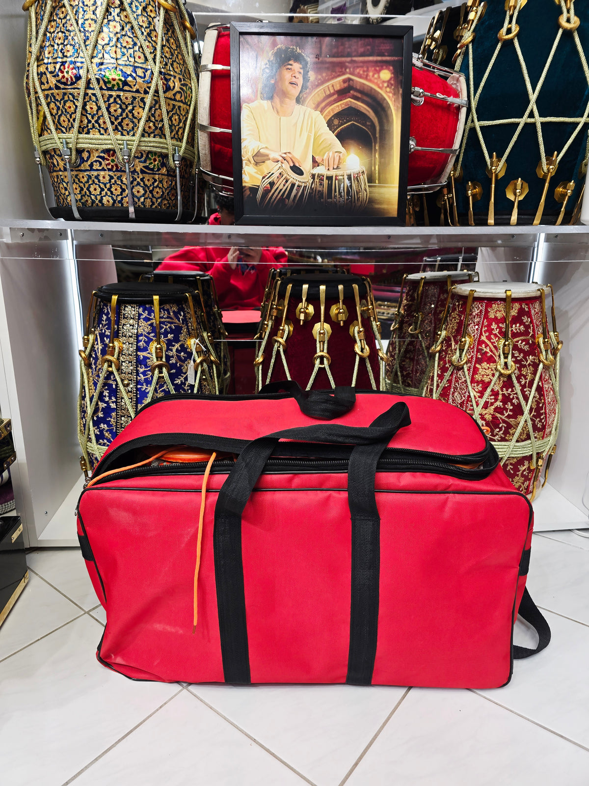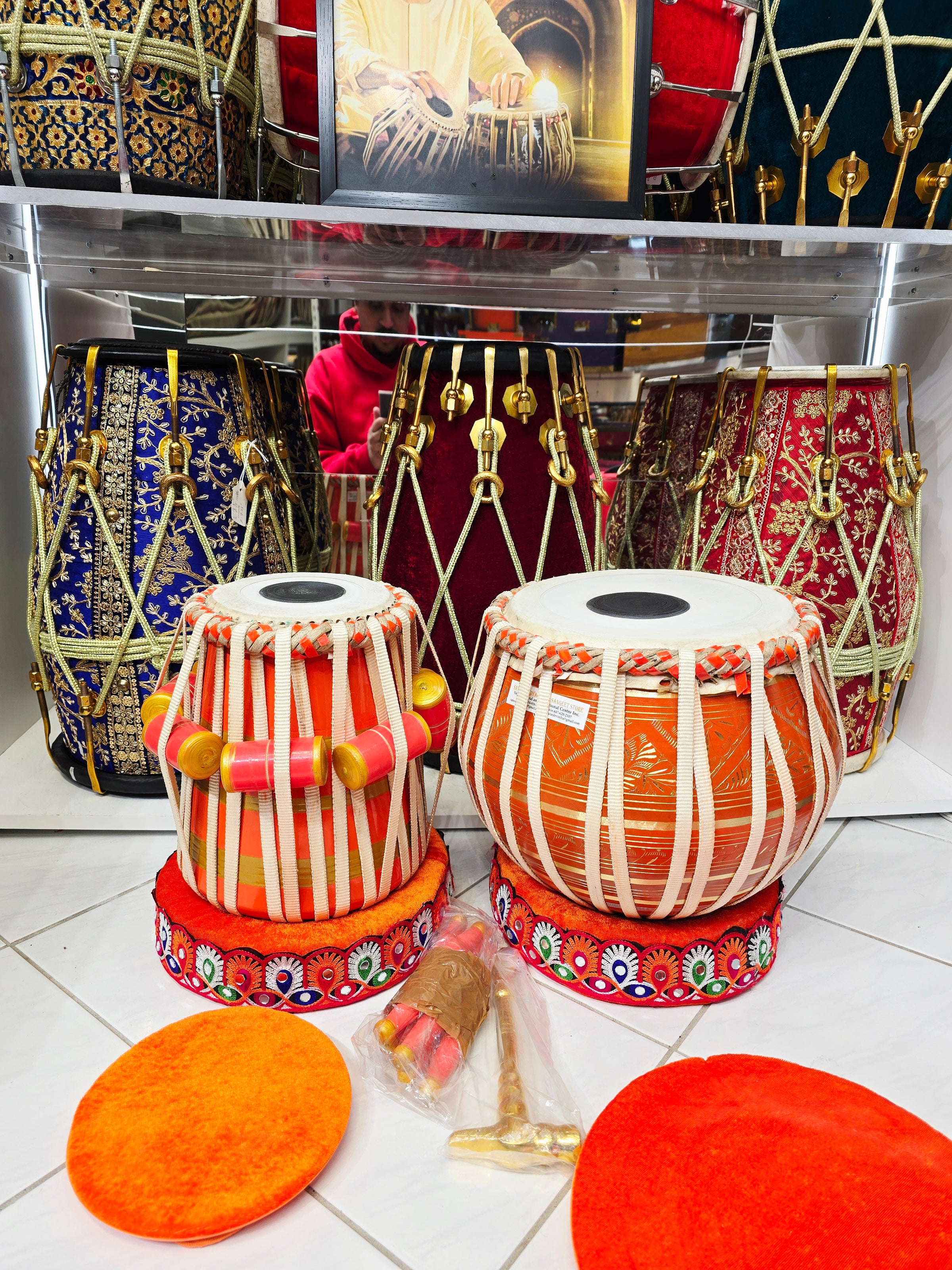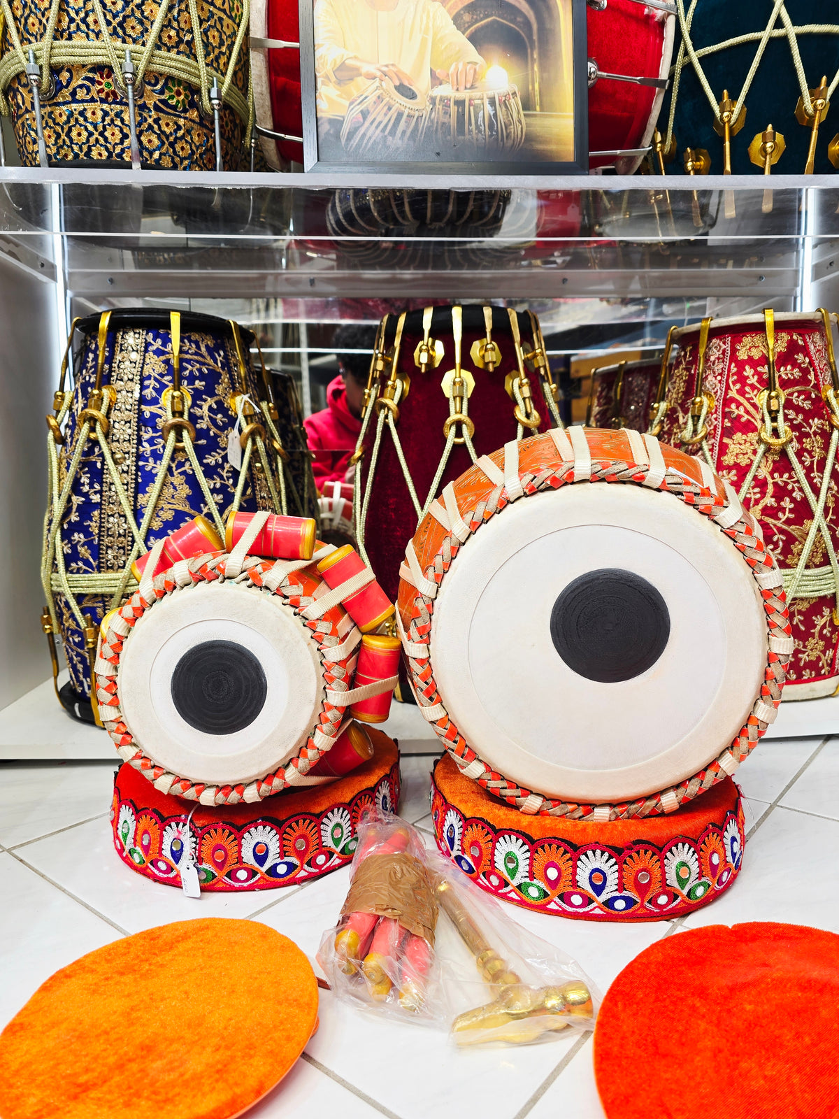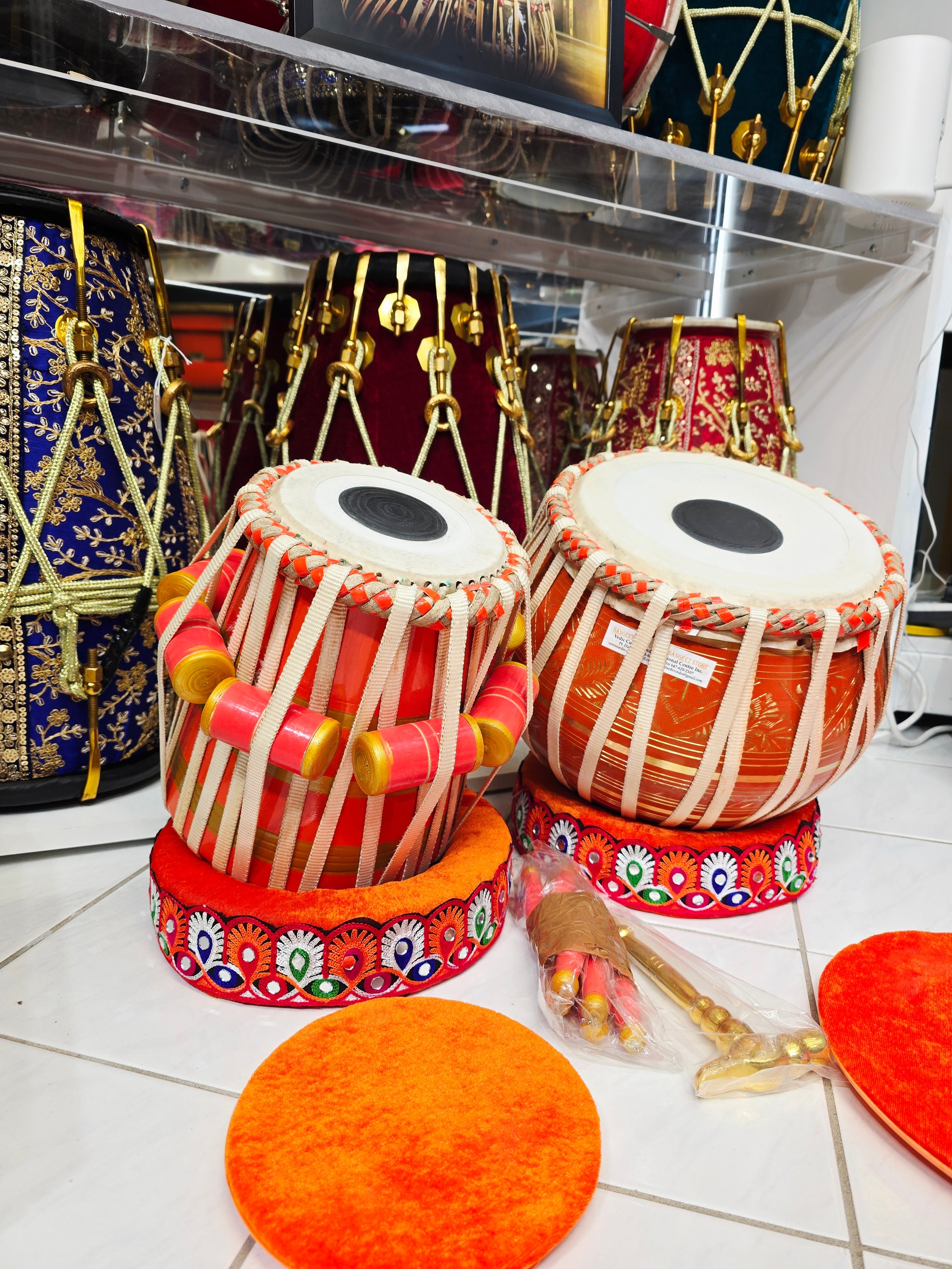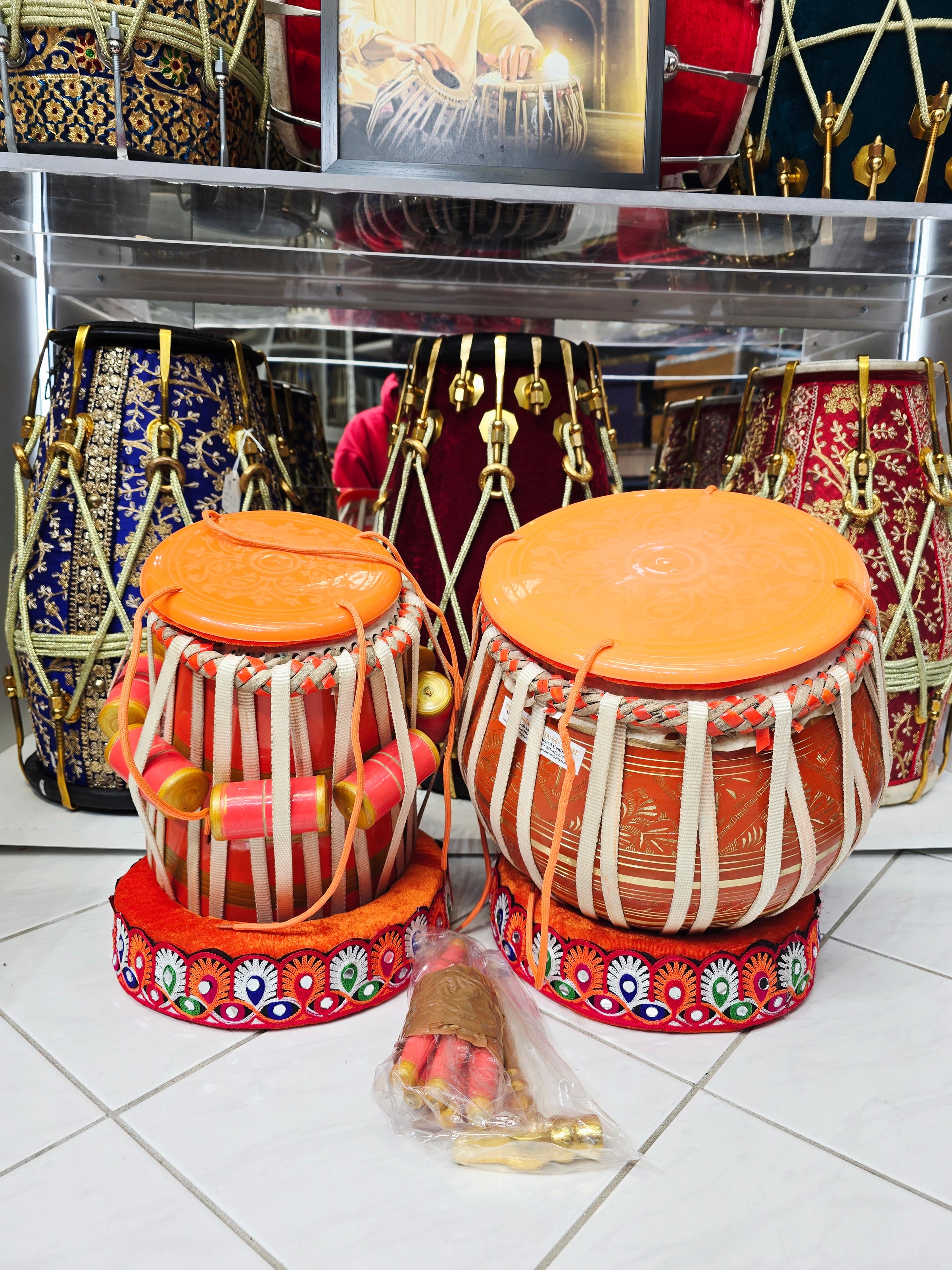 The Kesari Viraasat™ Tabla Set pairs a 5.75″ C♯ / D red sheesham dayan with a 9.25″ heavy copper bayan weighing 3.5 kg, offering clear, controlled articulation on the dayan and deep, authoritative bass from the bayan. Finished in a bold orange painted and engraved design and fitted with white nylon strapwork for durability and tuning stability, this set combines strong visual presence with reliable, performance-ready sound for serious students and advancing players.