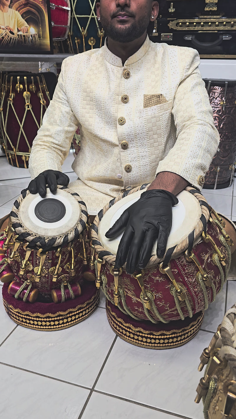 The Laal Swarna™ Tabla Set features a 5.5″ F-scale red sheesham dayan paired with a 9.25″ copper bayan, delivering a crisp, higher-pitched dayan response balanced by warm, rounded bass tones. Wrapped in an elegant red and gold sherwani fabric and finished with gold bolt hardware, this bolted tabla set blends refined visual artistry with stable tuning and confident playability. Designed for players who appreciate both sound and presentation, it is well suited for advancing students, stage use, and performers seeking a tabla set with strong tonal presence and striking traditional aesthetics.