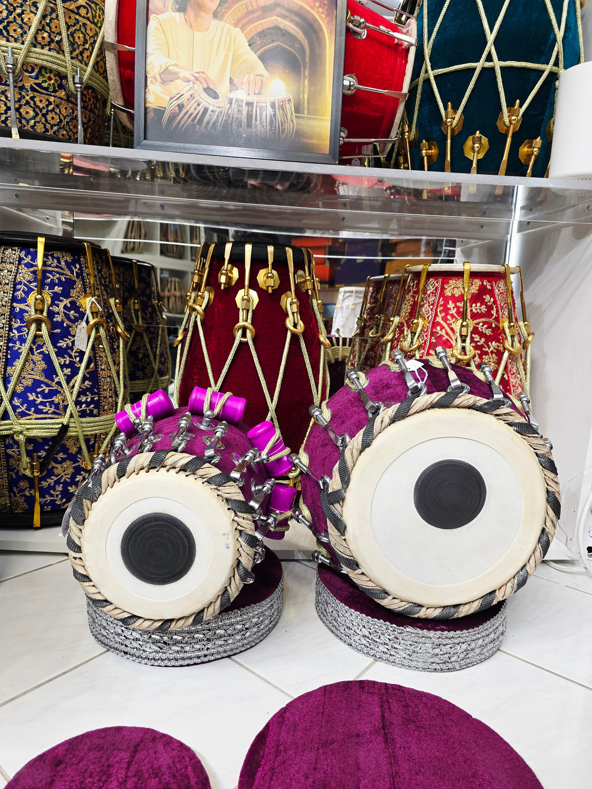 The Neelam Viraaj™ Tabla Set pairs a 6″ D / D♯ red sheesham dayan with a 9.25″ heavy copper bayan weighing 6 kg, producing an exceptionally rich, balanced tone with crisp articulation on the dayan and deep, commanding bass response from the bayan. Finished in a dark purple velvet wrap and reinforced with bolted construction, this set offers outstanding tuning stability, projection, and tonal depth. Built for serious players and performers, it delivers both refined musicality and bold stage presence in a confident, performance-ready instrument.