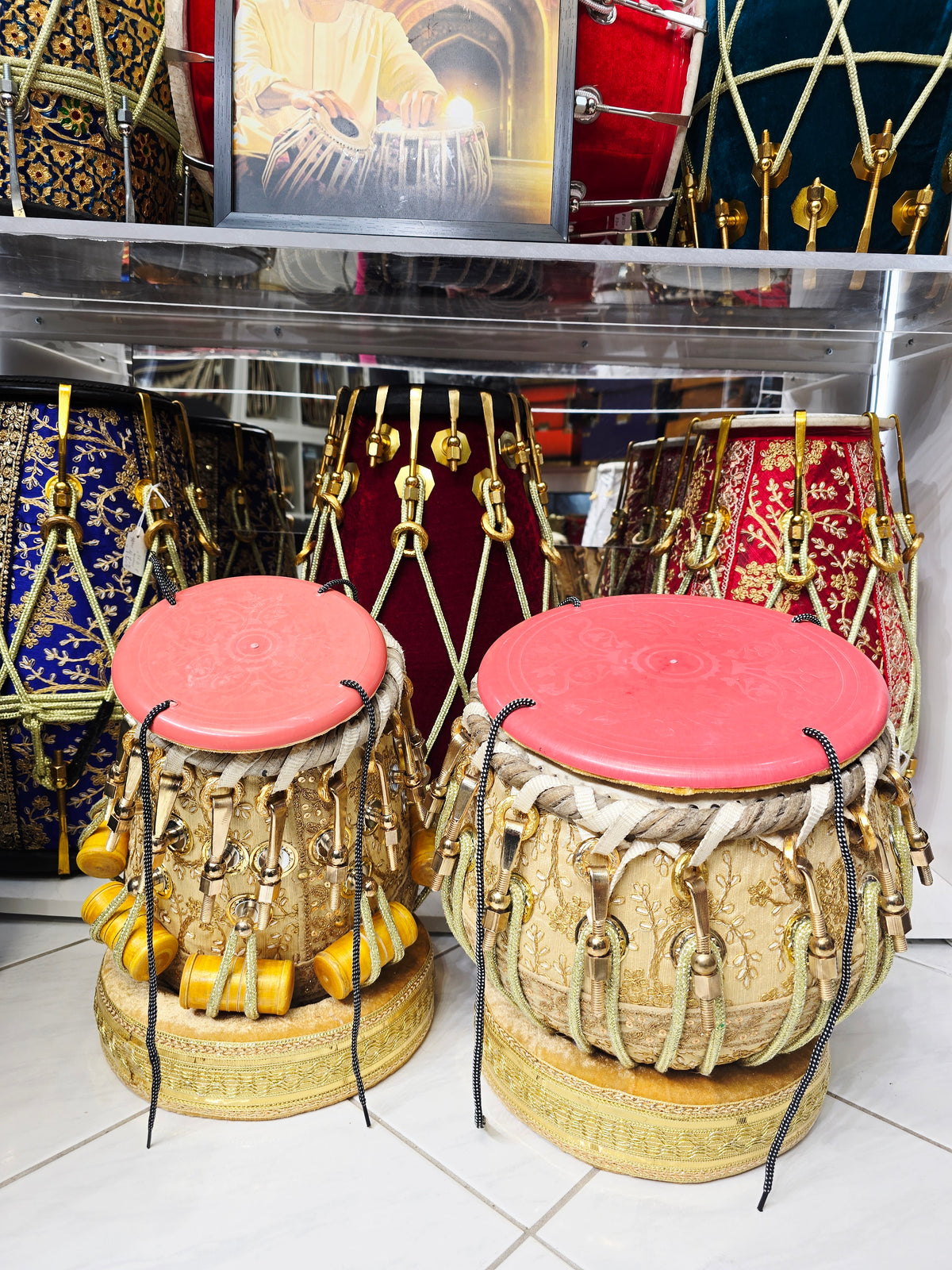 The Sunehri Raag tabla set brings together refined craftsmanship and radiant aesthetics, featuring a 5.5" Red Sheesham dayan tuned in the D/D# range, paired with a 9.25" handcrafted copper bayan dressed in a stunning golden sherwani finish with bolted straps for durability. The dayan offers a bright, articulate tone with excellent balance, while the bayan resonates with depth and weight, producing a rounded bass response. With its elegant golden motif and musical versatility, this set is ideal for stage, studio, or serious practice—where sound meets style in perfect harmony.