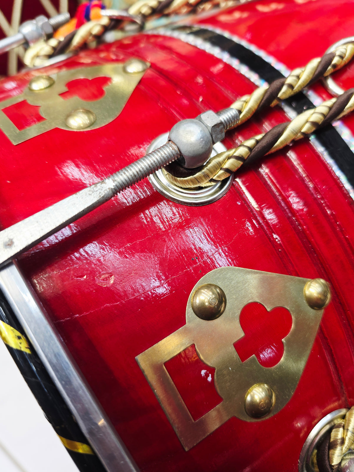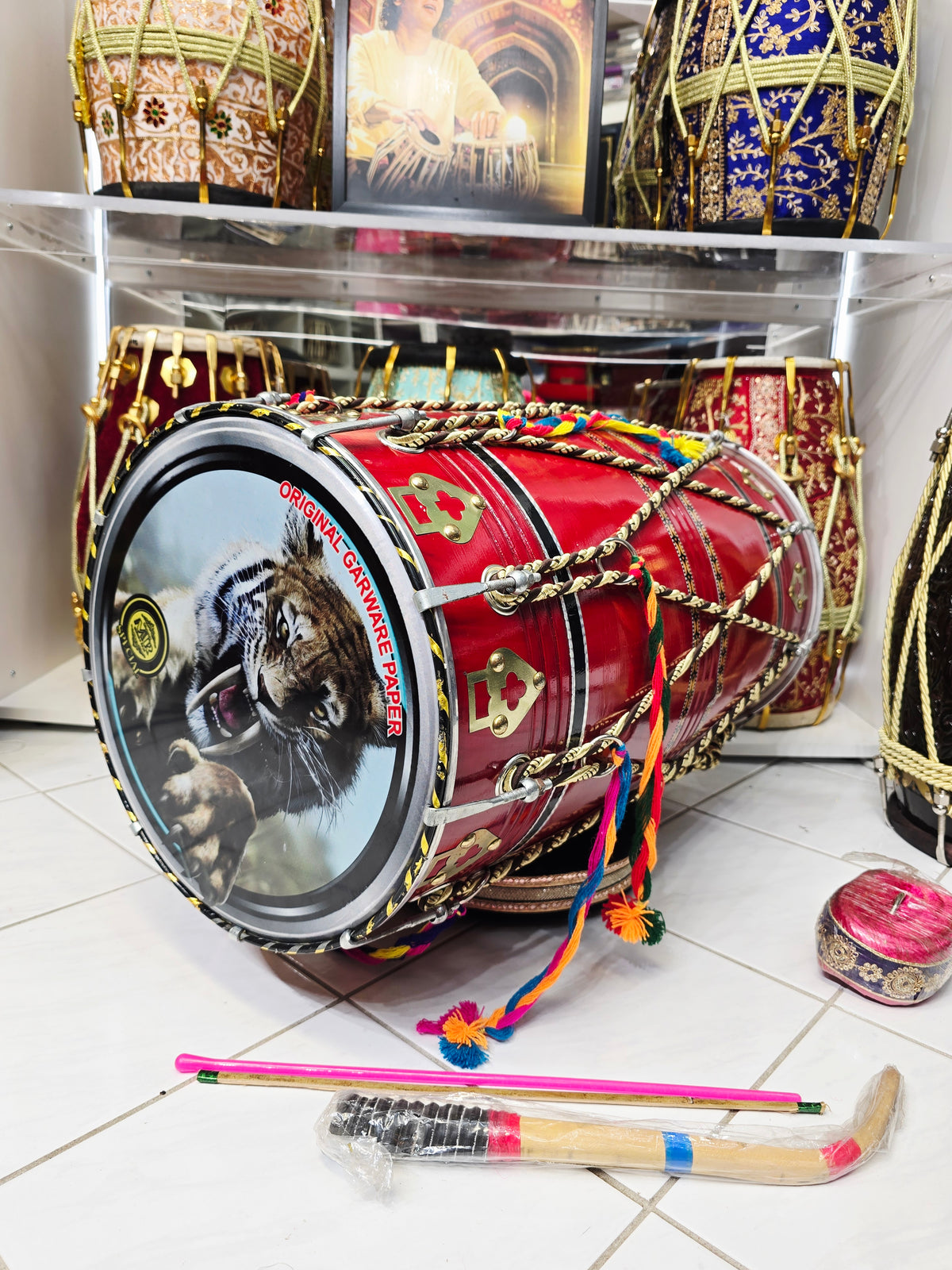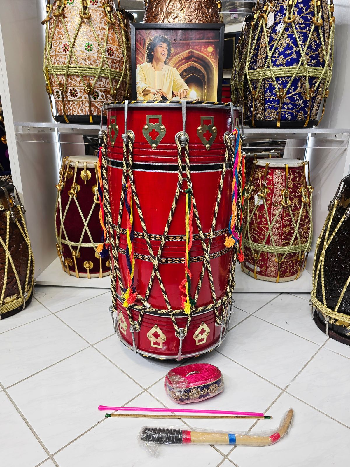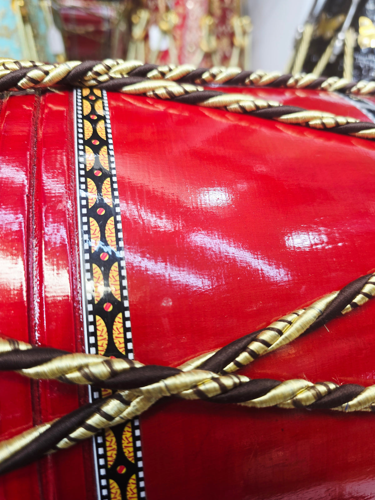 Lalvaaj is a commanding 25″ long Punjabi dhol made from mango wood, finished in a glossy red lacquer with golden rope accents and vibrant multicolor tassels. Built for power and projection, its size delivers a booming bass and sharp treble tones, but this model comes fitted with a plastic bass skin—giving it a punchier, more synthetic low-end compared to traditional dhols. While it also carries minor cosmetic defects, these do not affect durability or playability. A solid option for players seeking an affordable, visually striking dhol with strong stage presence and reliable function.