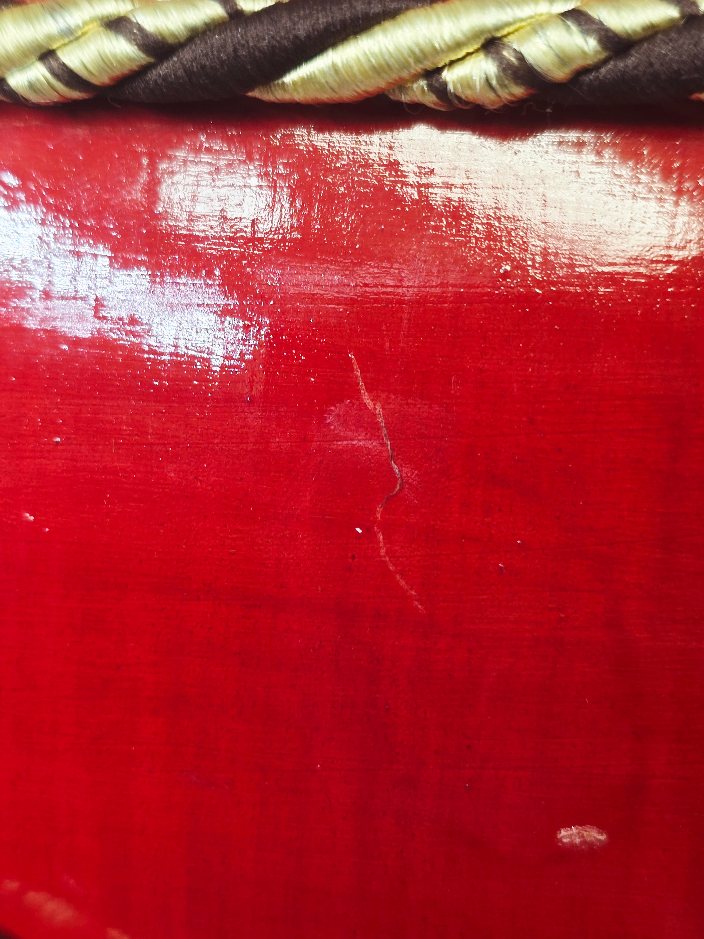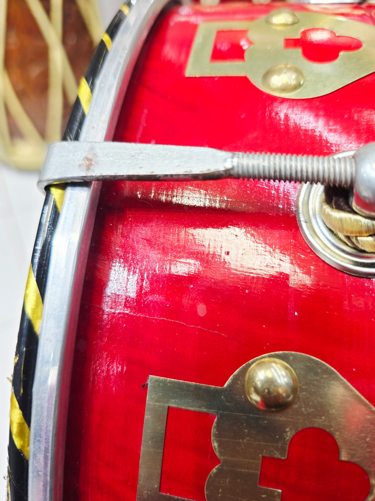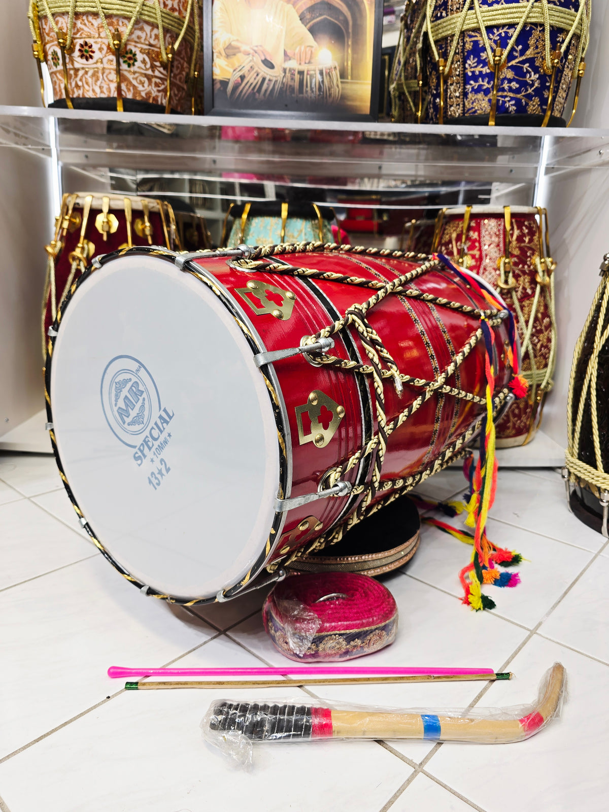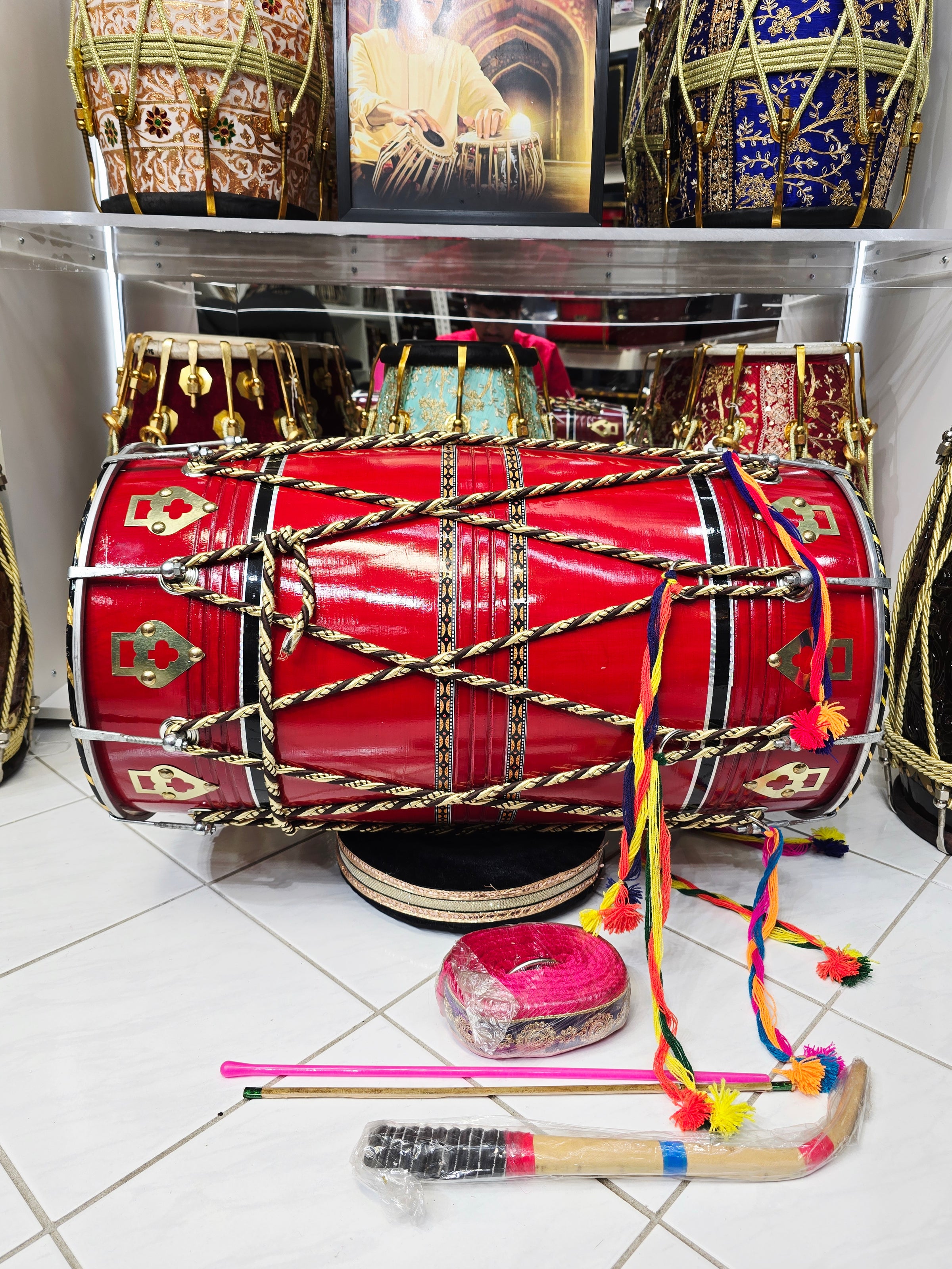 Lalvaaj — 25" Long, Red Painted Mango Wood Punjabi Dhol *Minor Cosmetic Defects *Plastic Bass Skin