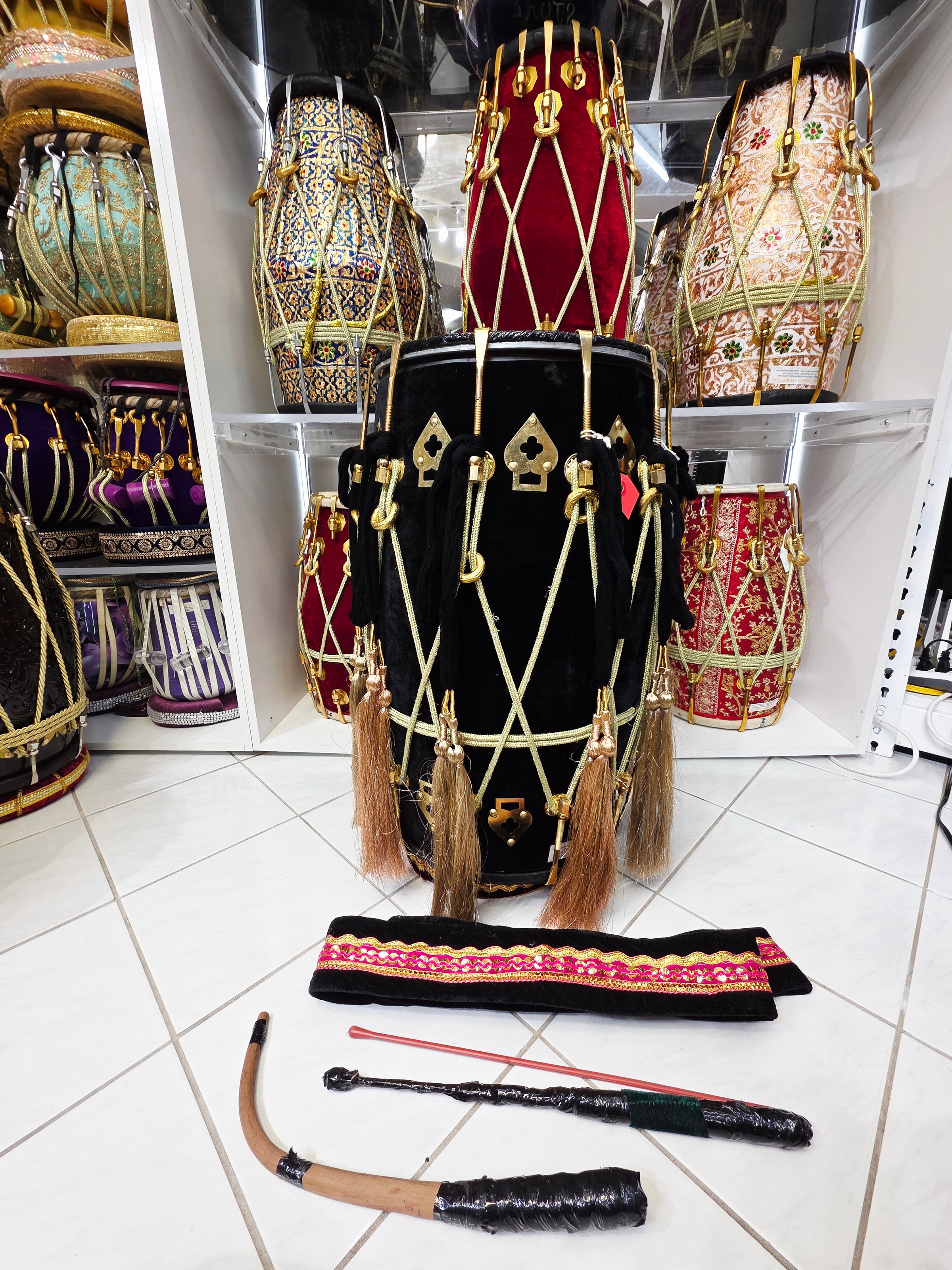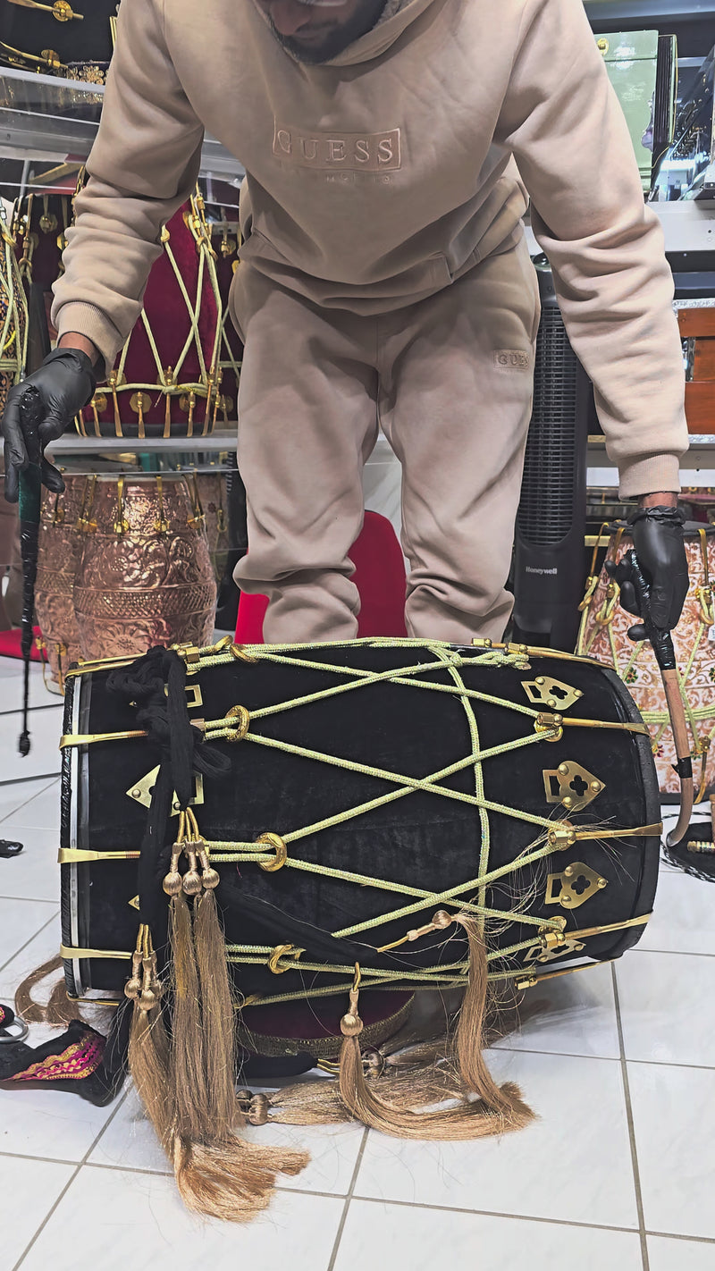 The Midnight Raftar Punjabi Dhol features a sleek black velvet wrap, producing a striking contrast against its polished fittings. Its tones are powerful and balanced, offering a punchy bass and crisp treble that cut effortlessly through any crowd. Perfect for dholis who want both performance impact and premium visual appeal, this drum stands out in any event or stage setting.