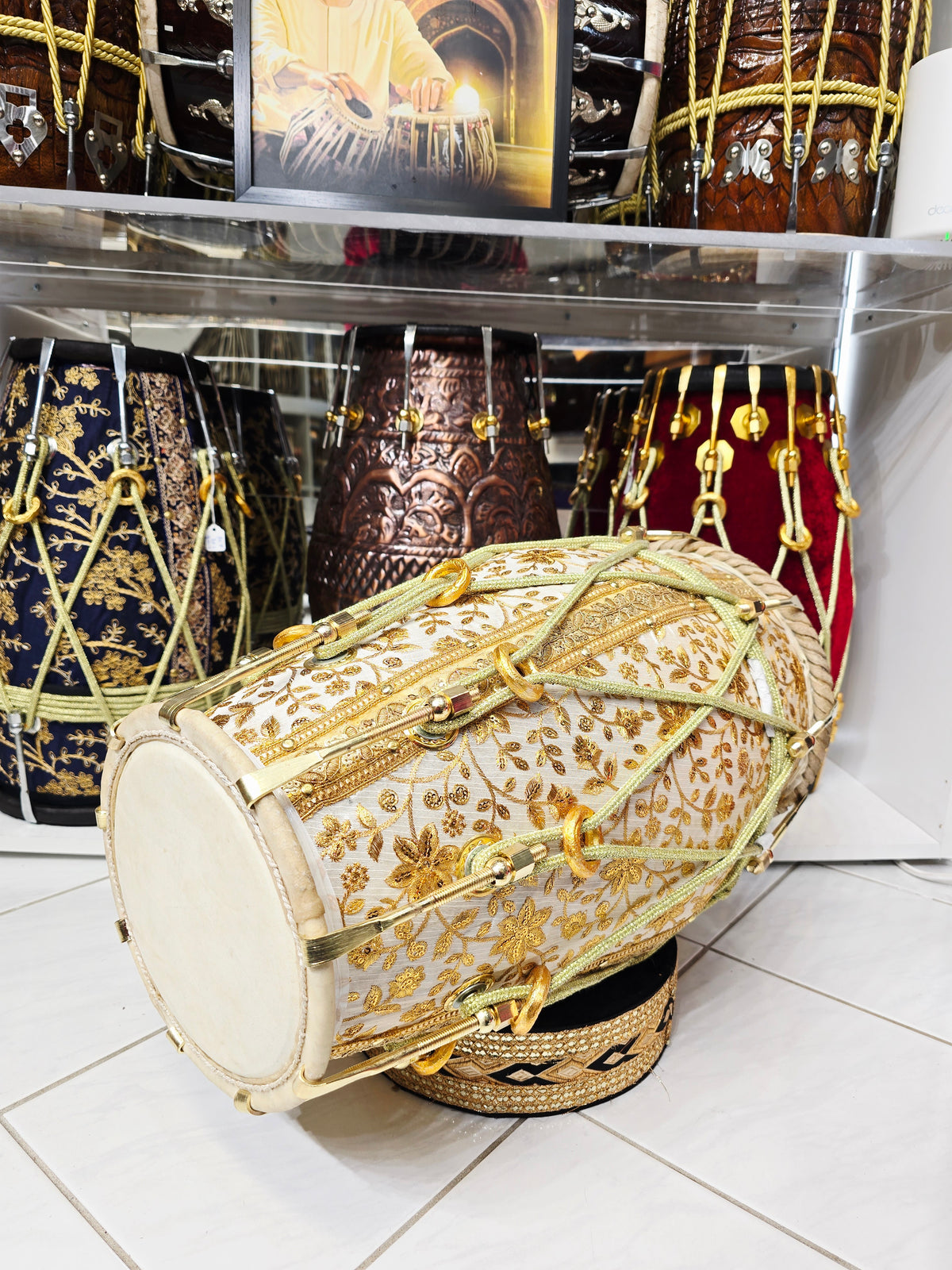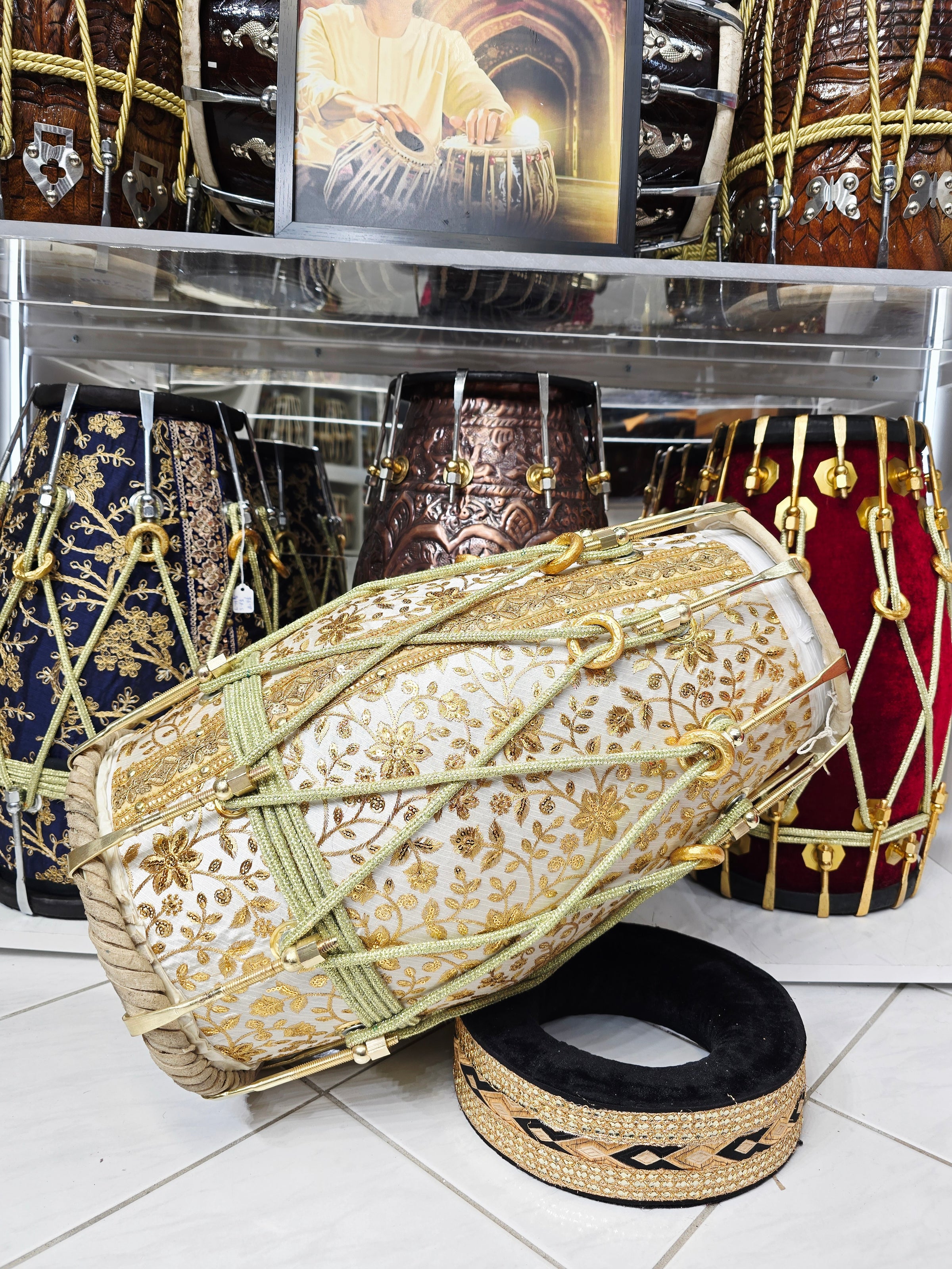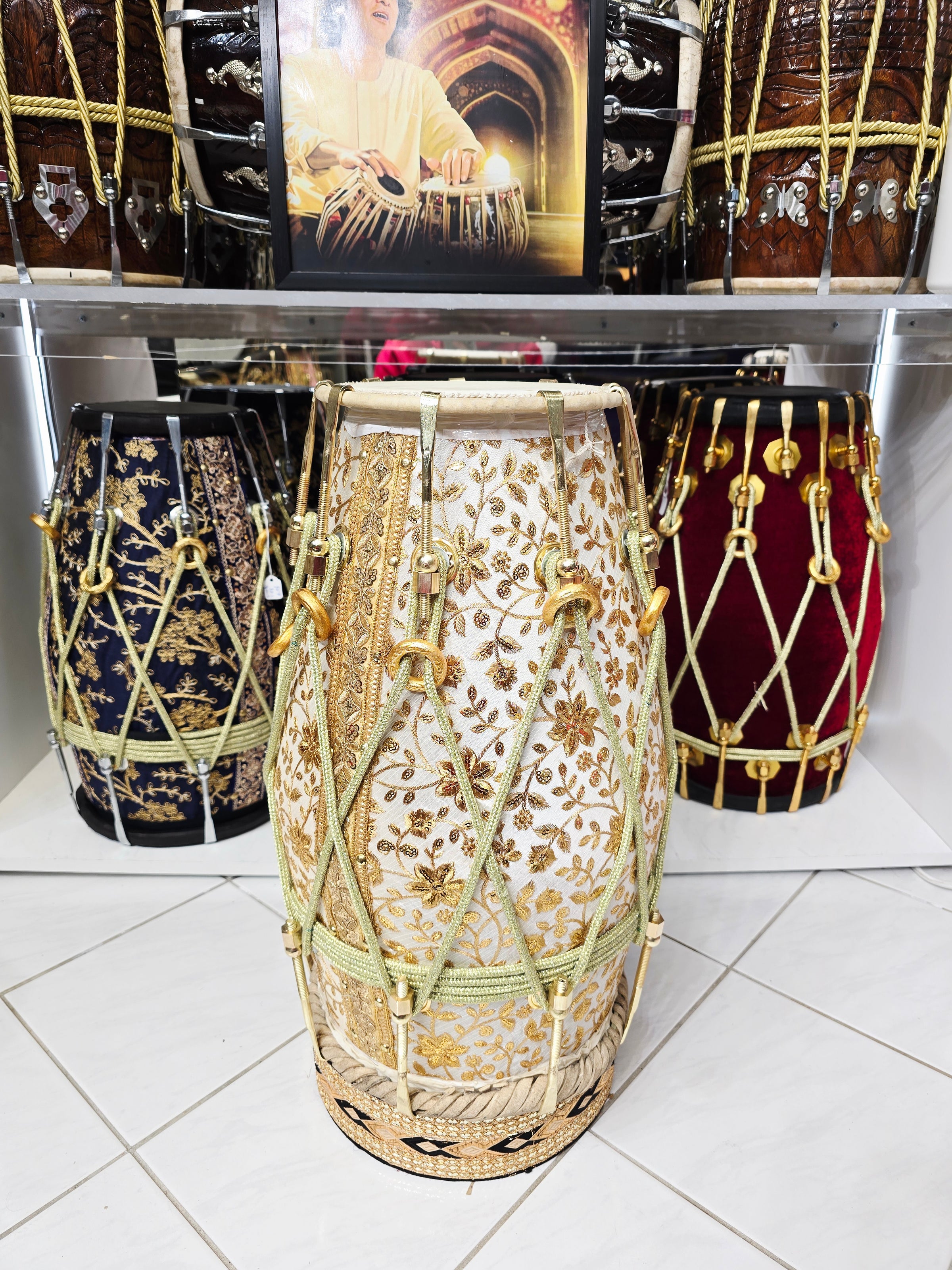 The Aurelian Noor is a statement dholak built around a solid red sheesham wood shell, wrapped in an elegant gold-on-white sherwani fabric featuring dense floral embroidery. The contrast between the warm wood core and the luminous textile gives this piece a clean, ceremonial presence that feels rich without being loud.