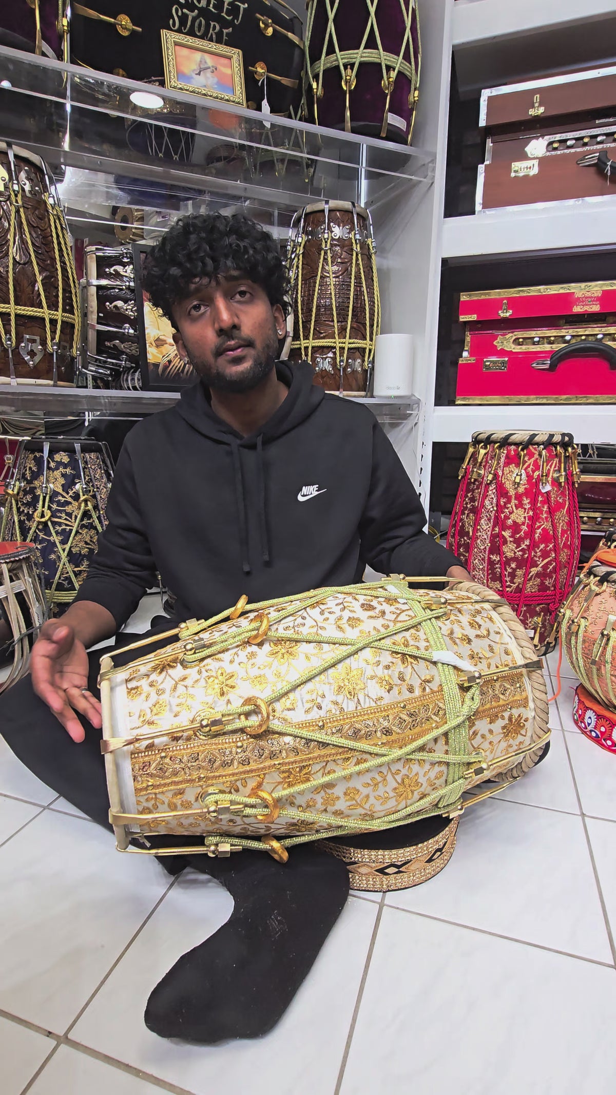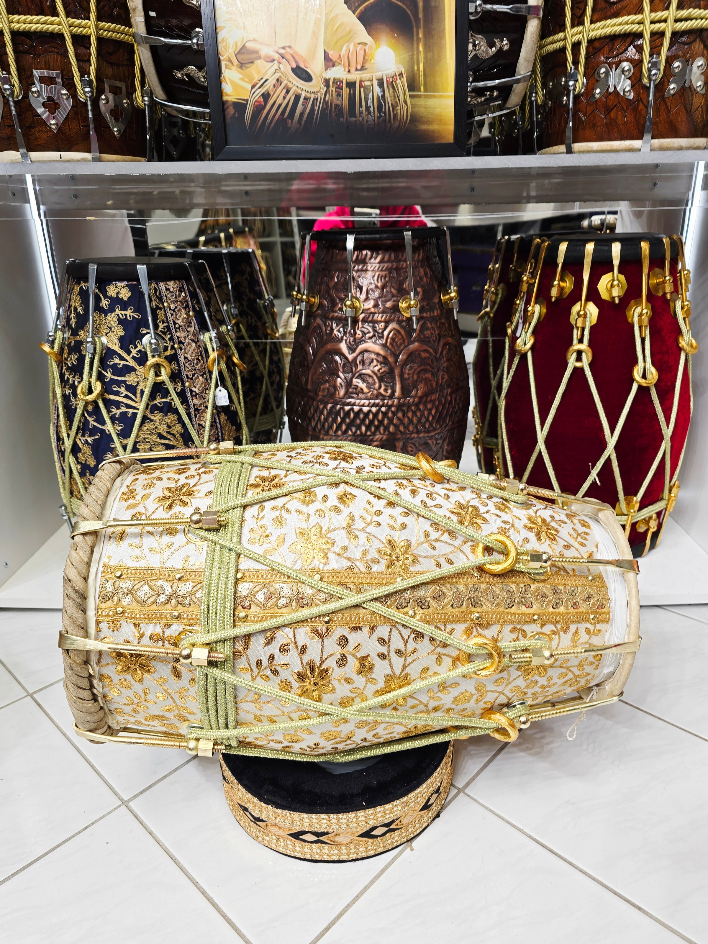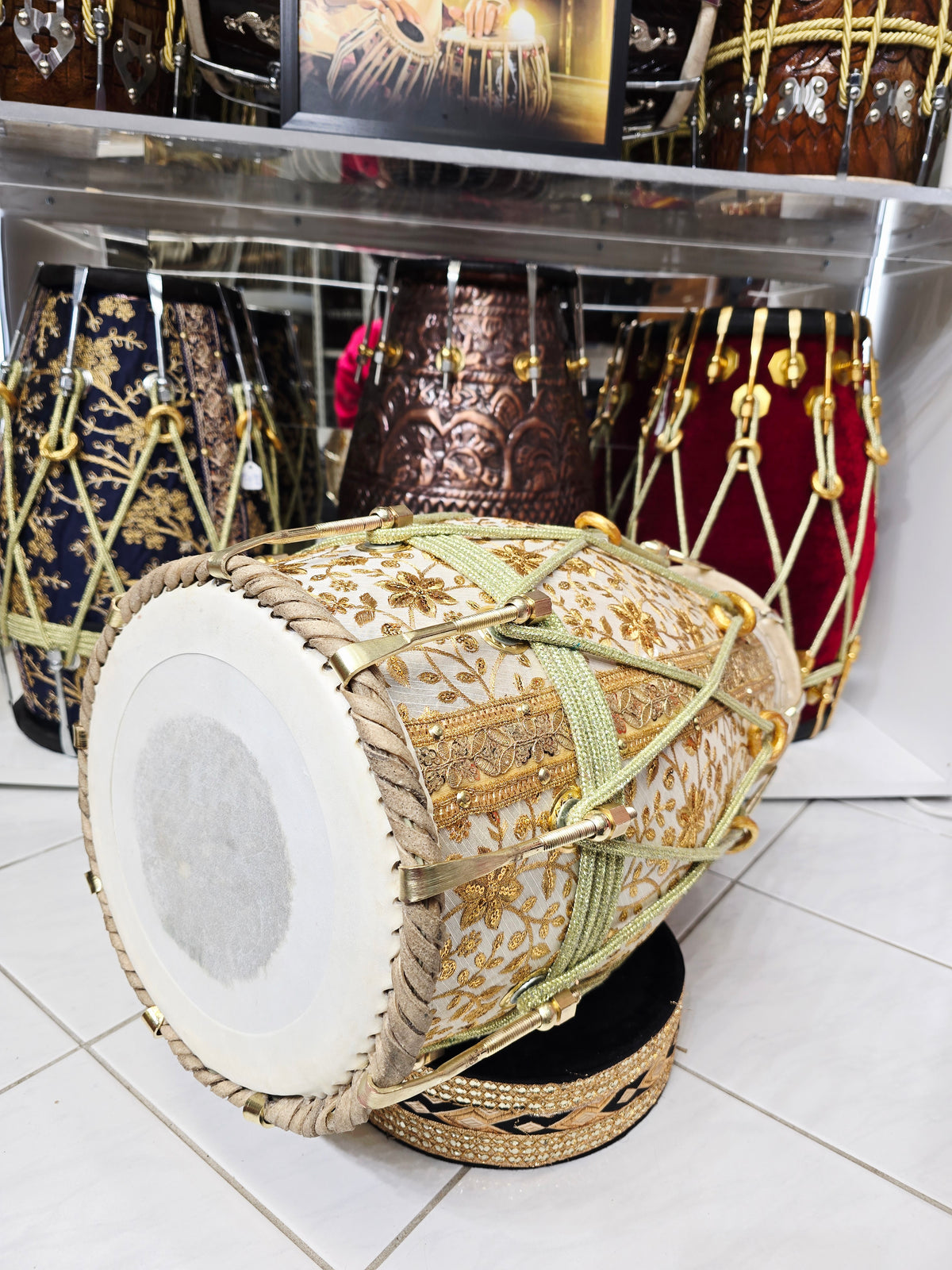 The Aurelian Noor is a statement dholak built around a solid red sheesham wood shell, wrapped in an elegant gold-on-white sherwani fabric featuring dense floral embroidery. The contrast between the warm wood core and the luminous textile gives this piece a clean, ceremonial presence that feels rich without being loud.
