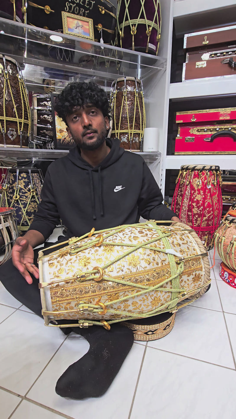 Finished with gold rope lacing and fittings, this dholak balances traditional craftsmanship with a high-end aesthetic ideal for weddings, stage performances, religious events, and formal ensembles. The sherwani wrap offers visual depth while the sheesham body delivers a full, resonant character suitable for both bass-driven rhythms and articulate highs.