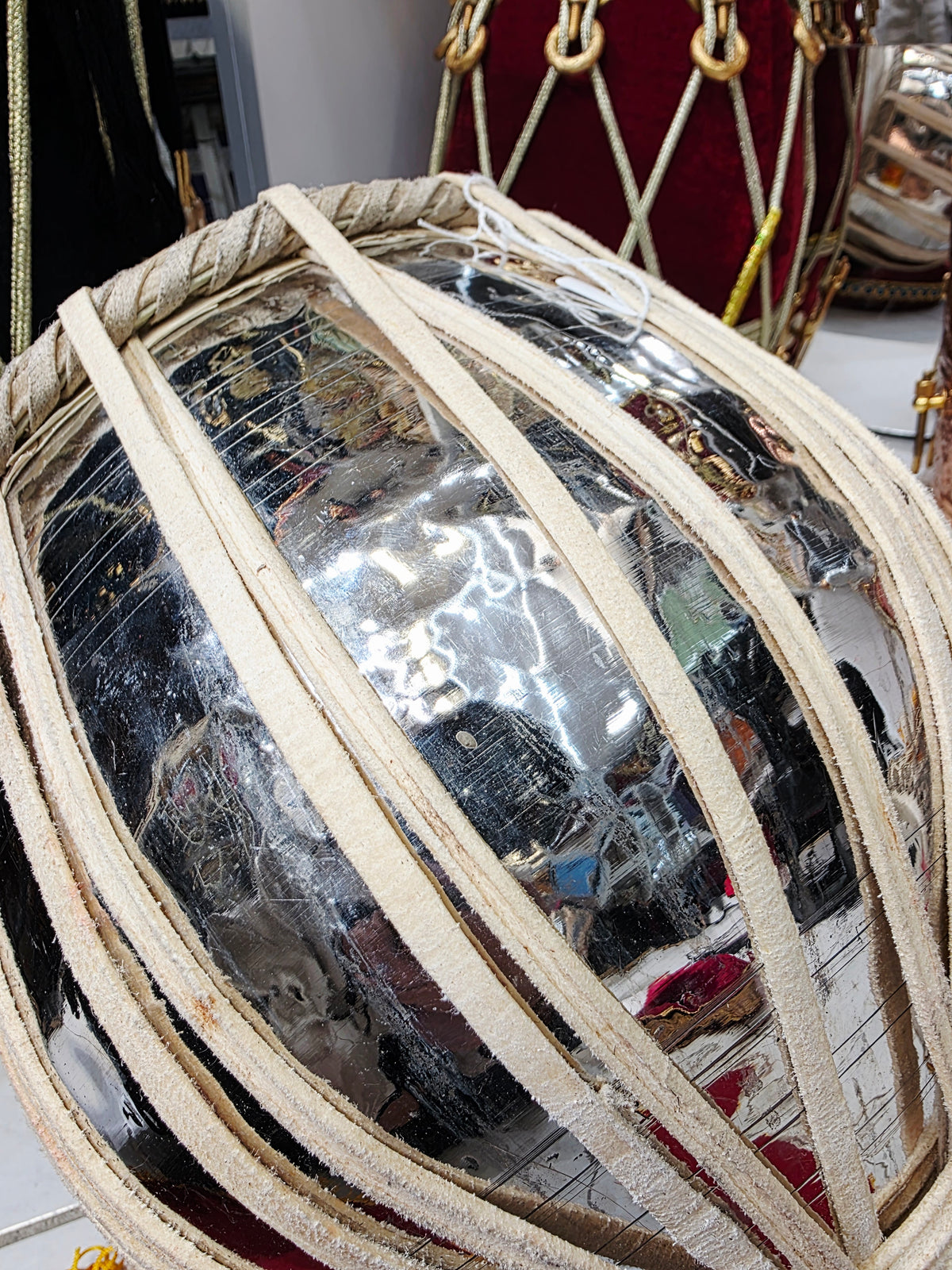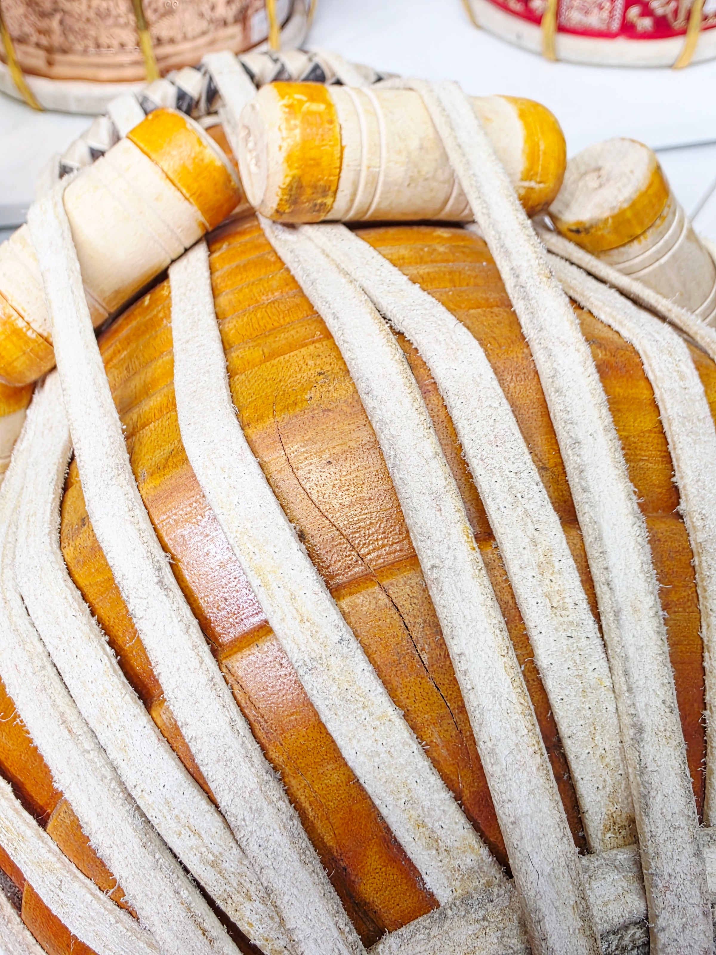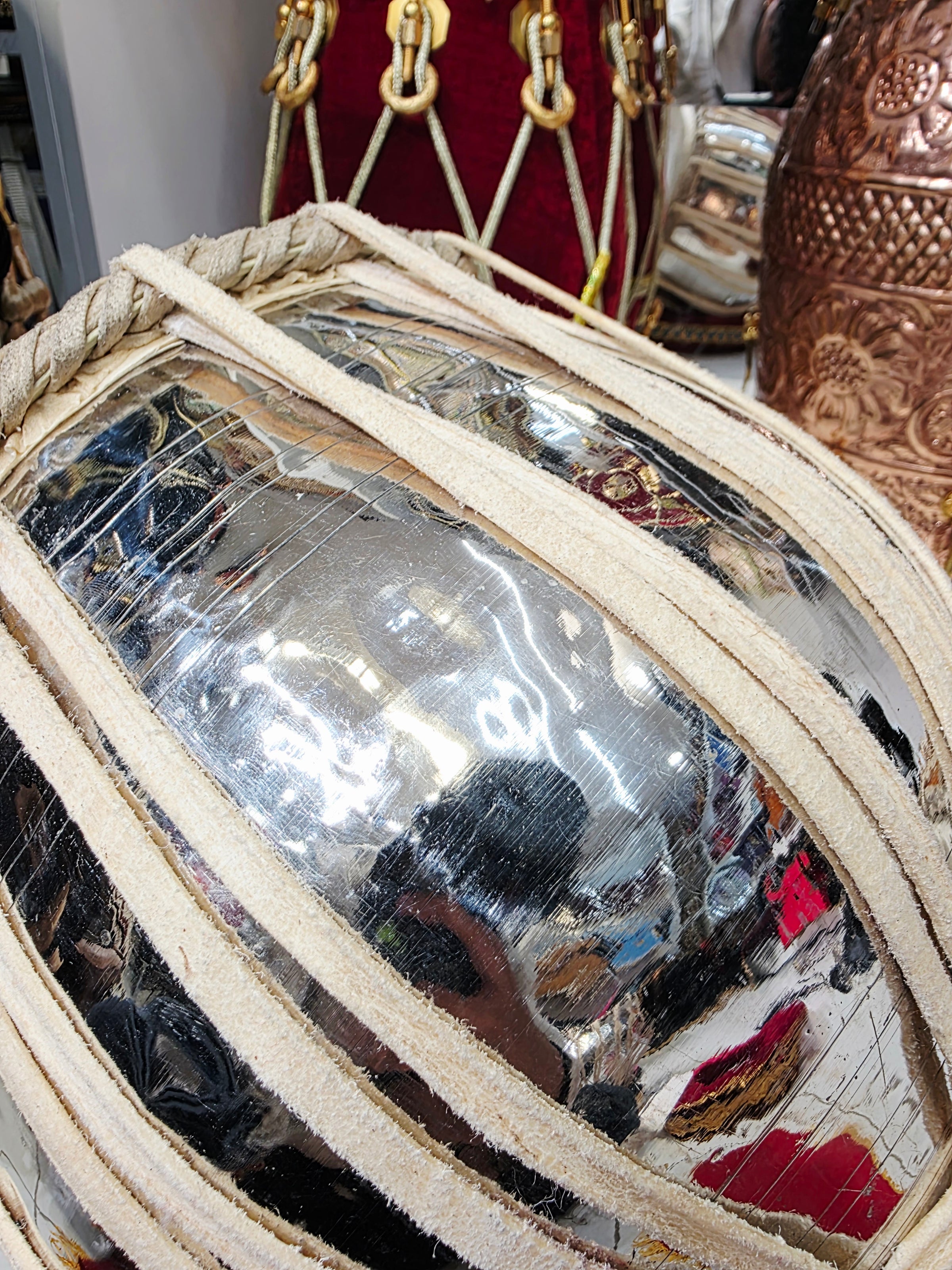 This refurbished student-quality ShikshaDhara Tabla Set features a 5.25" C#/D wooden dayan with minor cosmetic cracks and a 9.5" steel bayan showing general finish wear, giving the set a visibly imperfect but character-rich appearance. All defects are purely cosmetic and do not affect tuning, resonance, or structural integrity. Despite the aged exterior, the set delivers crisp dayan clarity and warm bayan depth, making it an excellent value choice for students, beginners, and daily riyaaz players who prioritize sound over aesthetics.
