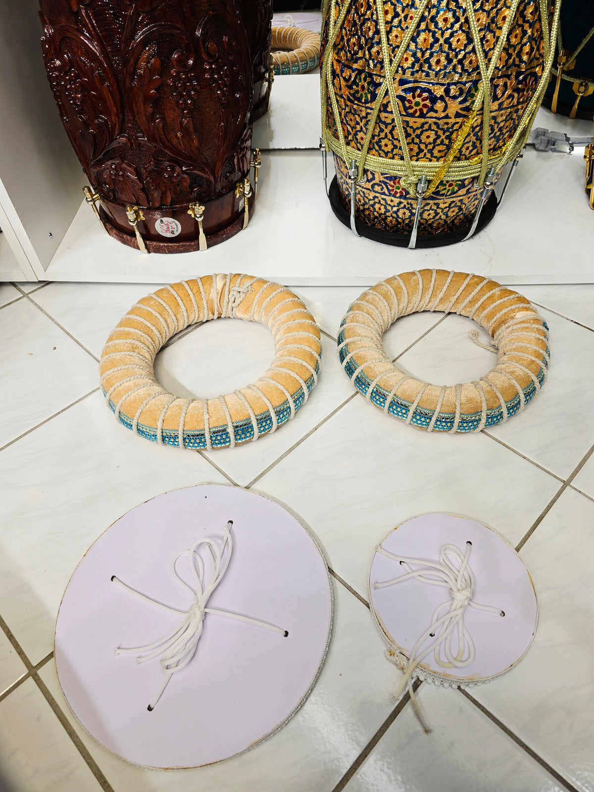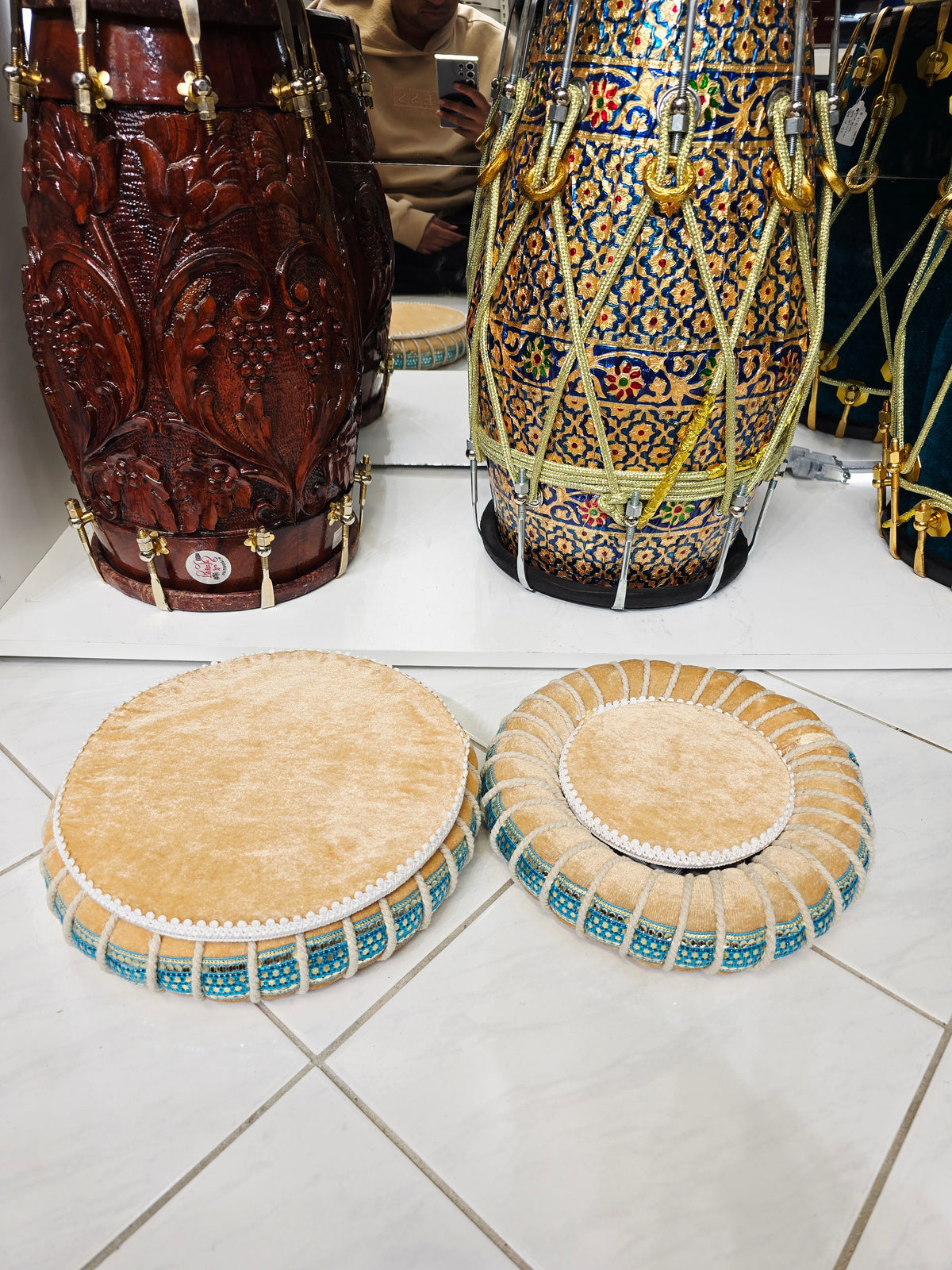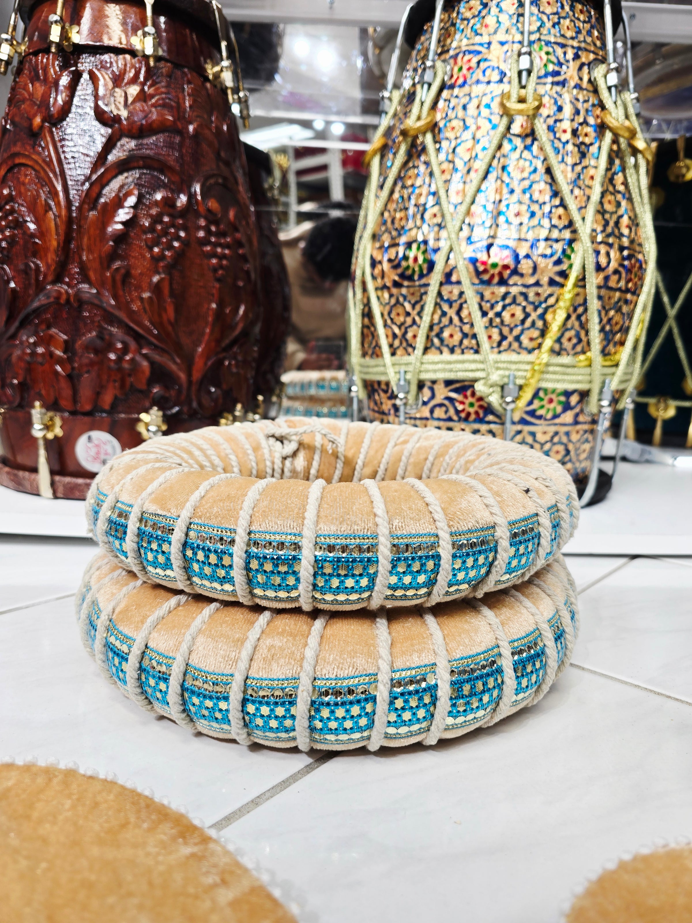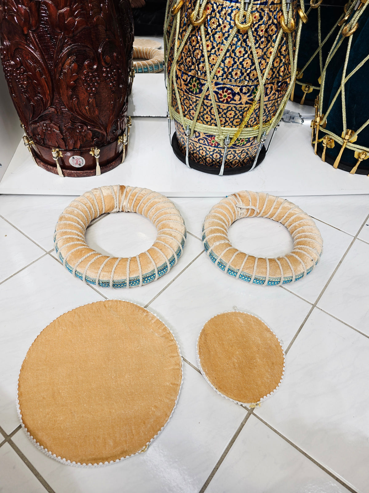The Taal Shweta (Pure Rhythm) set offers a graceful blend of soft beige-gold velvet and shimmering turquoise border accents, creating a bright and serene aesthetic. This set includes two padded support rings and matching top covers, secured with white lace trim and wrapped with durable thread. Subtle yet striking, it's ideal for temple settings, classical performances, or as a neutral base for vibrant tabla designs.