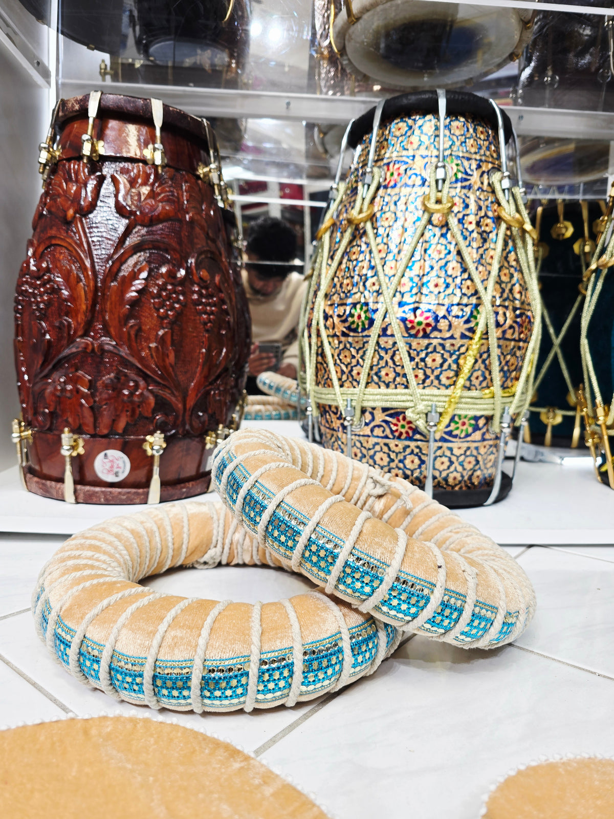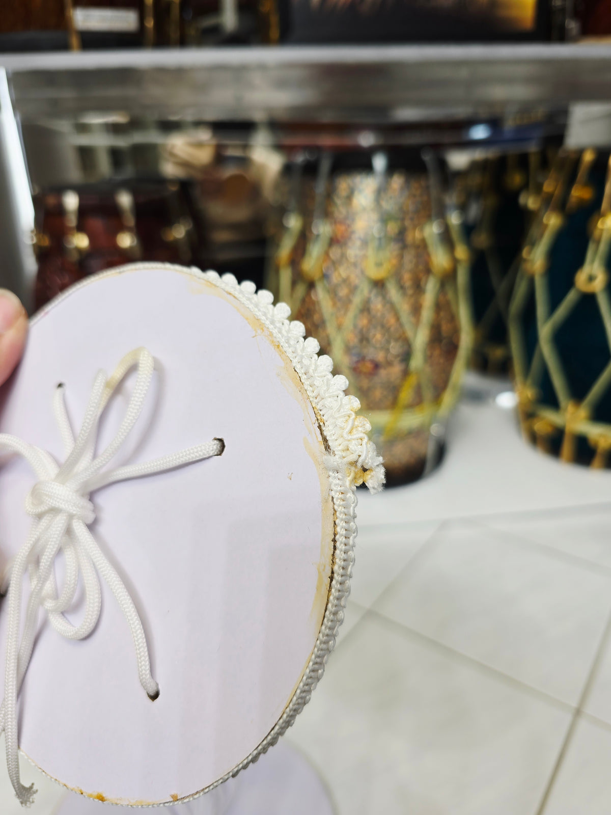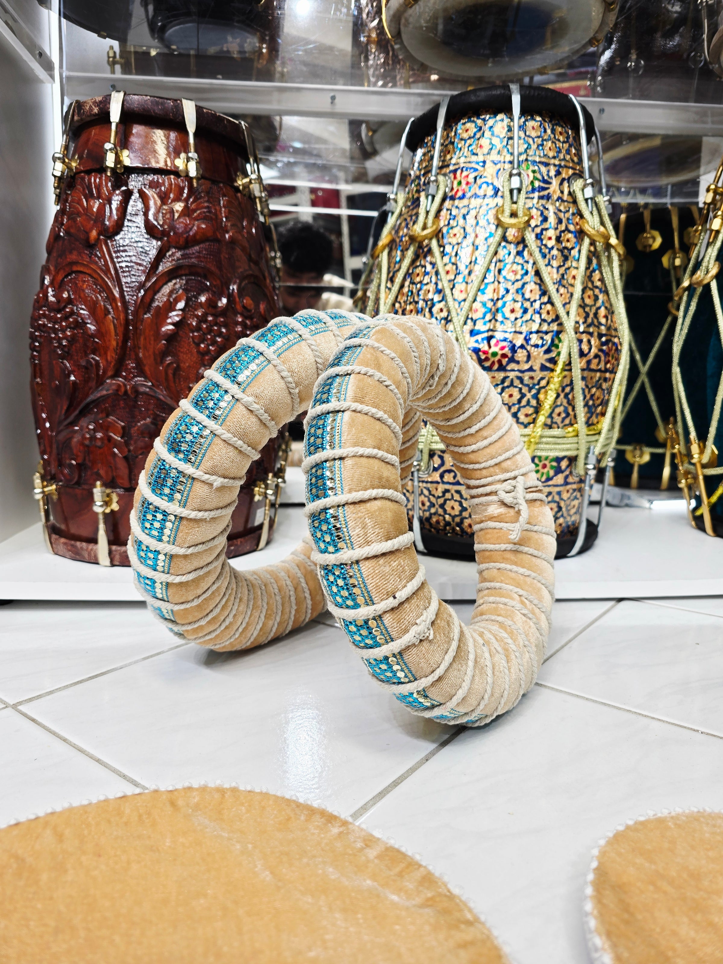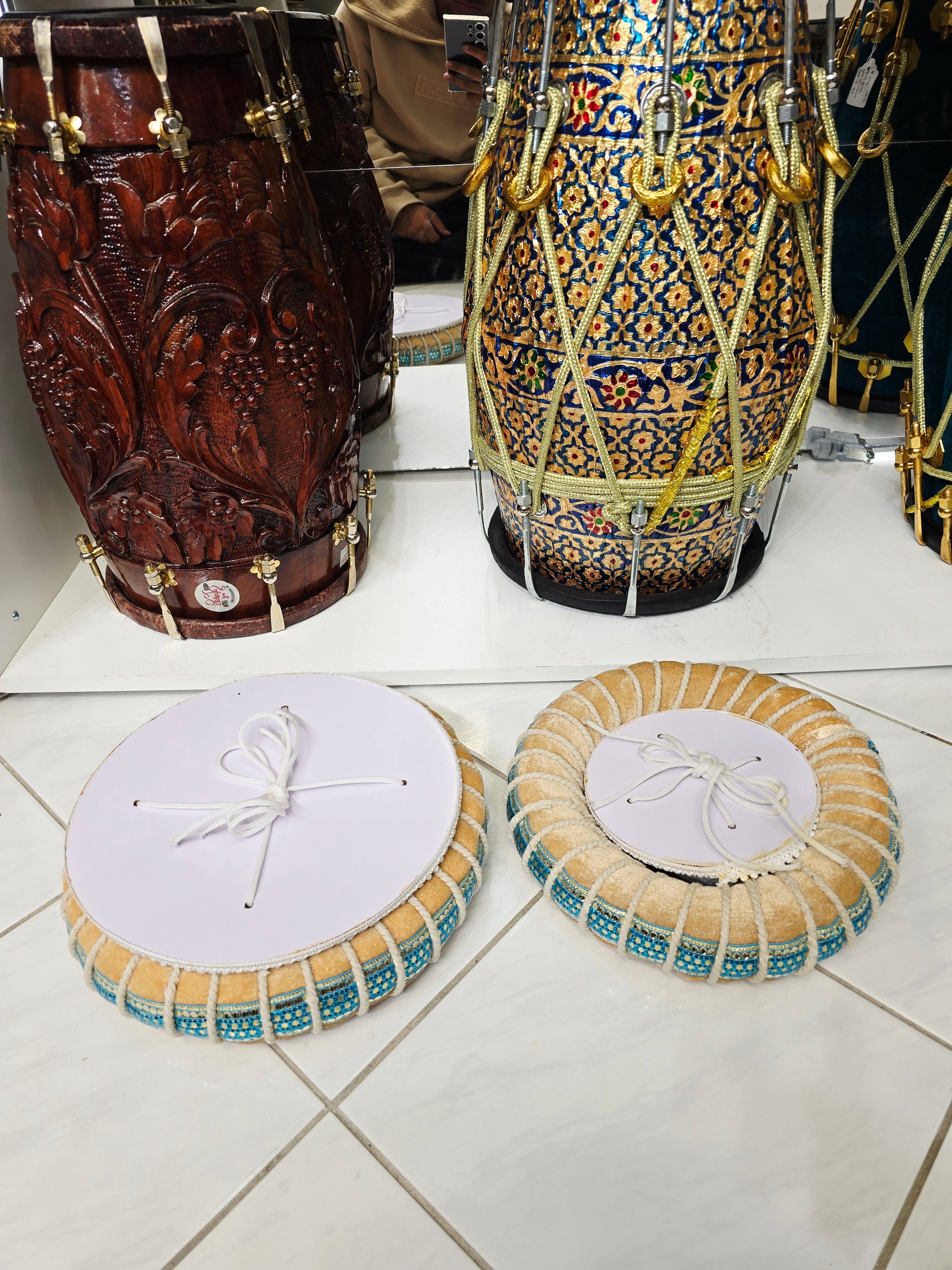 The Taal Shweta (Pure Rhythm) set offers a graceful blend of soft beige-gold velvet and shimmering turquoise border accents, creating a bright and serene aesthetic. This set includes two padded support rings and matching top covers, secured with white lace trim and wrapped with durable thread. Subtle yet striking, it's ideal for temple settings, classical performances, or as a neutral base for vibrant tabla designs.