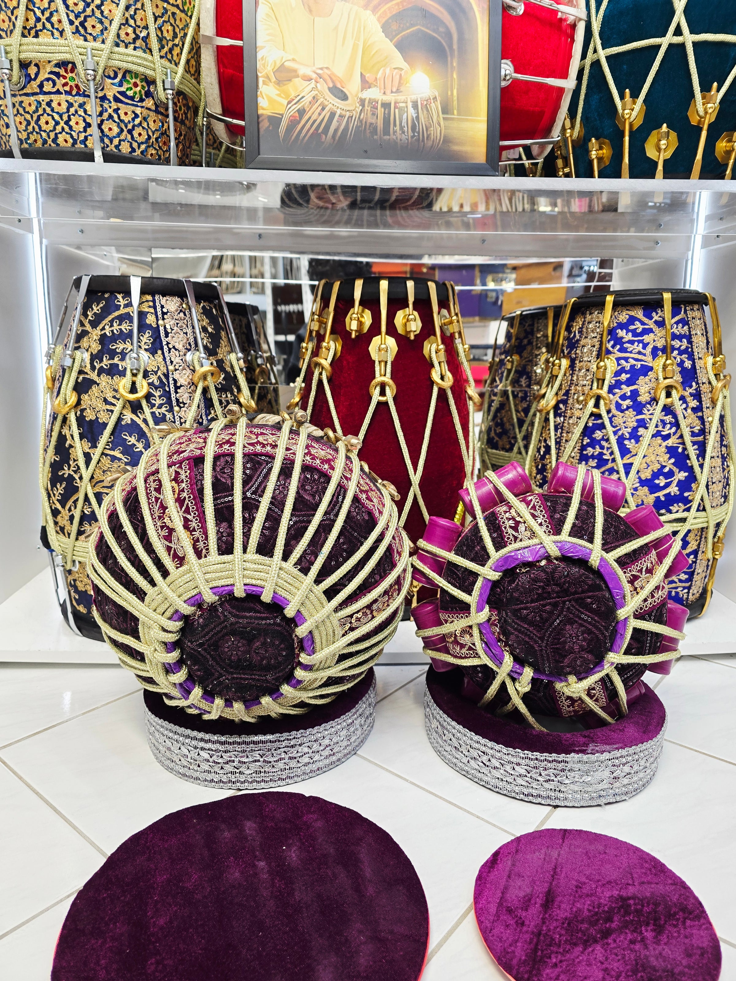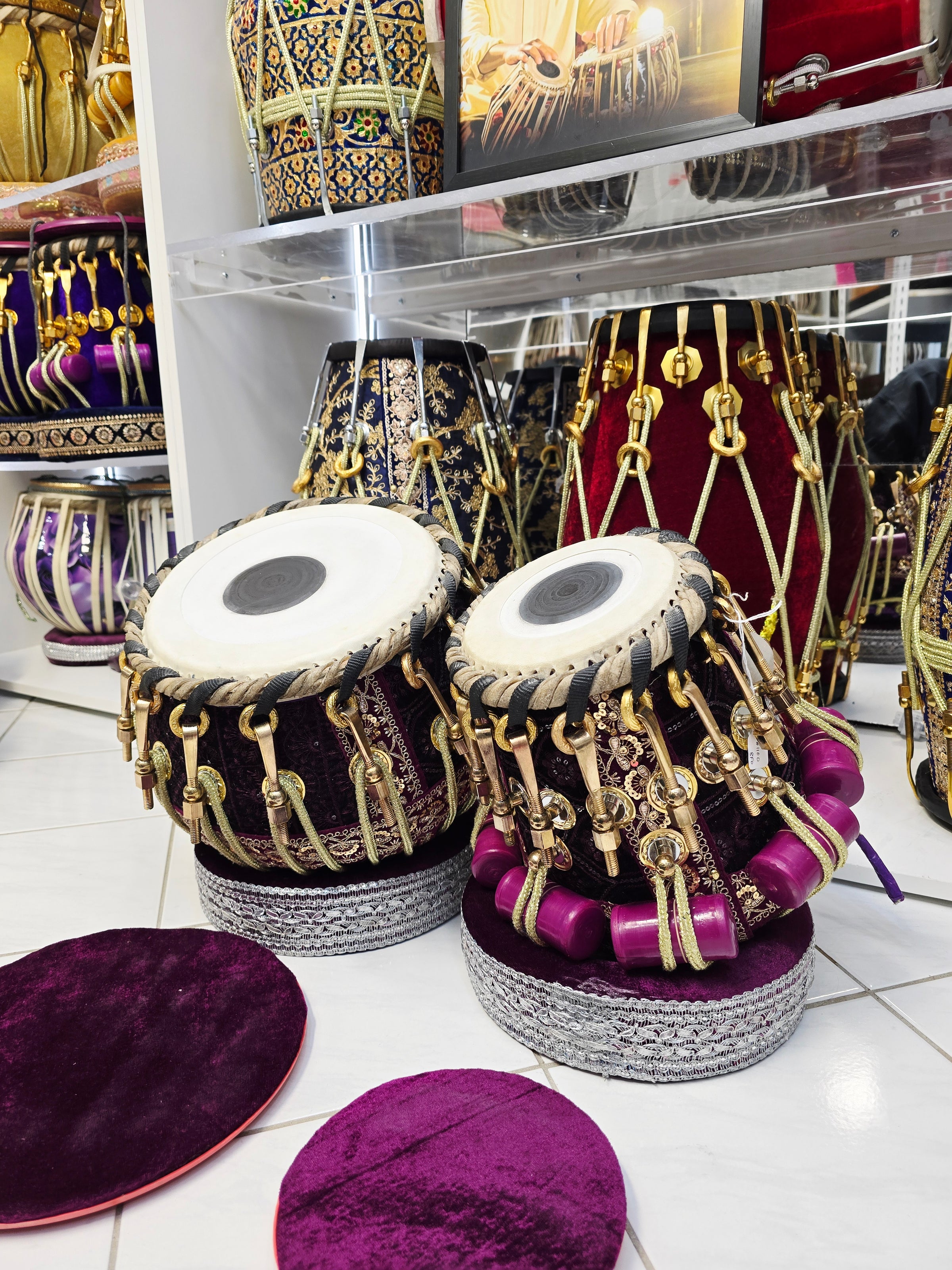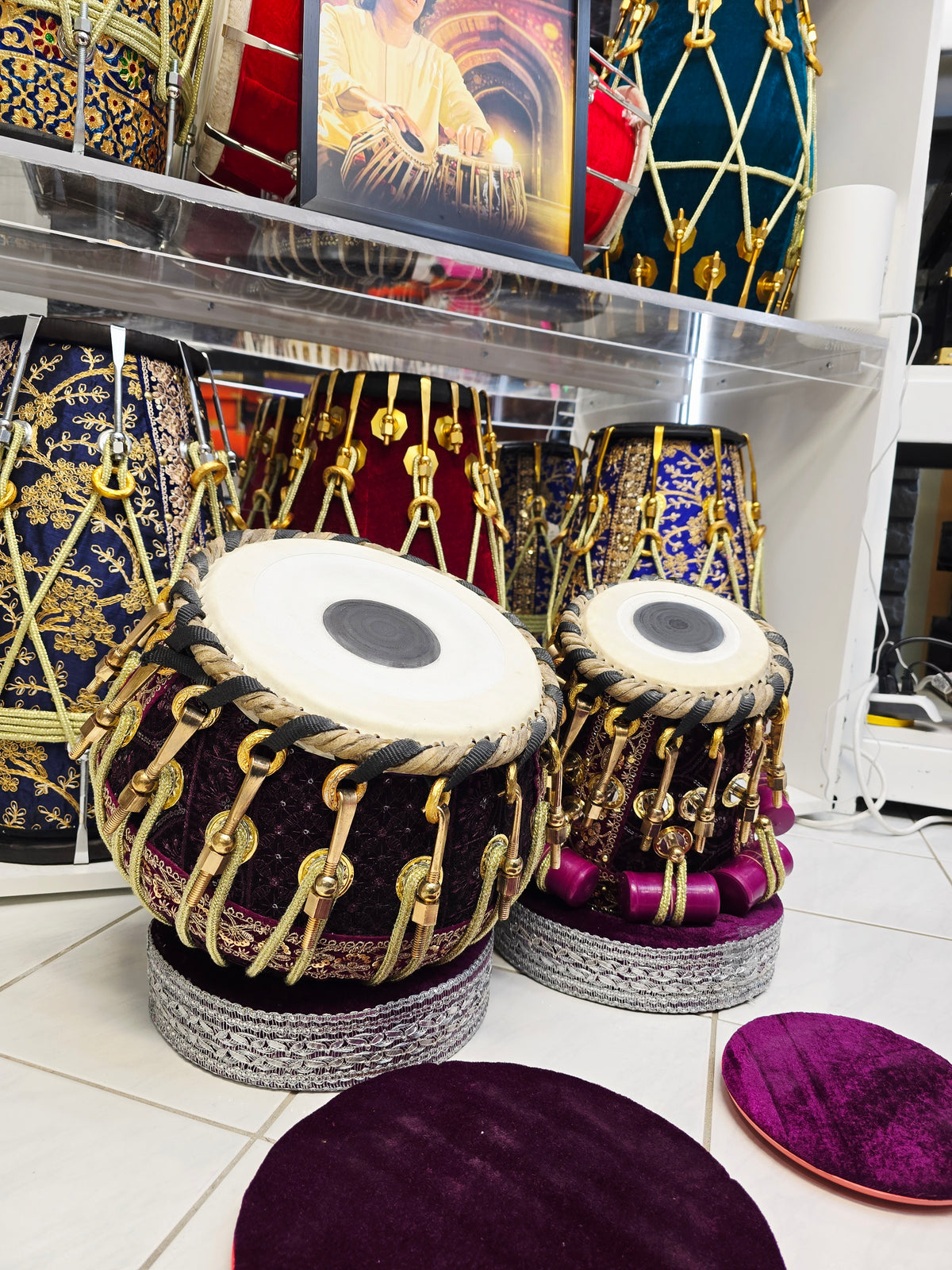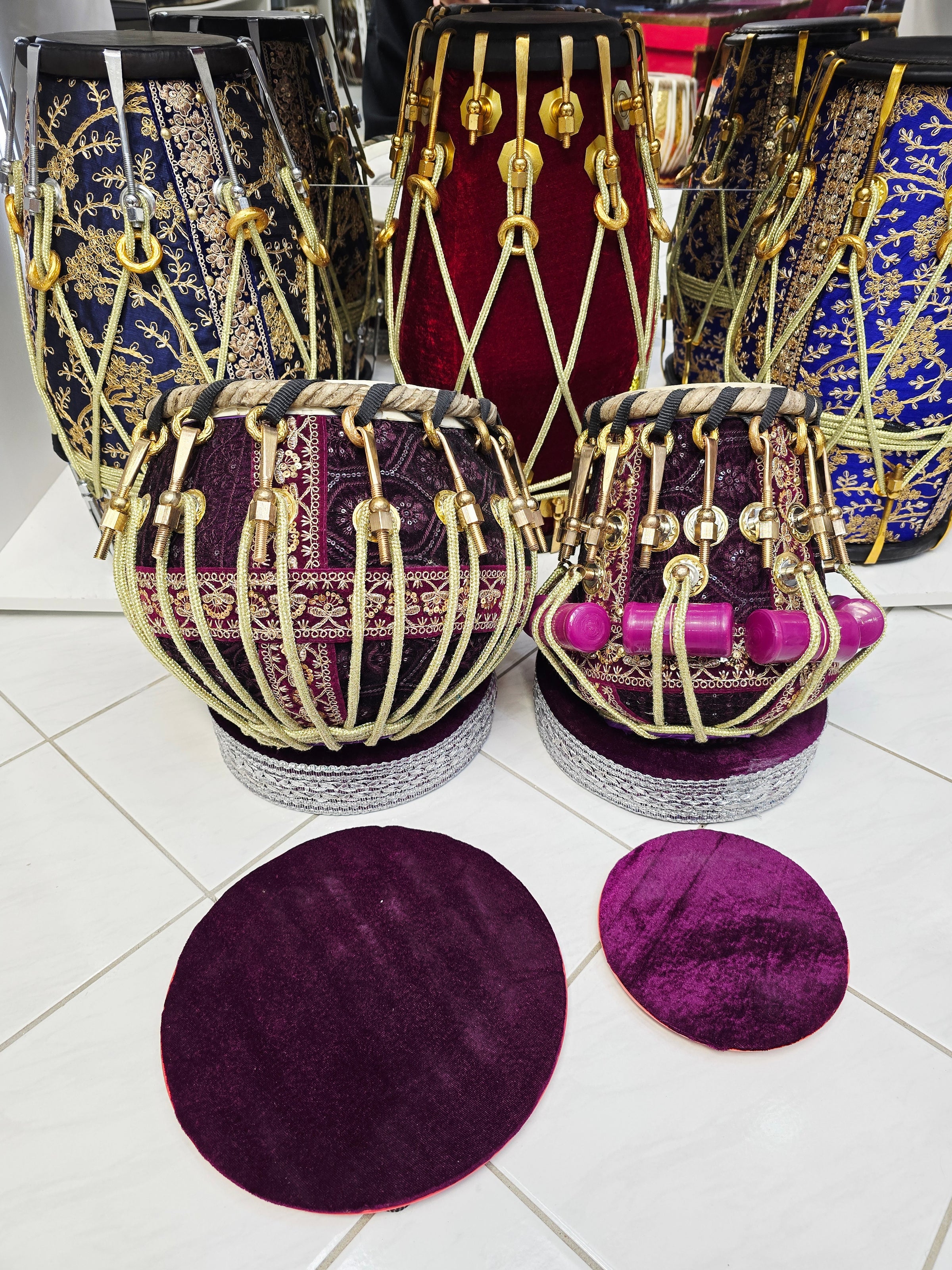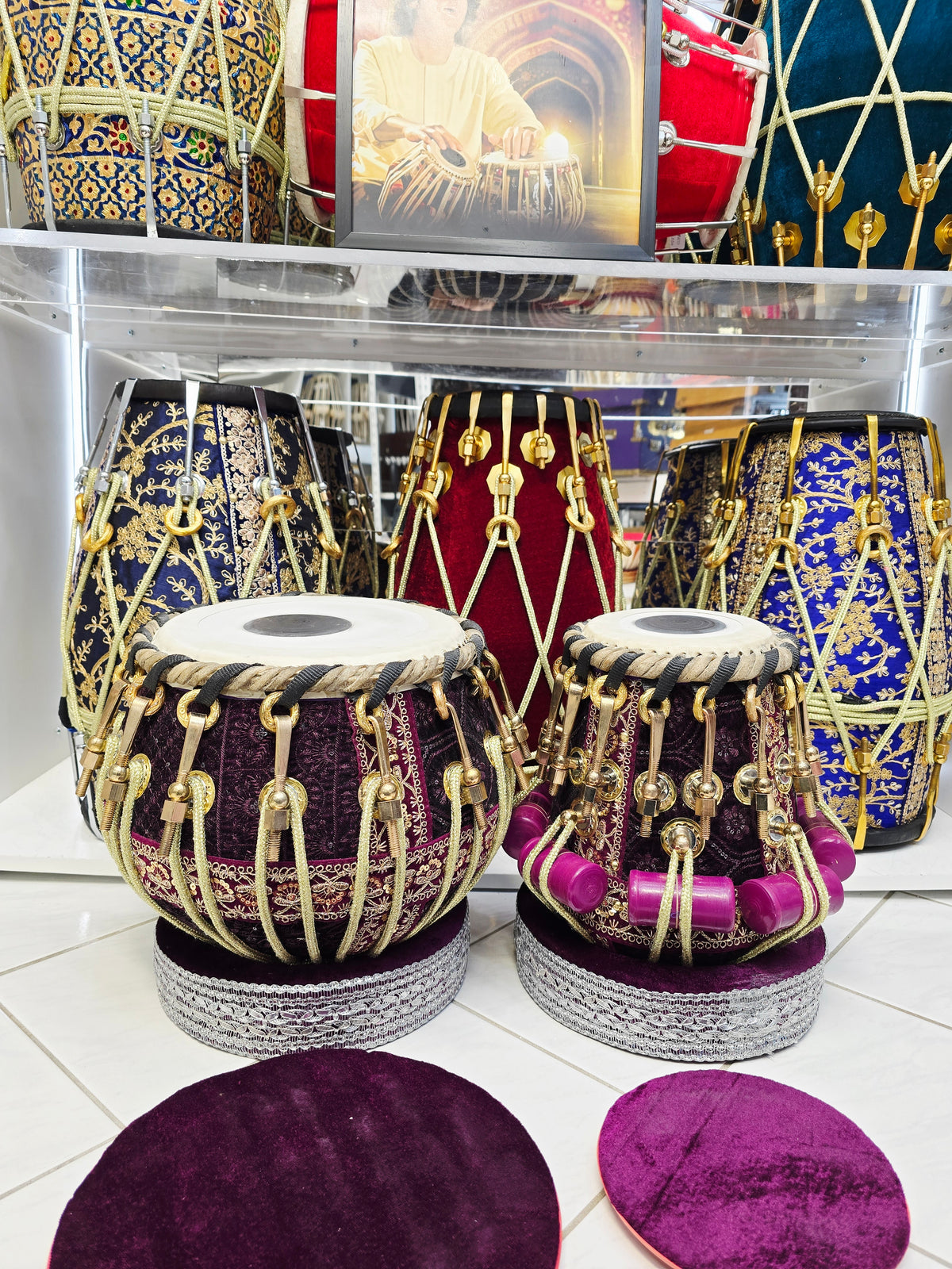 The Amethyst Raaga™ Tabla Set is a richly styled sherwani-wrapped, bolted configuration designed to stand out both visually and sonically. Featuring a 5.75″ red sheesham dayan tuned to C♯/D paired with a 9.25″ copper bayan, this set offers clear, articulate dayan strokes complemented by a deep, rounded bass response with smooth sustain. The deep purple sherwani wrap with gold detailing gives the instrument a regal, contemporary character while maintaining classical balance. Well suited for riyaaz, recording, and intimate stage performance, this set is ideal for players seeking a bold aesthetic with dependable, expressive tone.