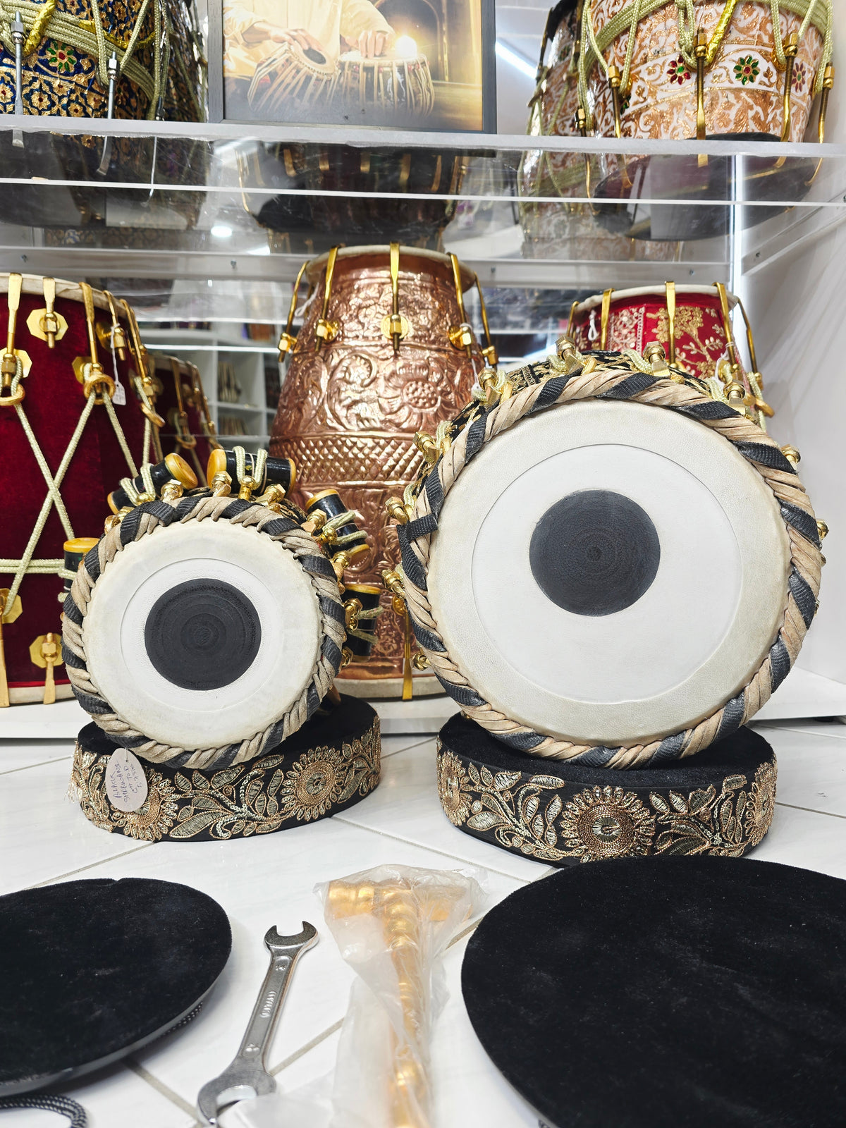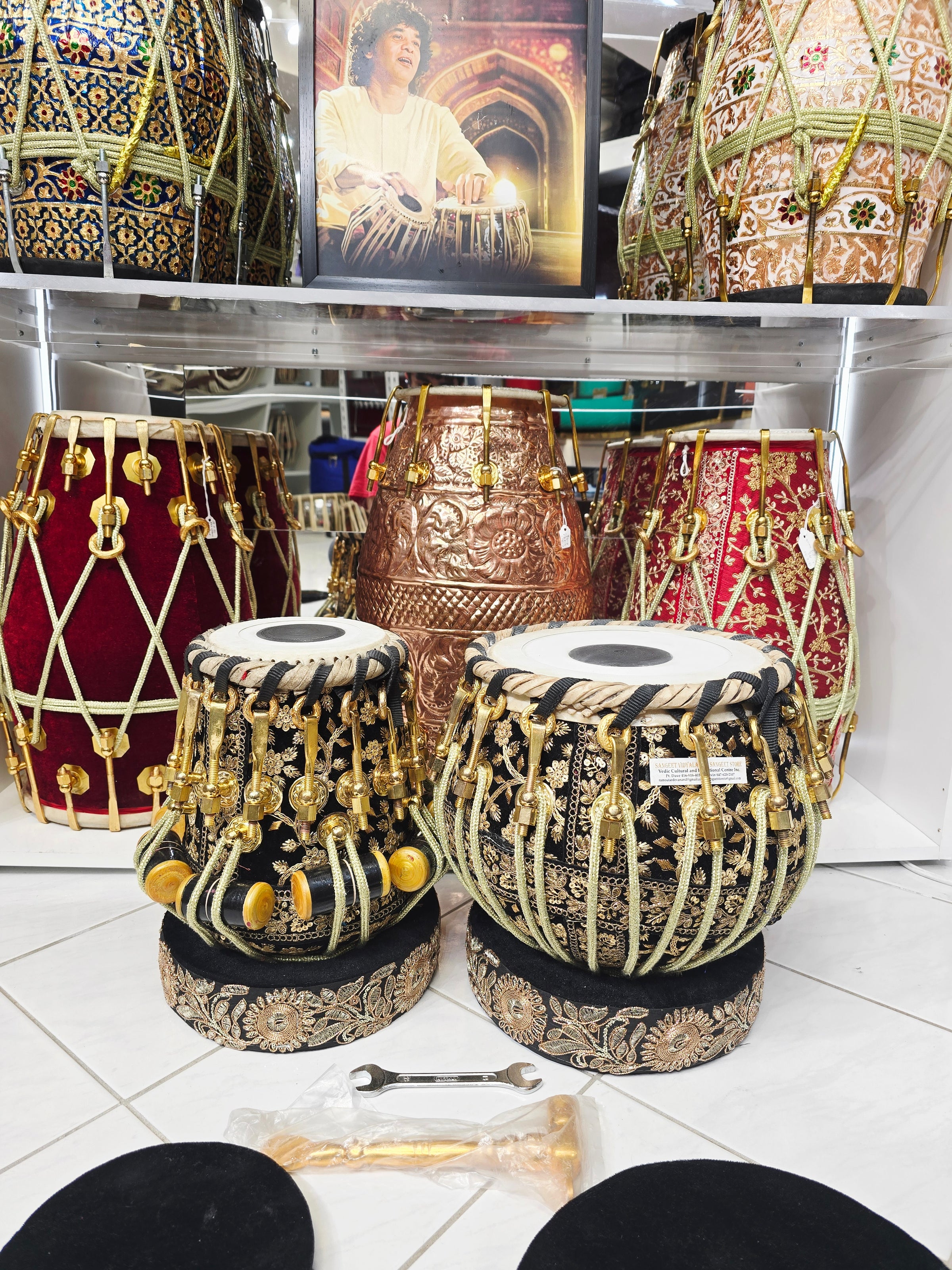 The Maharaja Veil Tabla Set is a regal masterpiece, blending rich tradition with bold aesthetics. Featuring a 5.75" C#/D Red Sheesham Dayan and a 6.2kg 9.25" Copper Bayan, this set delivers deep, resonant bass and crisp, articulate treble. Wrapped in an opulent black and gold sherwani fabric, this bolted tabla set ensures superior tuning stability and durability. The golden pure brass bolts add a striking accent, enhancing both its visual grandeur and acoustic brilliance. Crafted for serious musicians and collectors, the Maharaja Veil is a symbol of royal elegance and powerful performance.