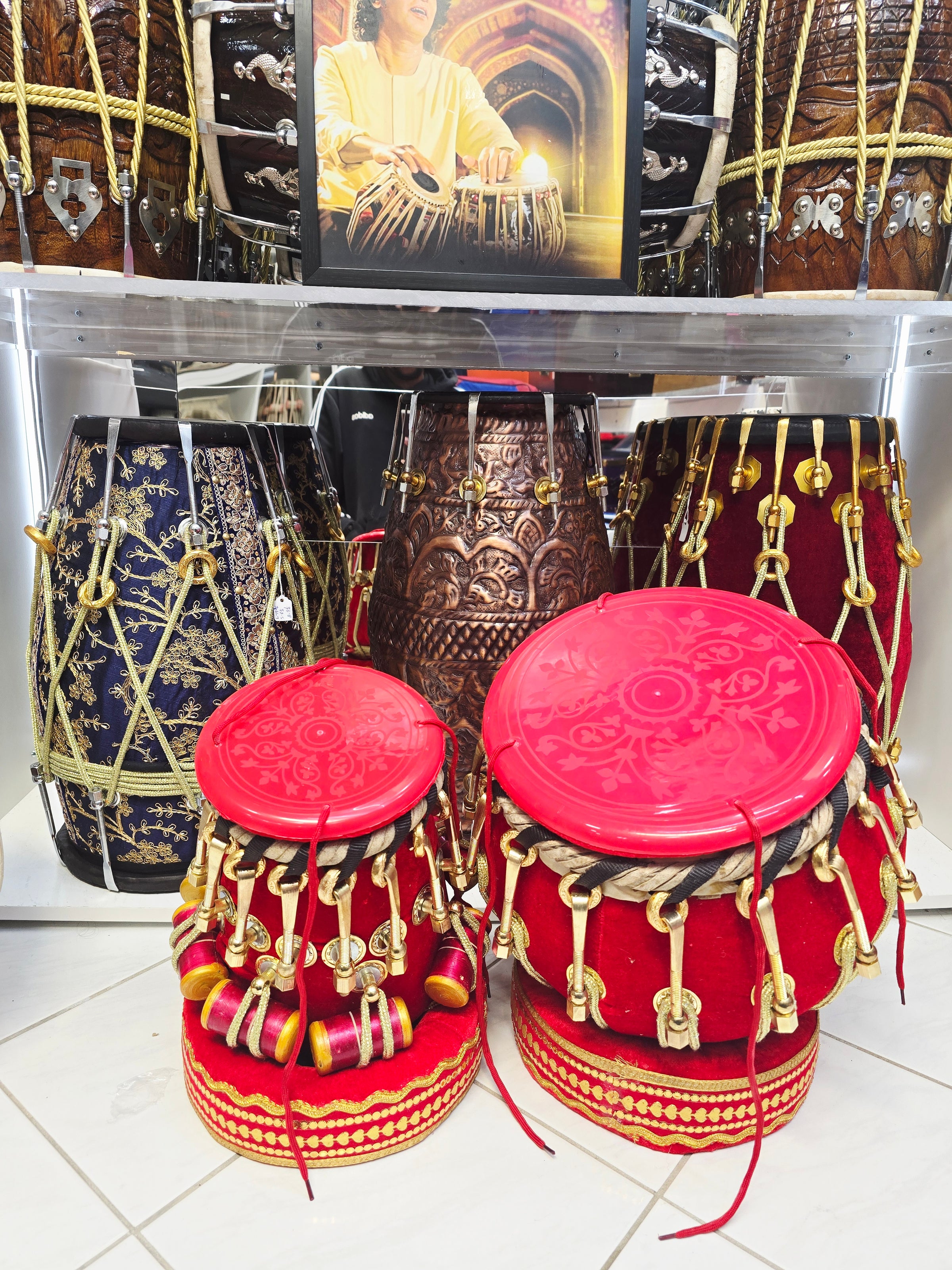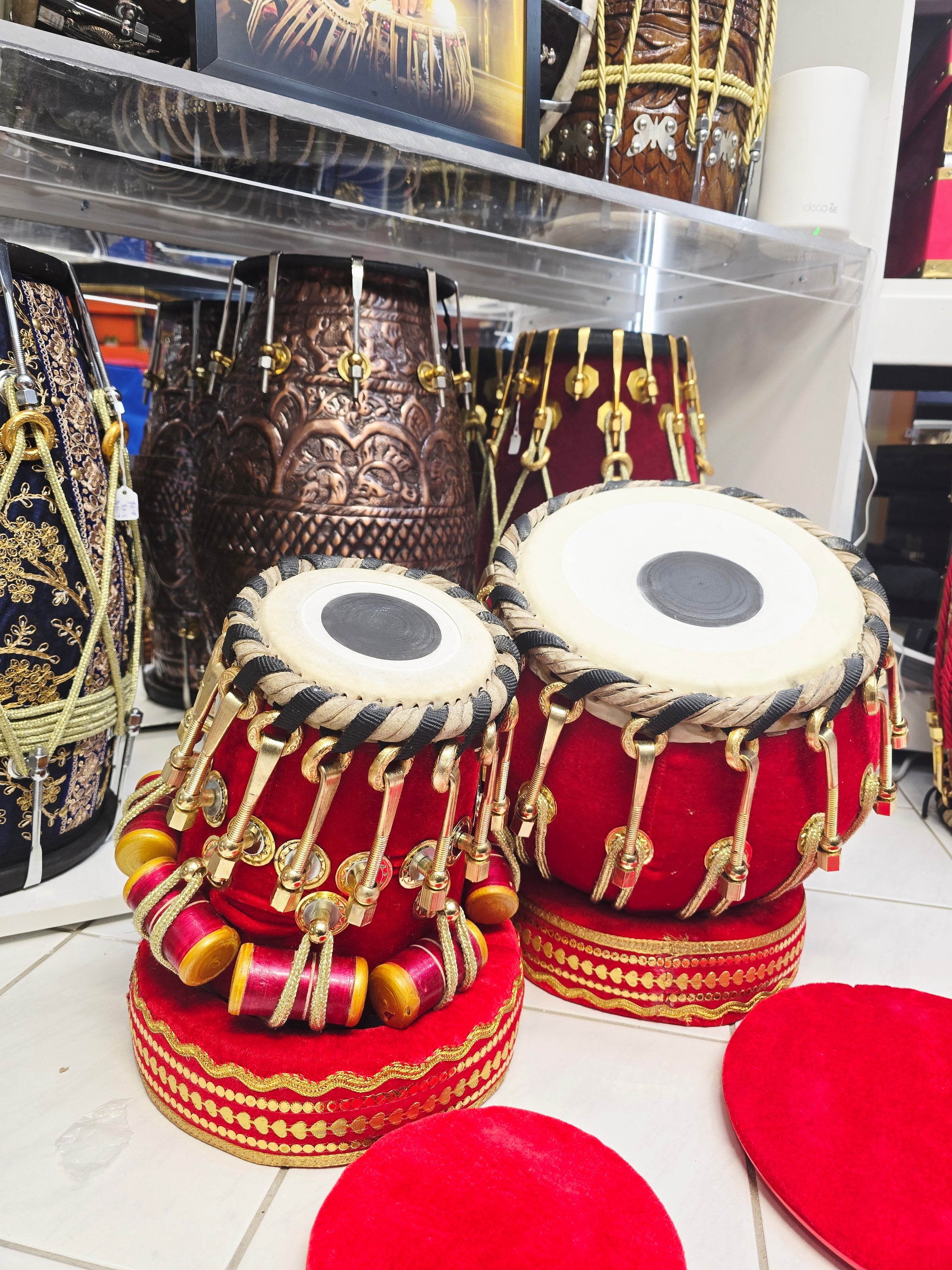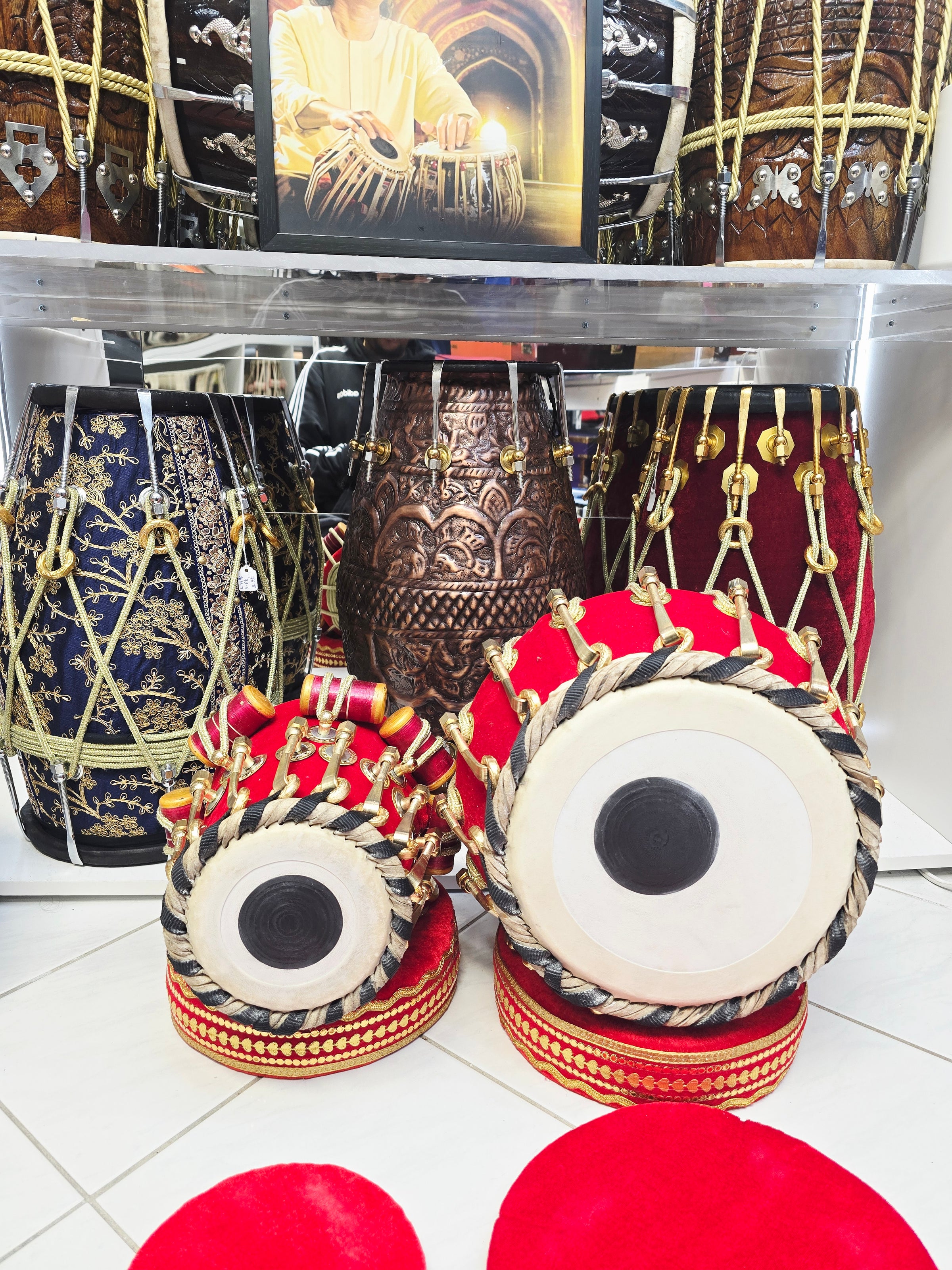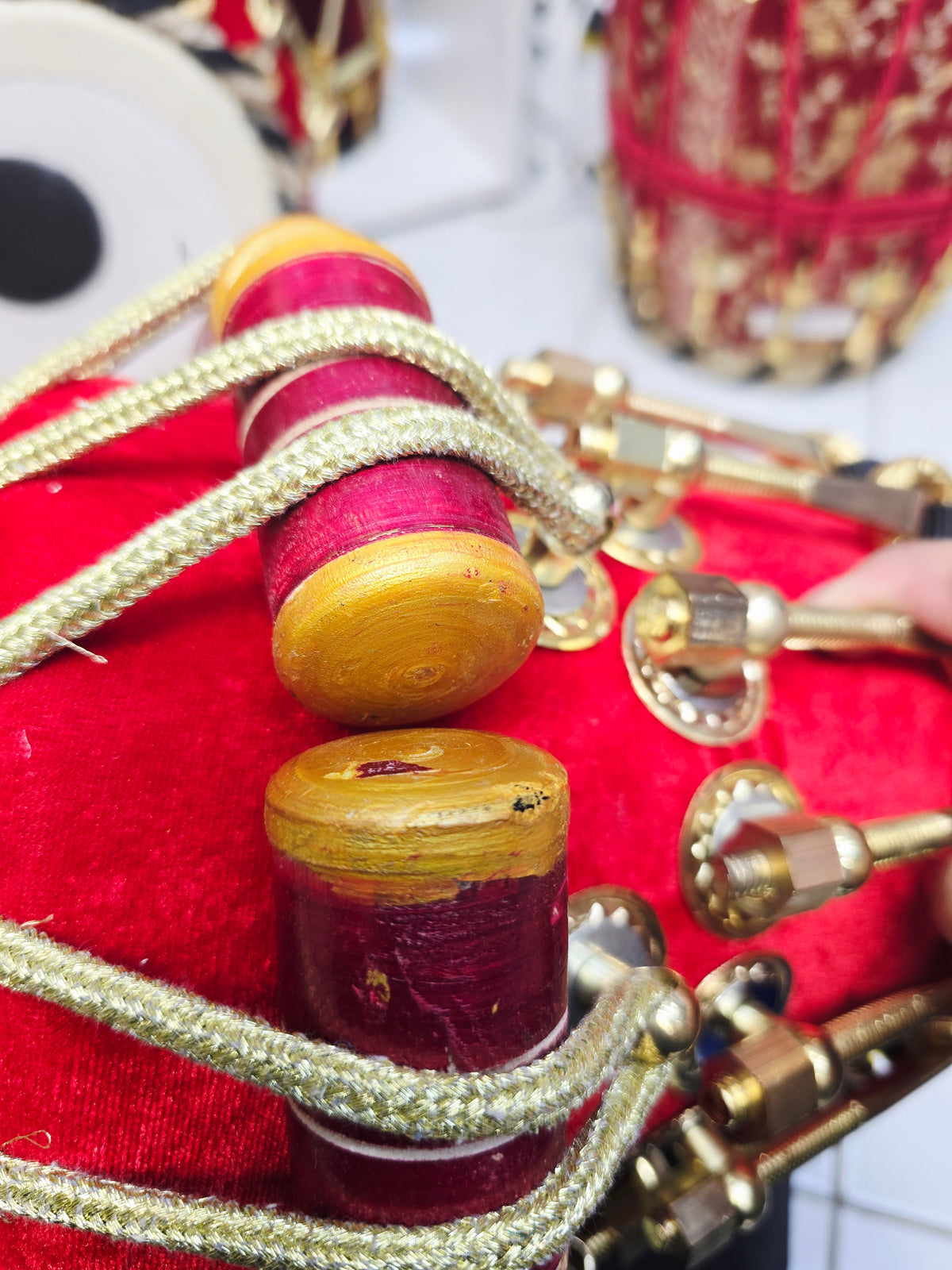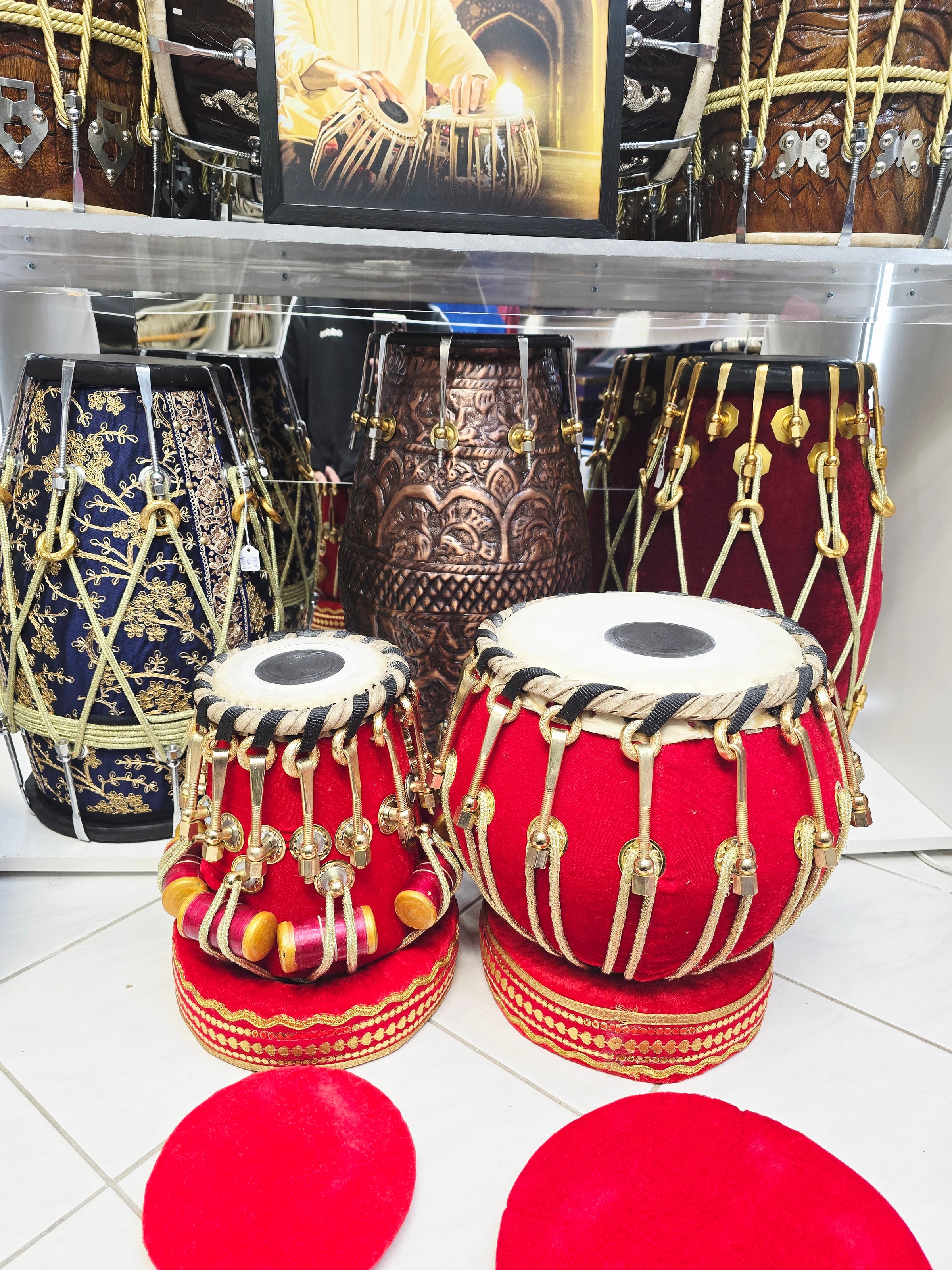 Our line of Premium Red Sheesham Tabla Sets feature the quality and craftsmanship that are exclusively crafted to meet the Sangeet Store criteria of resonance, depth and clarity. An average of 4-6 months is invested into crafting, analysis, recrafting and perfecting their Tablas that make it to the Sangeet Store. This guarantees the authenticity, adequate time to source the highest quality of materials in their prime season, and concentrated craftsmanship. All Tabla Sets are inclusive of ;
