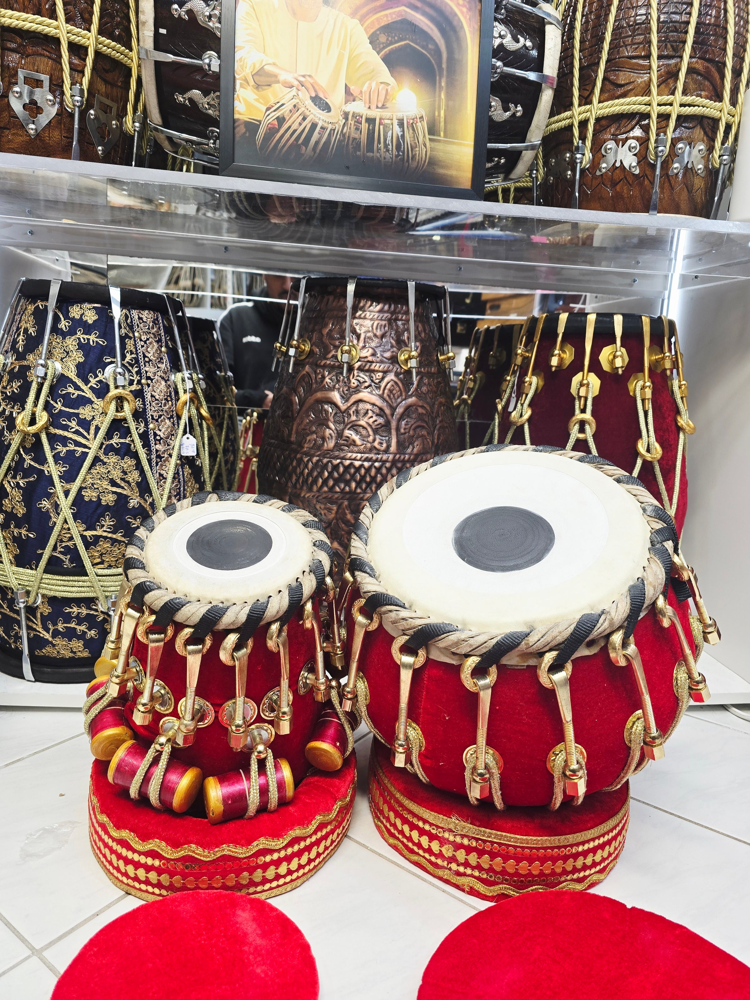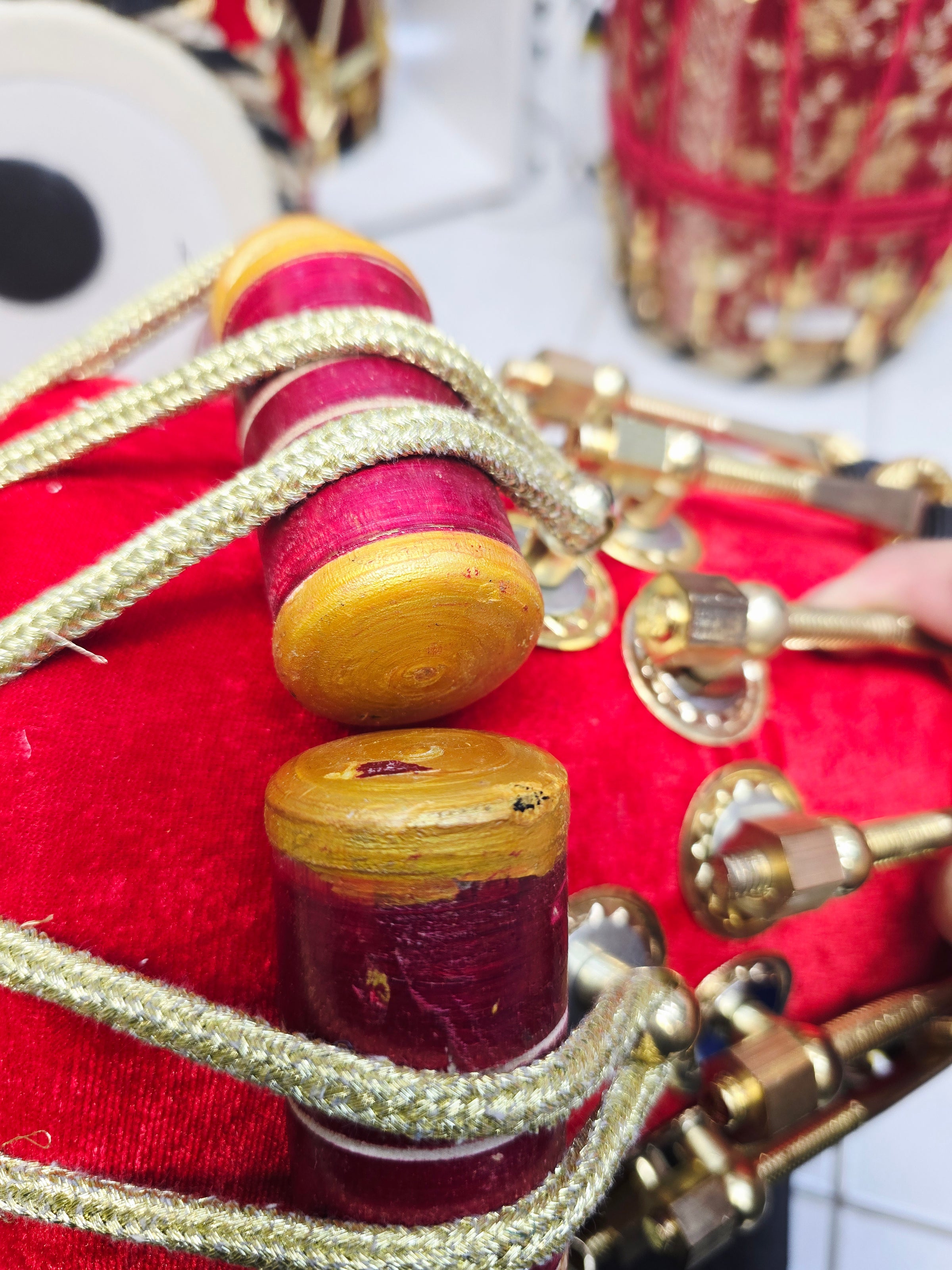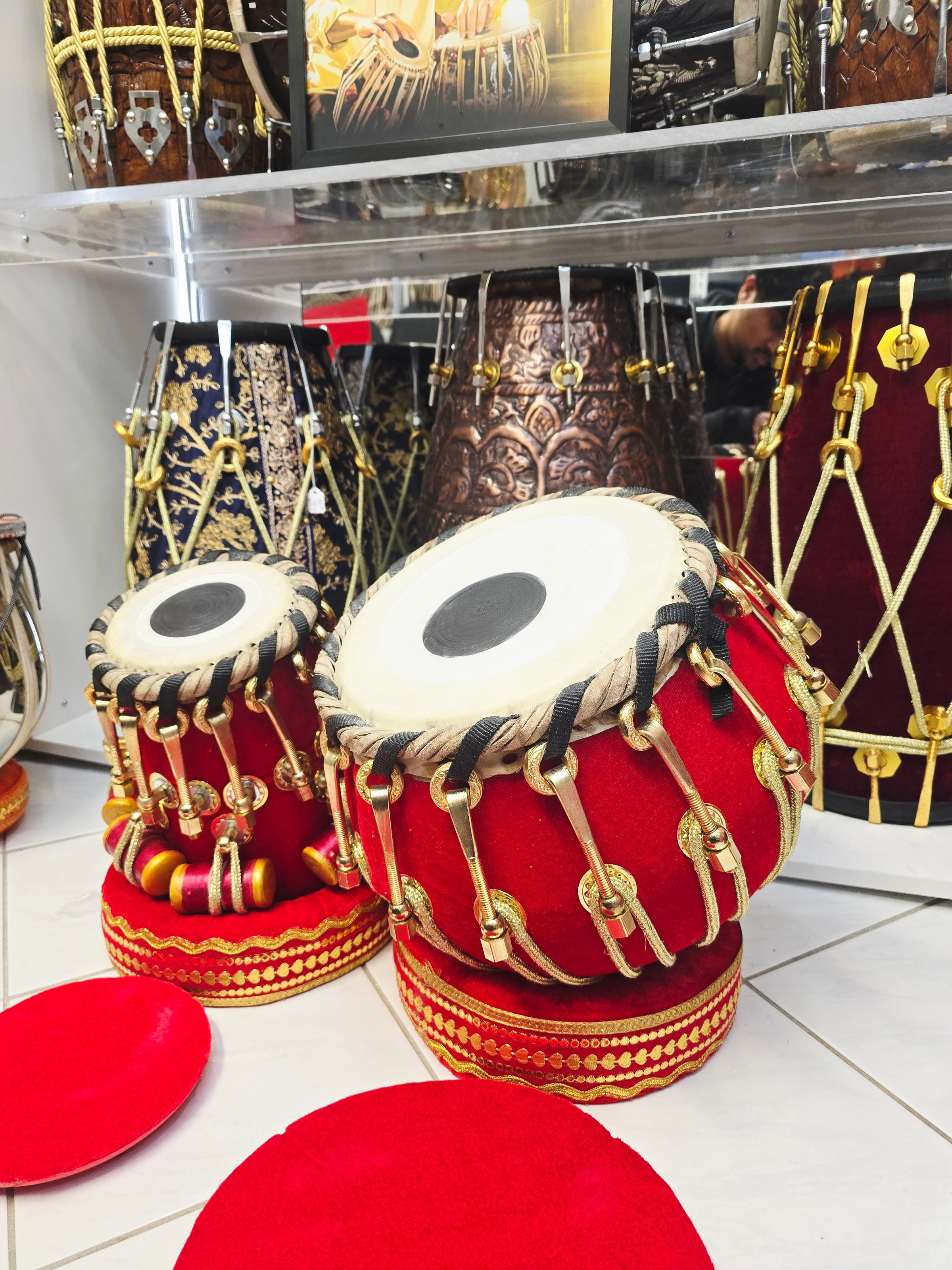 The Rakt Maharaaj commands attention before a single stroke is played. Wrapped in deep red velvet and built on a solid red sheesham 5.25" Dayan tuned to D#/E, this set delivers bright, piercing clarity with refined tonal control and crisp articulation.