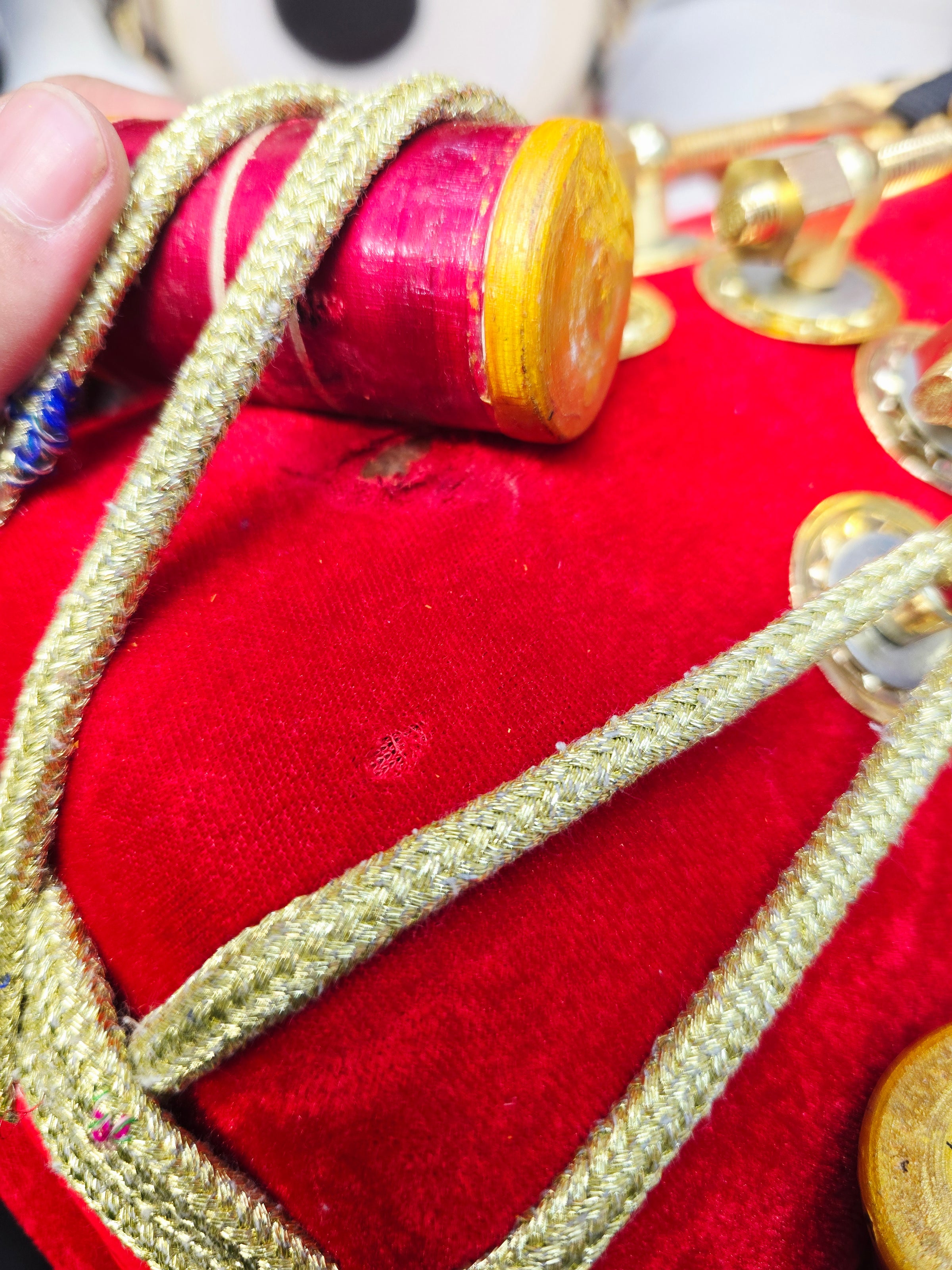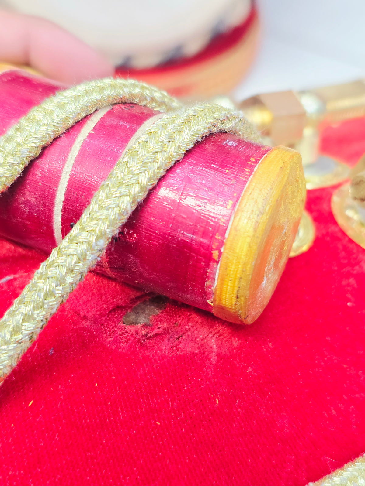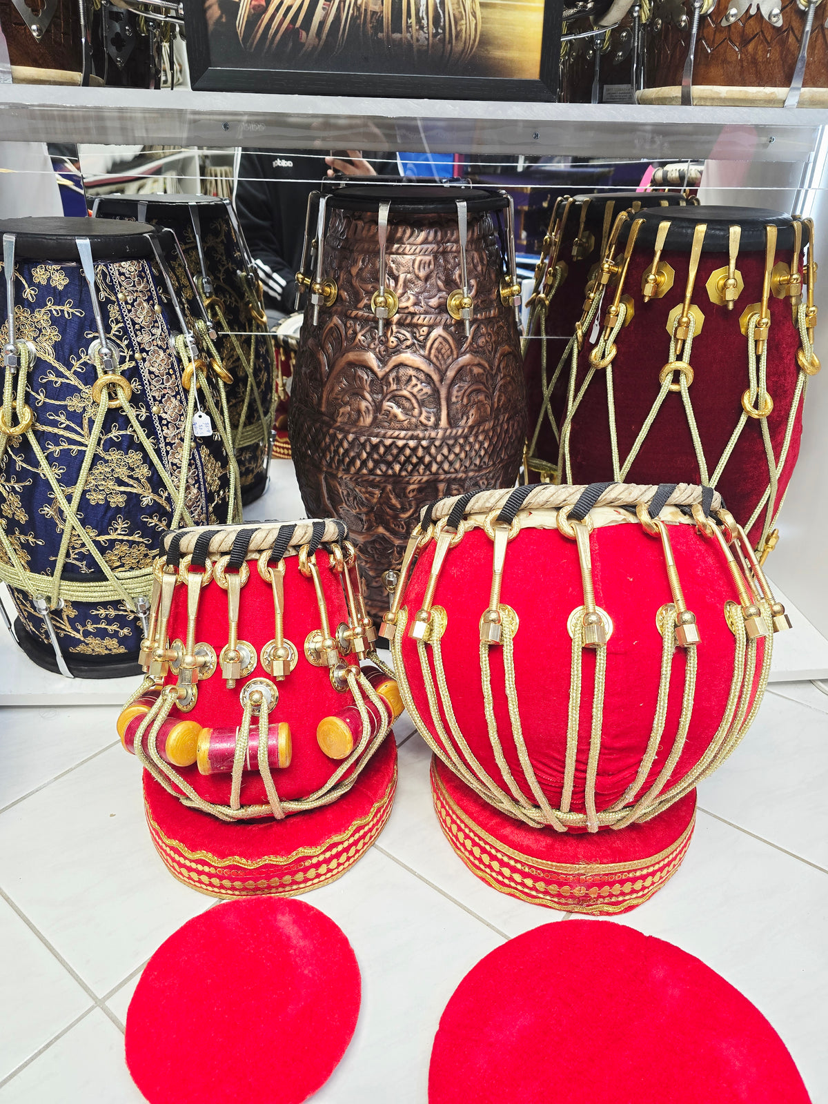 The Rakt Maharaaj commands attention before a single stroke is played. Wrapped in deep red velvet and built on a solid red sheesham 5.25" Dayan tuned to D#/E, this set delivers bright, piercing clarity with refined tonal control and crisp articulation.