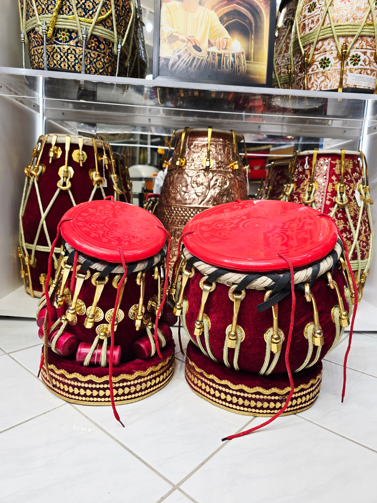 The Velvet SuryaFlare Tabla Set pairs a 5.5" D#/E Red Sheesham Dayan with a 9.25" copper bayan, wrapped in deep dark-red velvet and finished with striking gold hardware for a regal, performance-ready look. The 5.5" dayan offers bright, focused treble clarity, while the copper bayan delivers smooth, warm bass with strong projection. Its gold-bolted design enhances tuning stability and durability, making this set both visually powerful and musically balanced—an ideal choice for players seeking a tabla pair that stands out in tone, craftsmanship, and aesthetic presence.