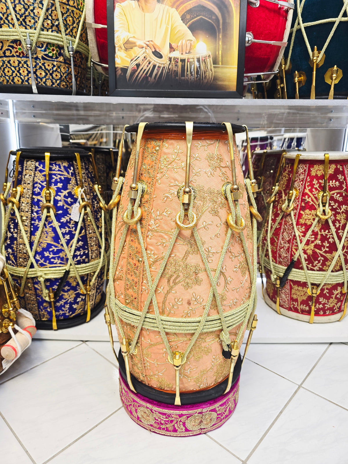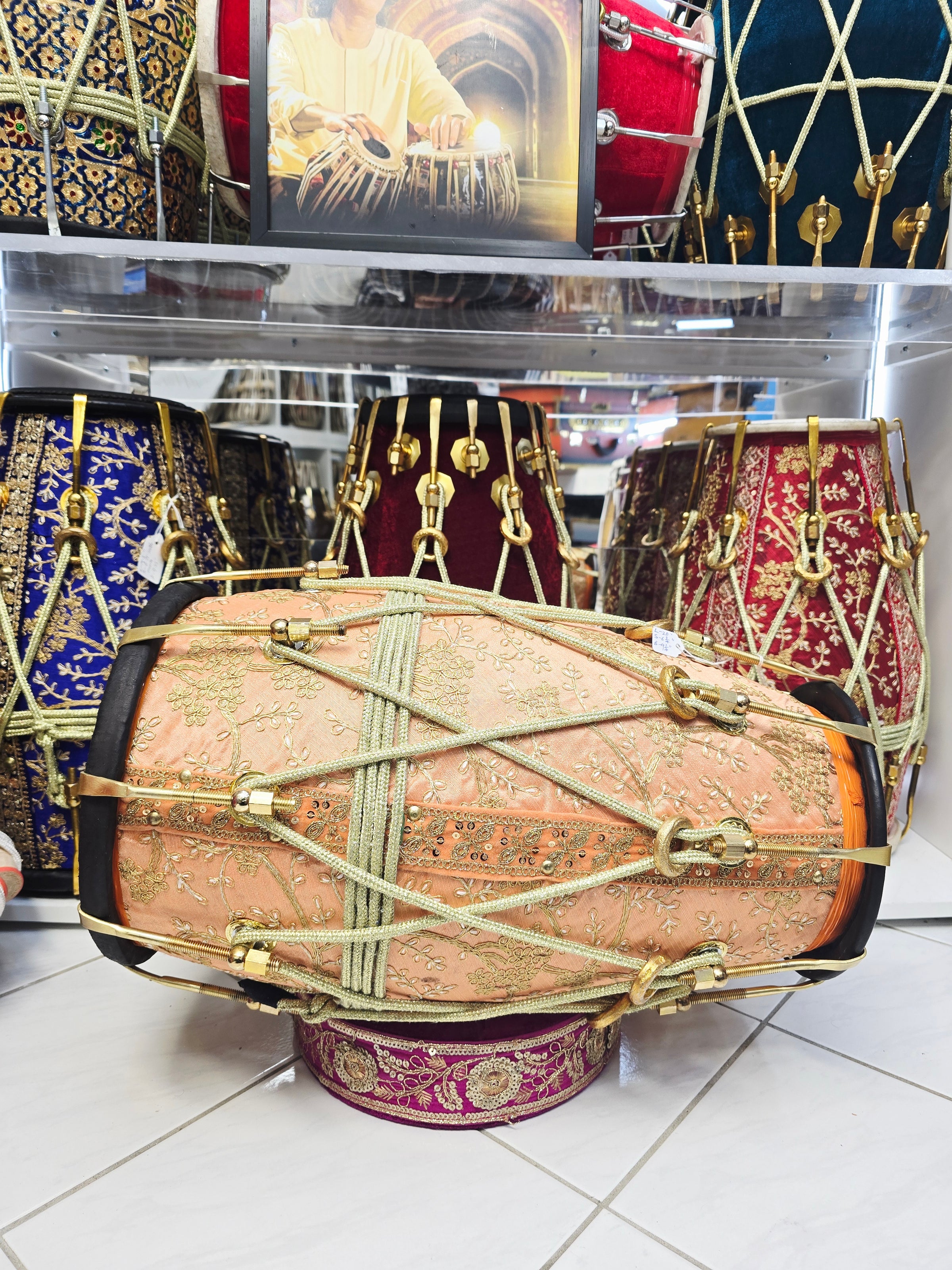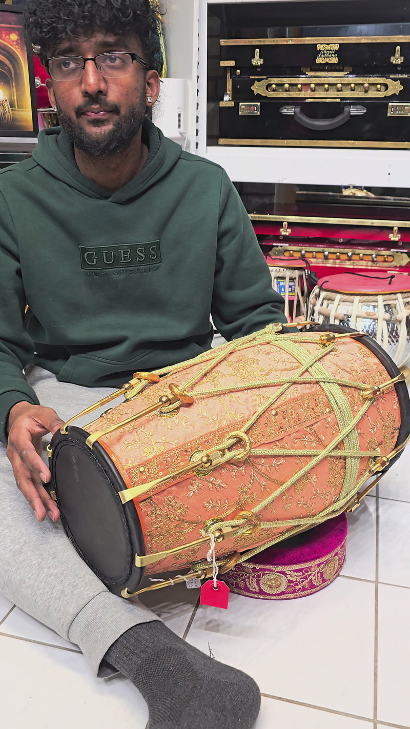 This premium dholak is crafted from solid red sheesham wood and finished in an ornate kesar-toned sherwani wrap, combining visual richness with a strong, authoritative voice. Measuring 20" in length and weighing 19.8 lbs, it has a dense, substantial feel that delivers powerful low frequencies with clear, ringing highs and excellent projection. The rope lacing is decorative, preserving a traditional aesthetic, while metal bolt tuning handles all pitch adjustments with precision and long-term stability. Designed for players who value presence, durability, and refined craftsmanship, Kesar Saaj Royale is well suited for classical, devotional, and contemporary performance settings.