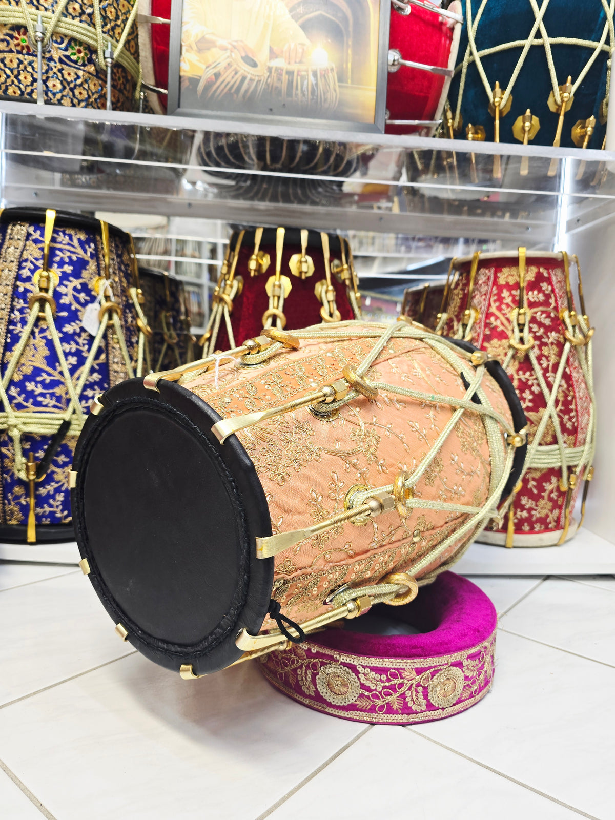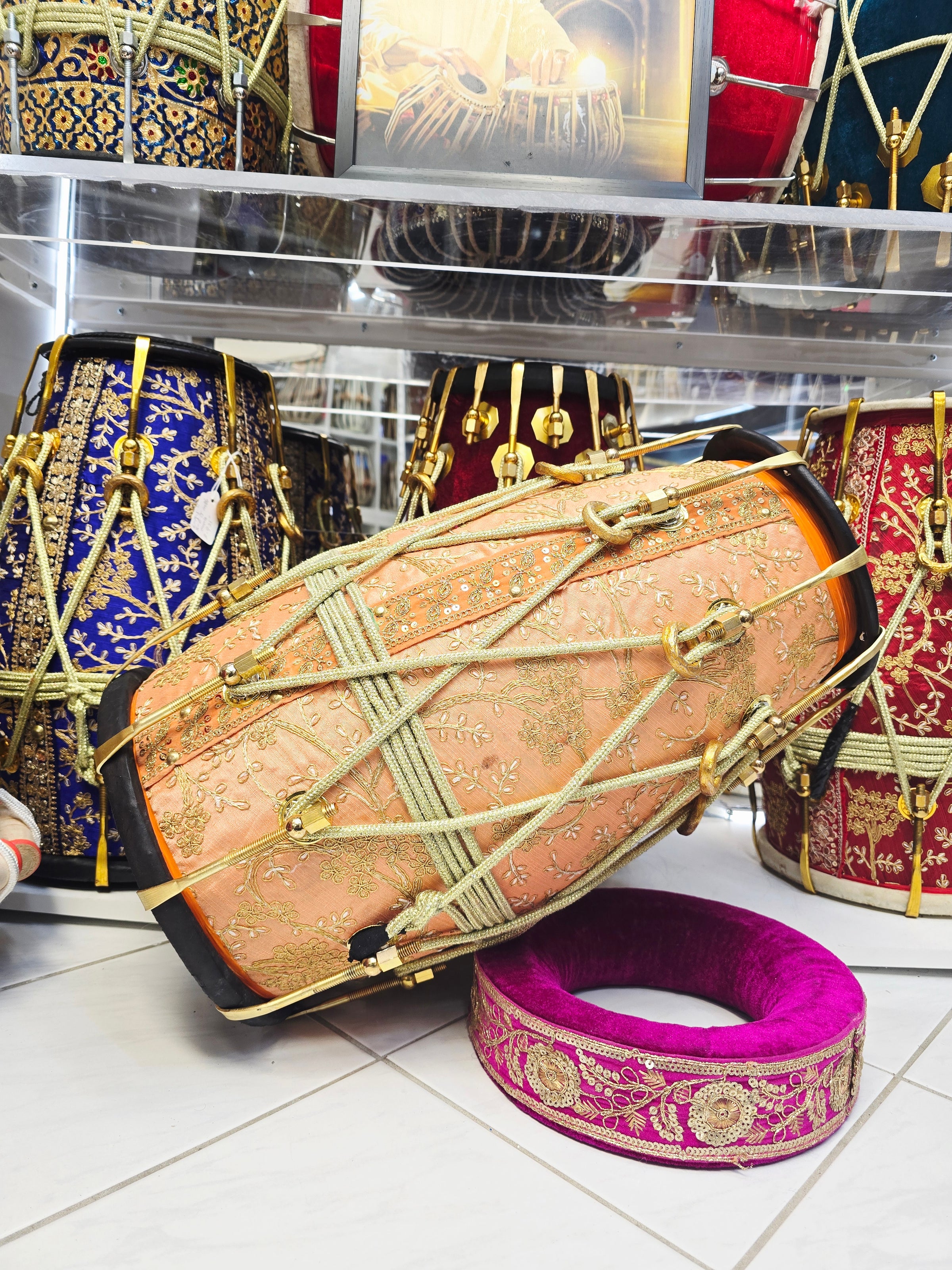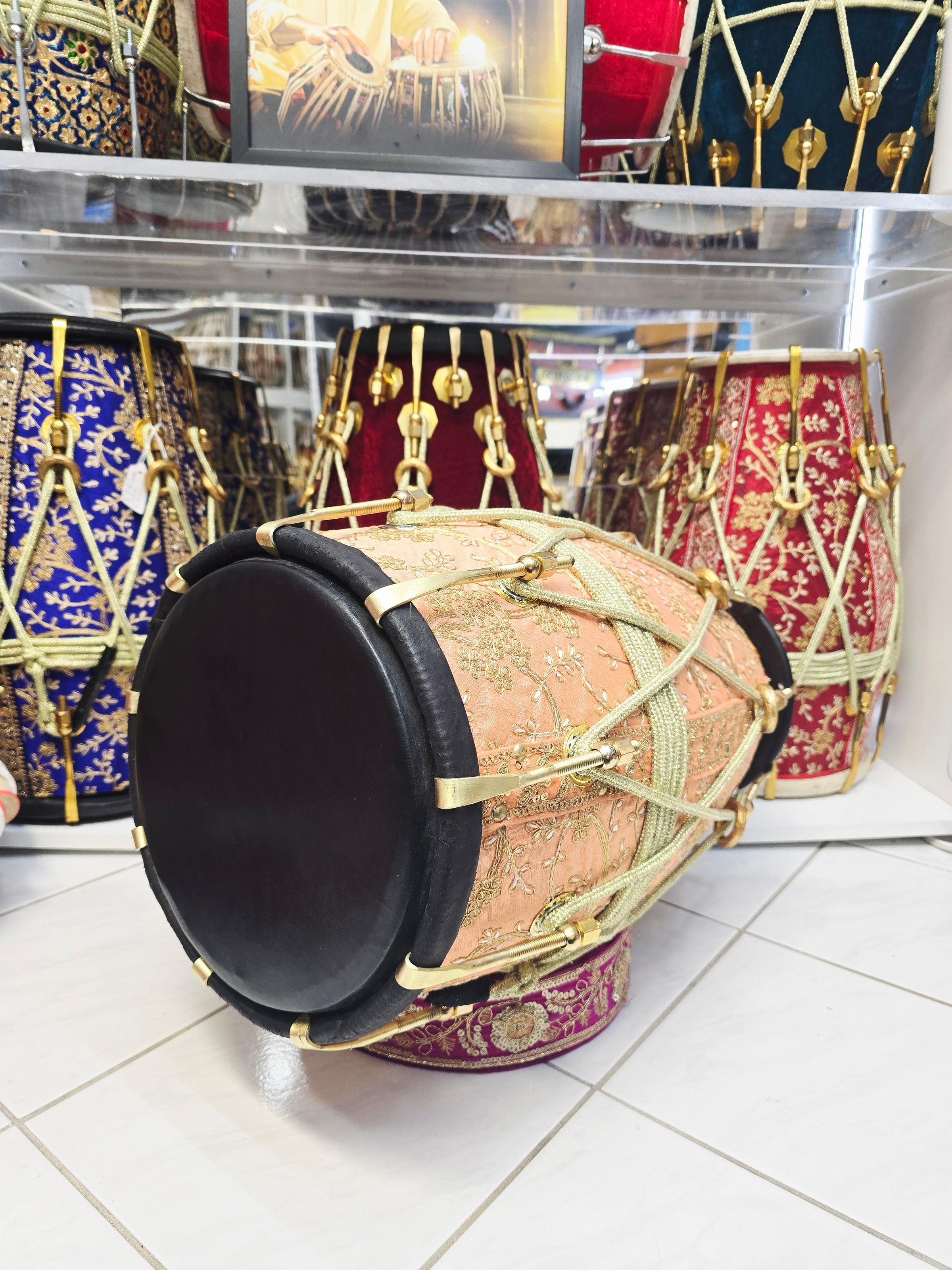 This premium dholak is crafted from solid red sheesham wood and finished in an ornate kesar-toned sherwani wrap, combining visual richness with a strong, authoritative voice. Measuring 20" in length and weighing 19.8 lbs, it has a dense, substantial feel that delivers powerful low frequencies with clear, ringing highs and excellent projection. The rope lacing is decorative, preserving a traditional aesthetic, while metal bolt tuning handles all pitch adjustments with precision and long-term stability. Designed for players who value presence, durability, and refined craftsmanship, Kesar Saaj Royale is well suited for classical, devotional, and contemporary performance settings.