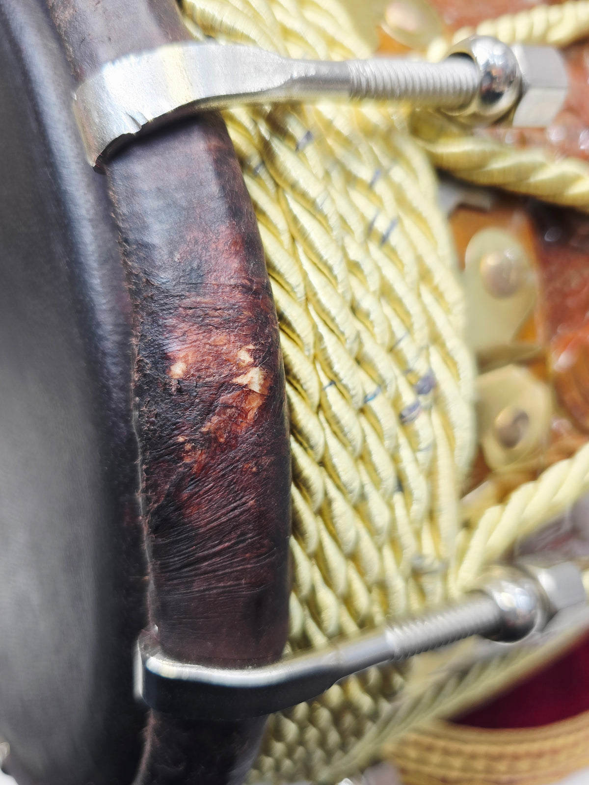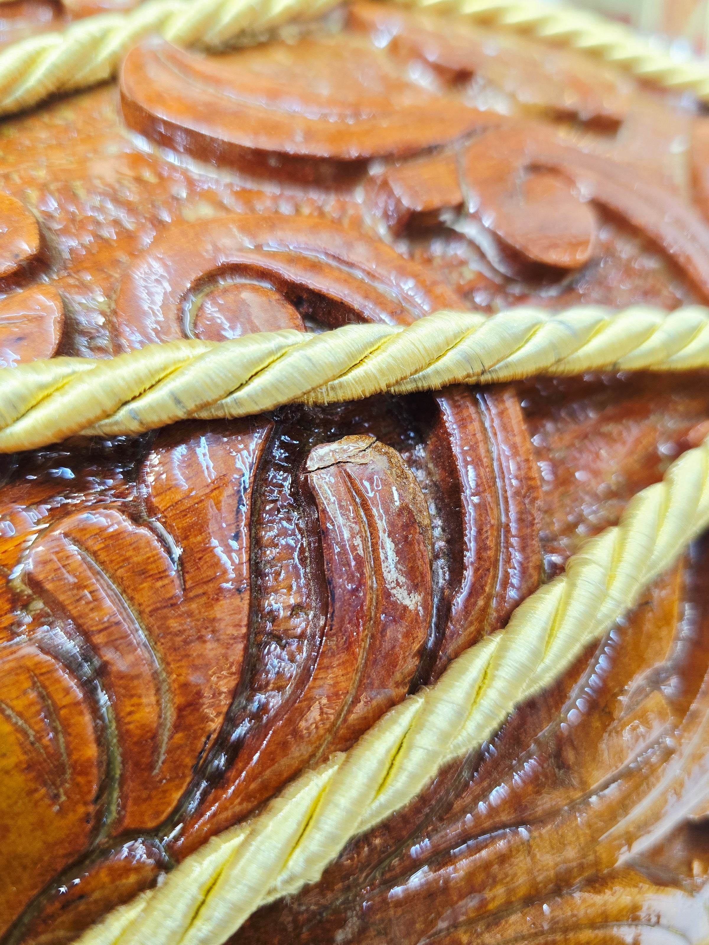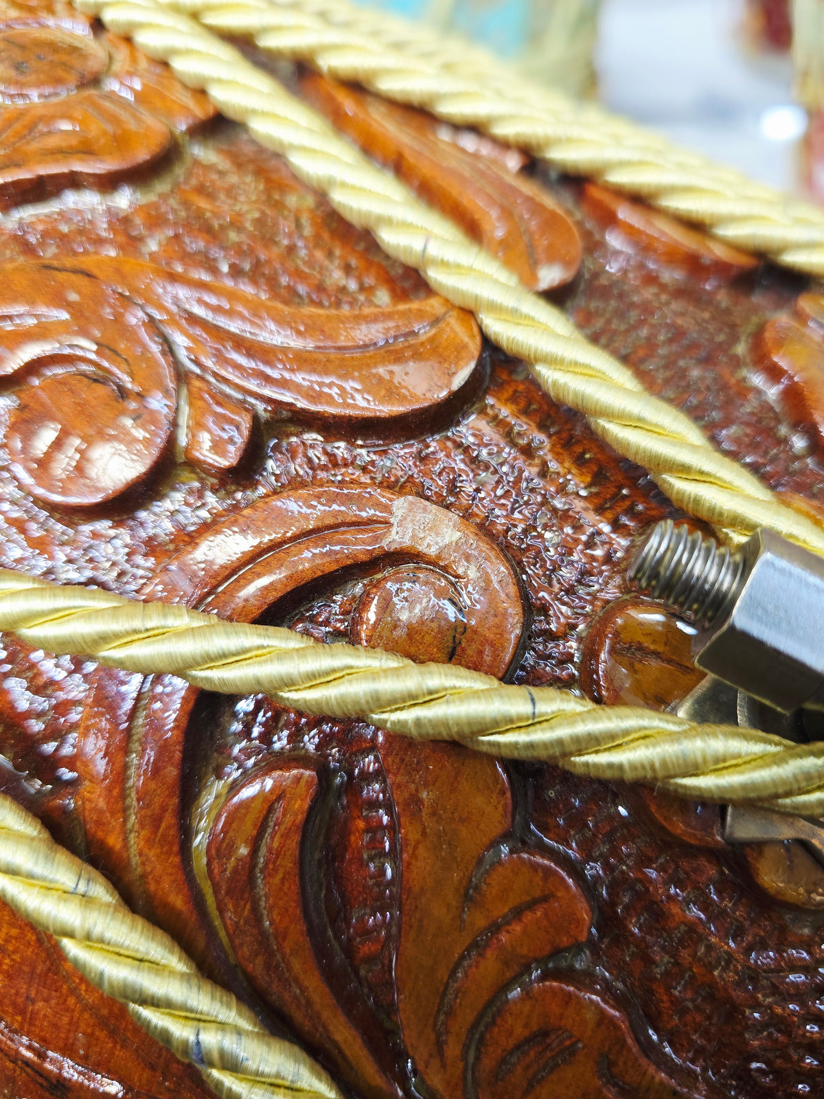 Sculpted from dense bijessar wood and intricately hand-carved, the Maa Ambika VeenaFlame dholak radiates both strength and grace. Weighing 18.4 lbs, it projects a commanding bass with sharp, lively treble — a balance that speaks to both power and refinement. The deep engravings add a layer of artistry, while golden accents and polished finish make it a visual centerpiece. Bearing only very minor cosmetic blemishes, this instrument remains a heavyweight of sound and presence, crafted for those who honor tradition with modern performance energy.
