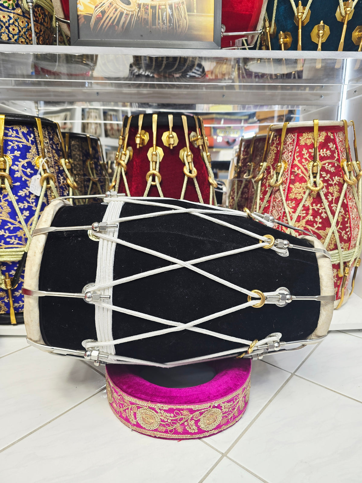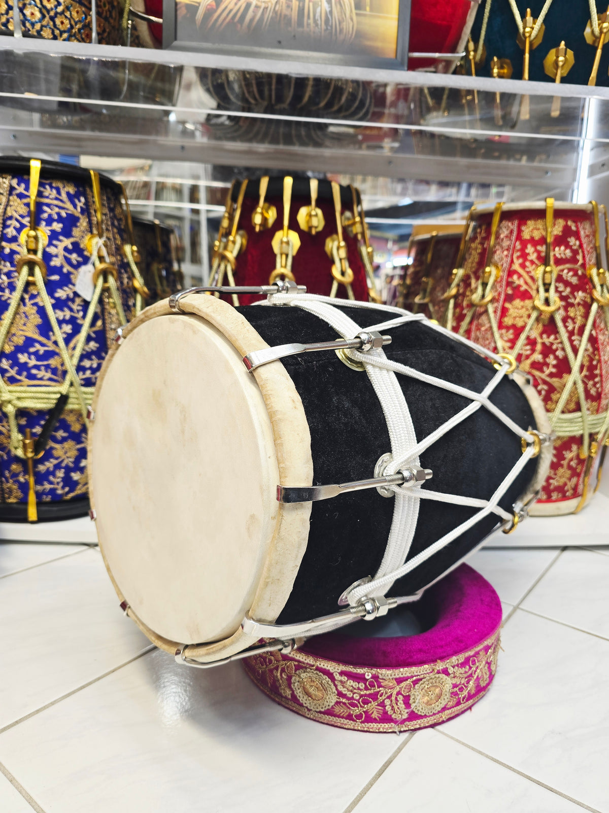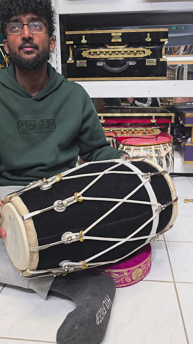 This West Indian–style dholak is crafted from solid mango wood and finished in a classic black velvet wrap, producing a deep, balanced bass with clear, responsive highs. Measuring 19.25" in length and weighing 14.2 lbs, it offers excellent comfort, projection, and control for extended playing sessions. This configuration features normal dholak skins for a fuller, more traditional feel, with very minor cosmetic blemishes on the skin only that do not affect sound or performance. The rope lacing is purely aesthetic, maintaining a clean traditional profile, while metal bolt tuning manages all pitch adjustments for stable, reliable tuning across varying environments.