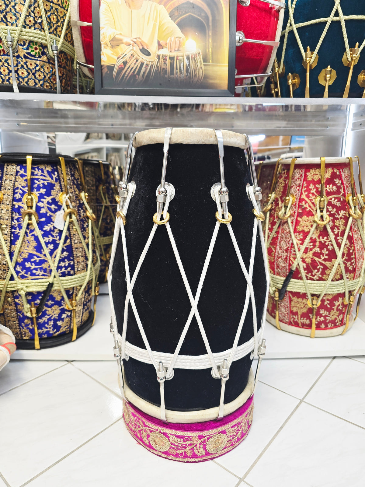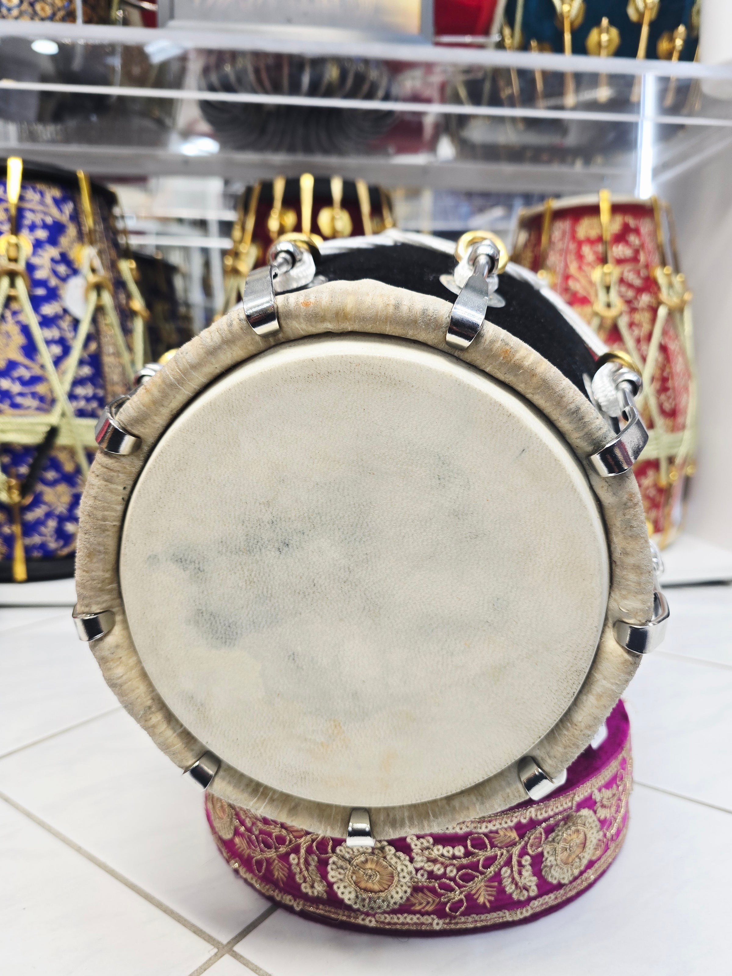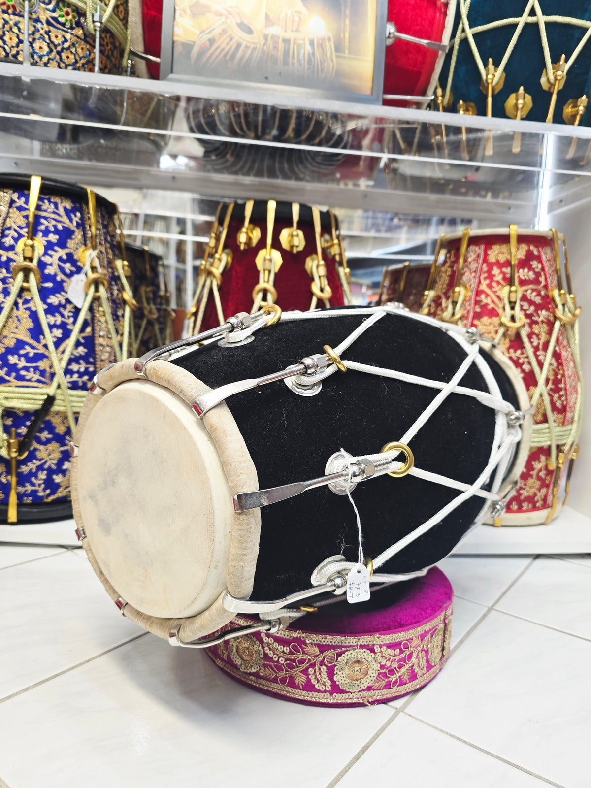 This West Indian–style dholak is crafted from solid mango wood and finished in a classic black velvet wrap, producing a deep, balanced bass with clear, responsive highs. Measuring 19.25" in length and weighing 14.2 lbs, it offers excellent comfort, projection, and control for extended playing sessions. This configuration features normal dholak skins for a fuller, more traditional feel, with very minor cosmetic blemishes on the skin only that do not affect sound or performance. The rope lacing is purely aesthetic, maintaining a clean traditional profile, while metal bolt tuning manages all pitch adjustments for stable, reliable tuning across varying environments.