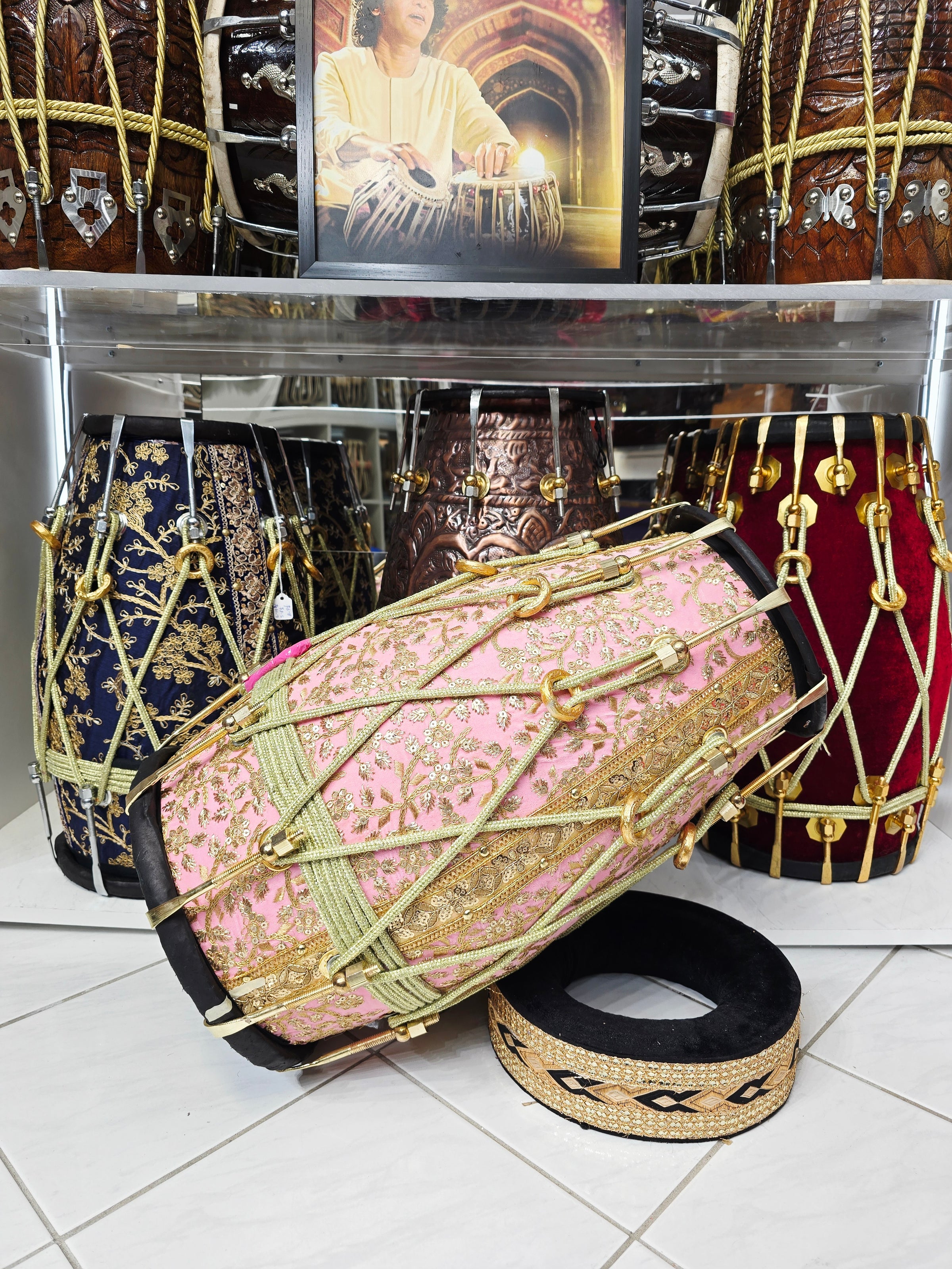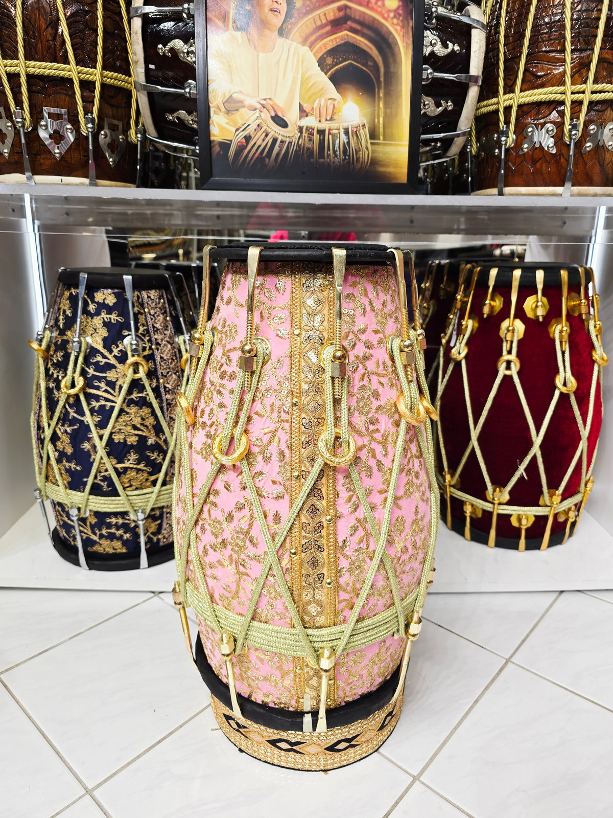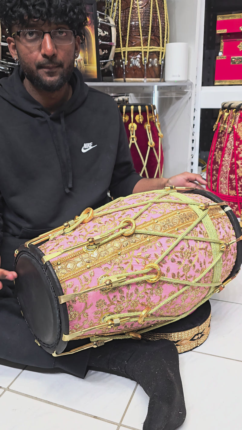 The Gulzar Rosé features a solid red sheesham wood body dressed in a refined pink sherwani fabric with detailed gold embroidery, giving it a soft yet regal presence that stands out immediately on stage or in a ceremonial setting.