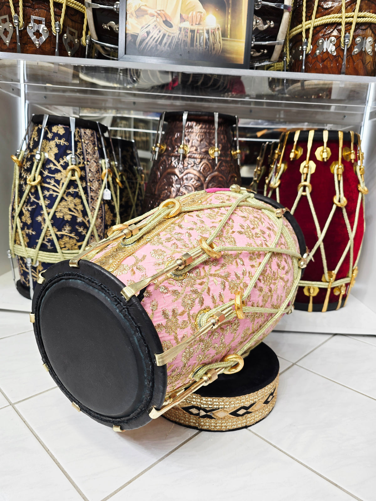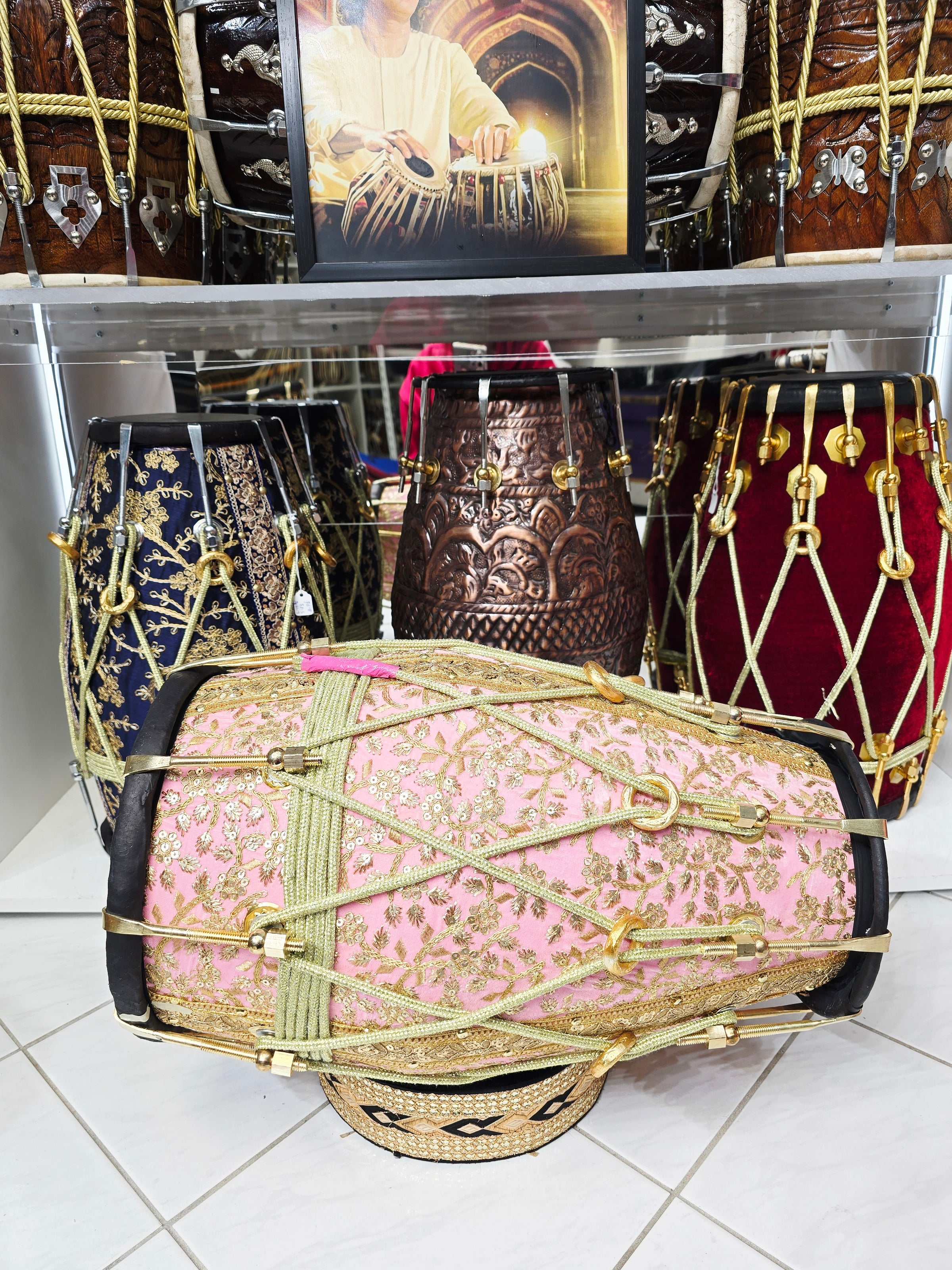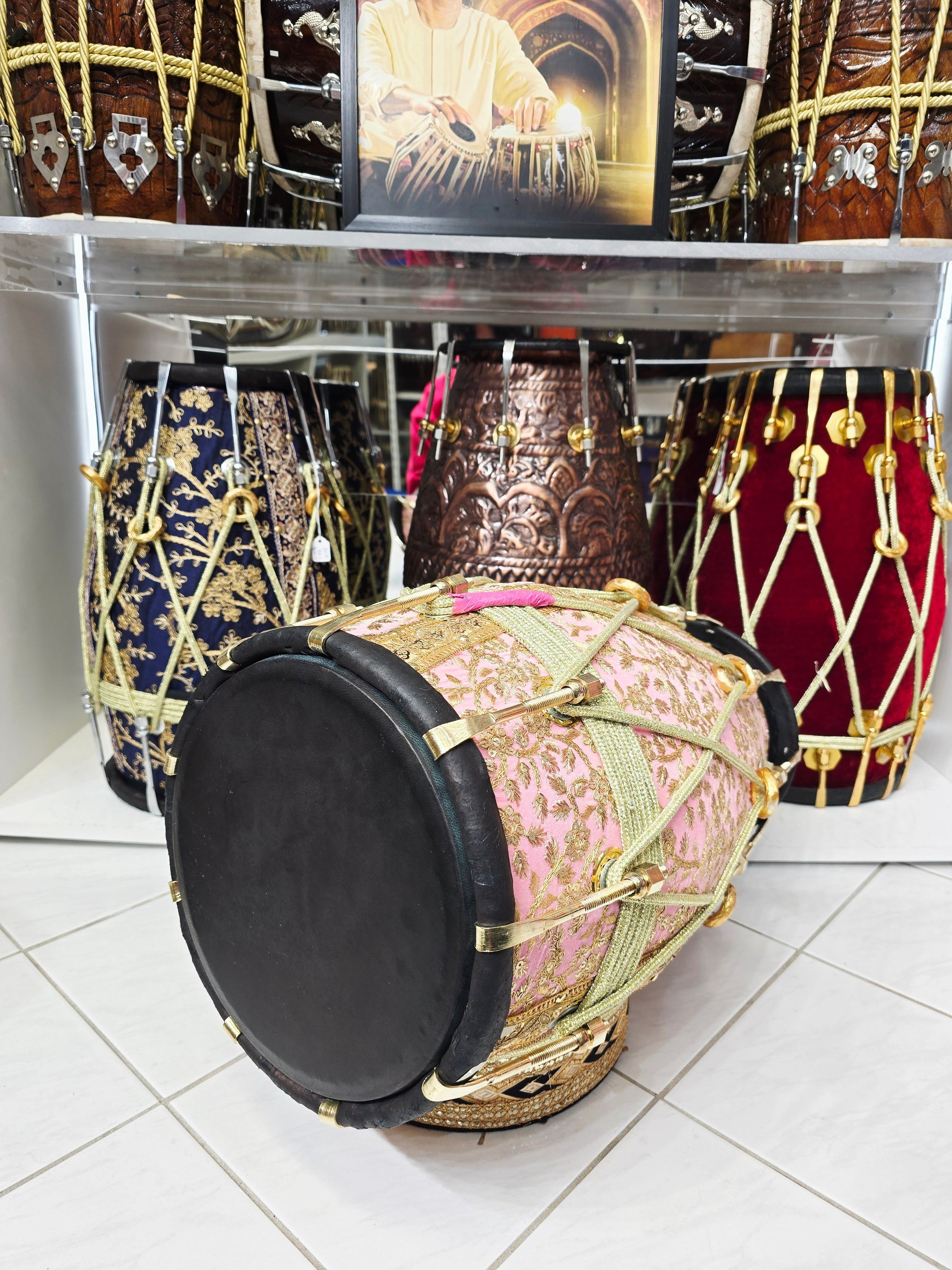 The Gulzar Rosé features a solid red sheesham wood body dressed in a refined pink sherwani fabric with detailed gold embroidery, giving it a soft yet regal presence that stands out immediately on stage or in a ceremonial setting.