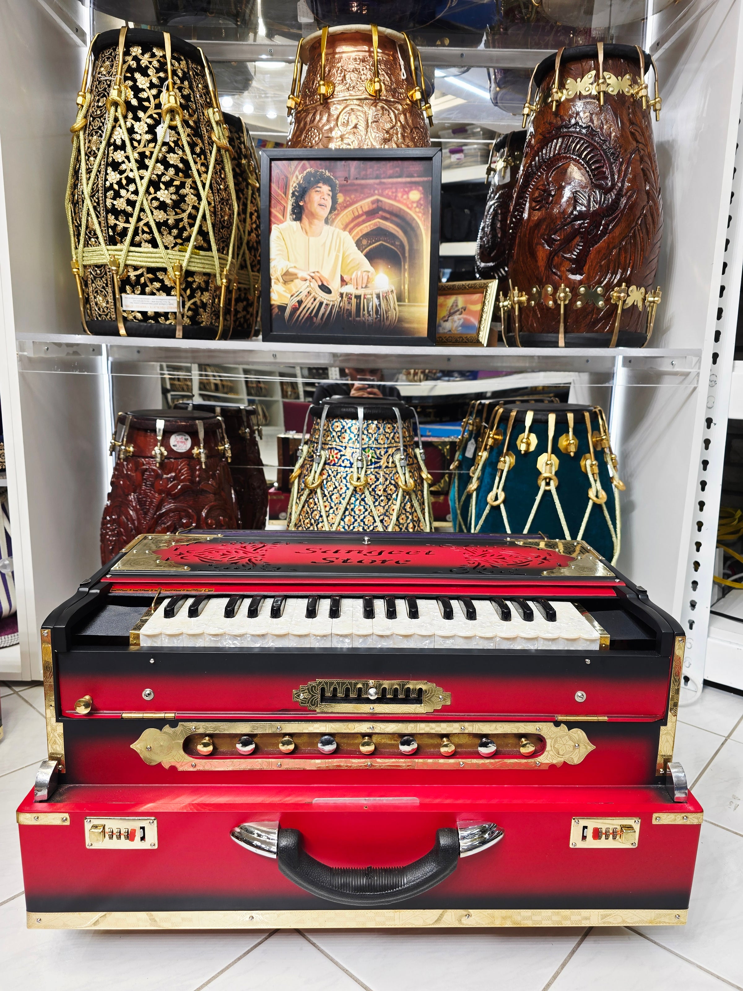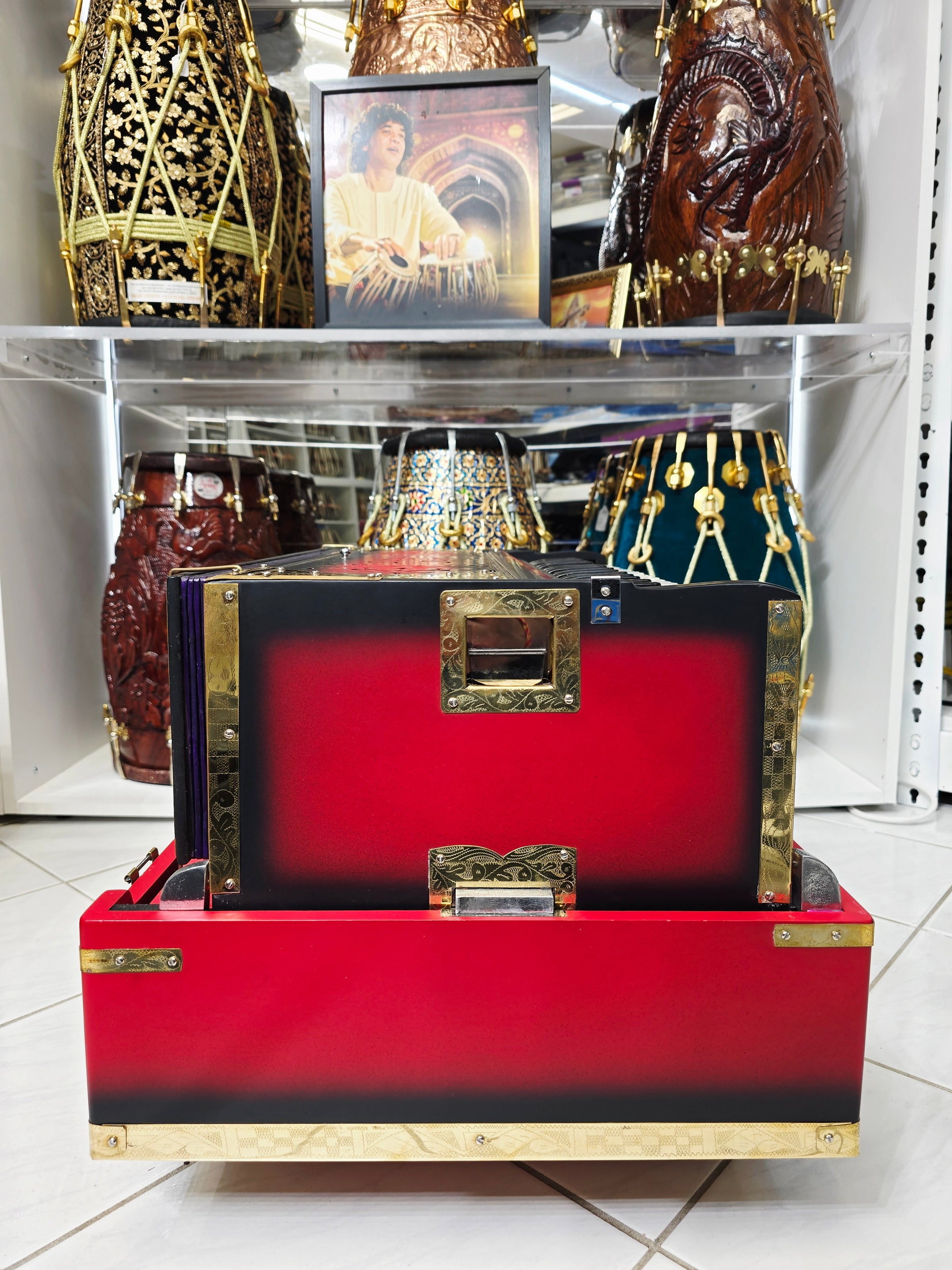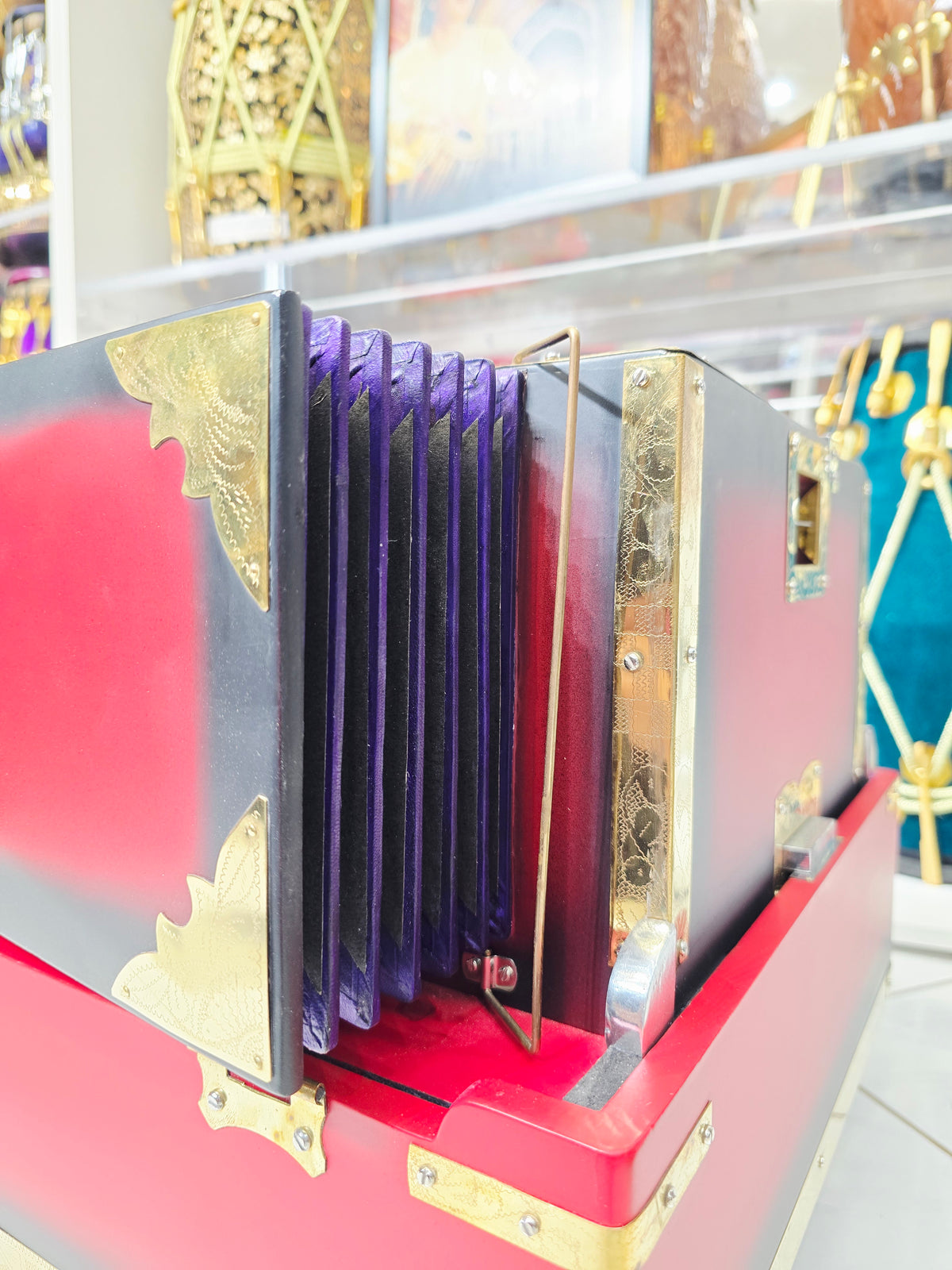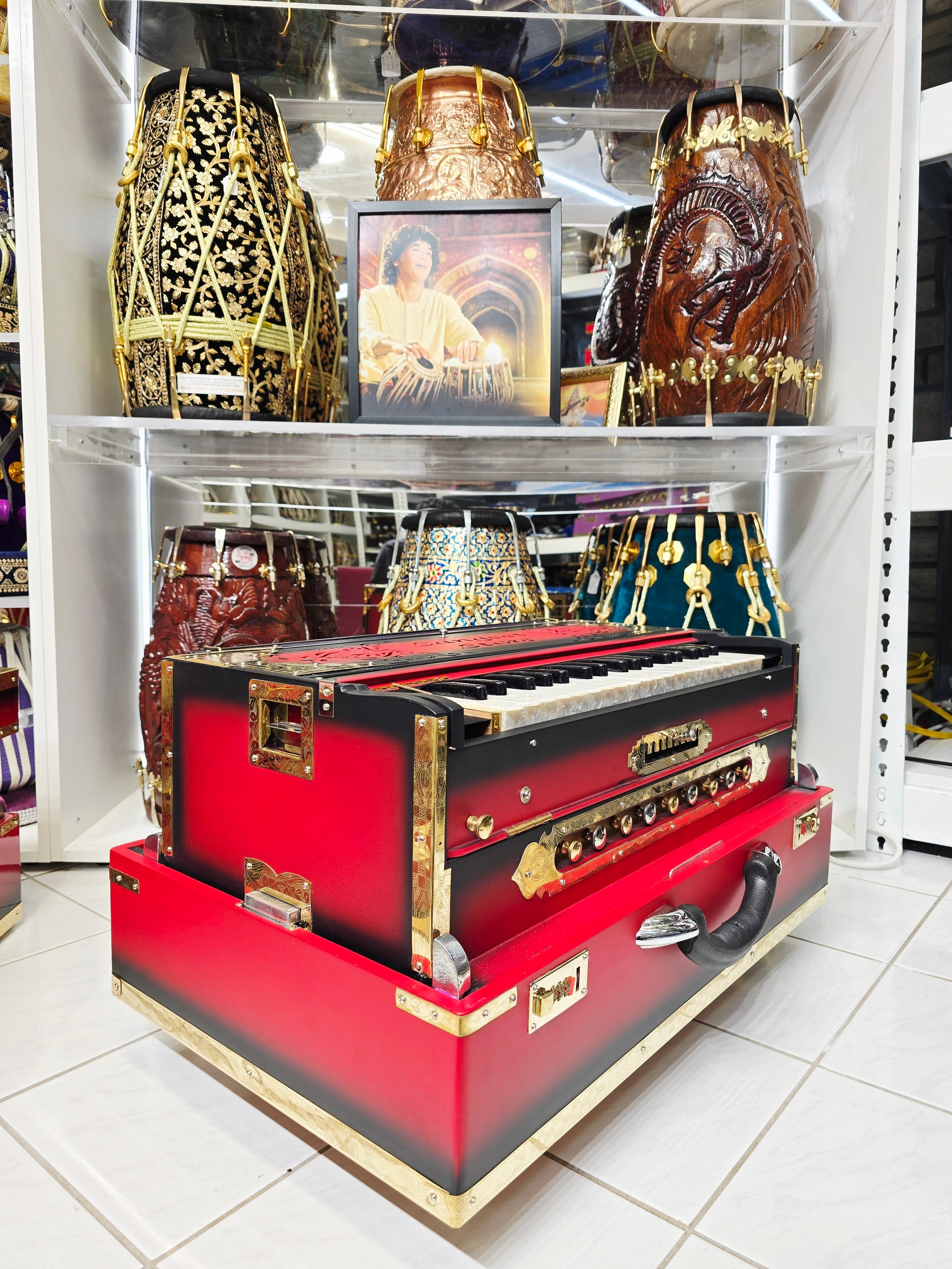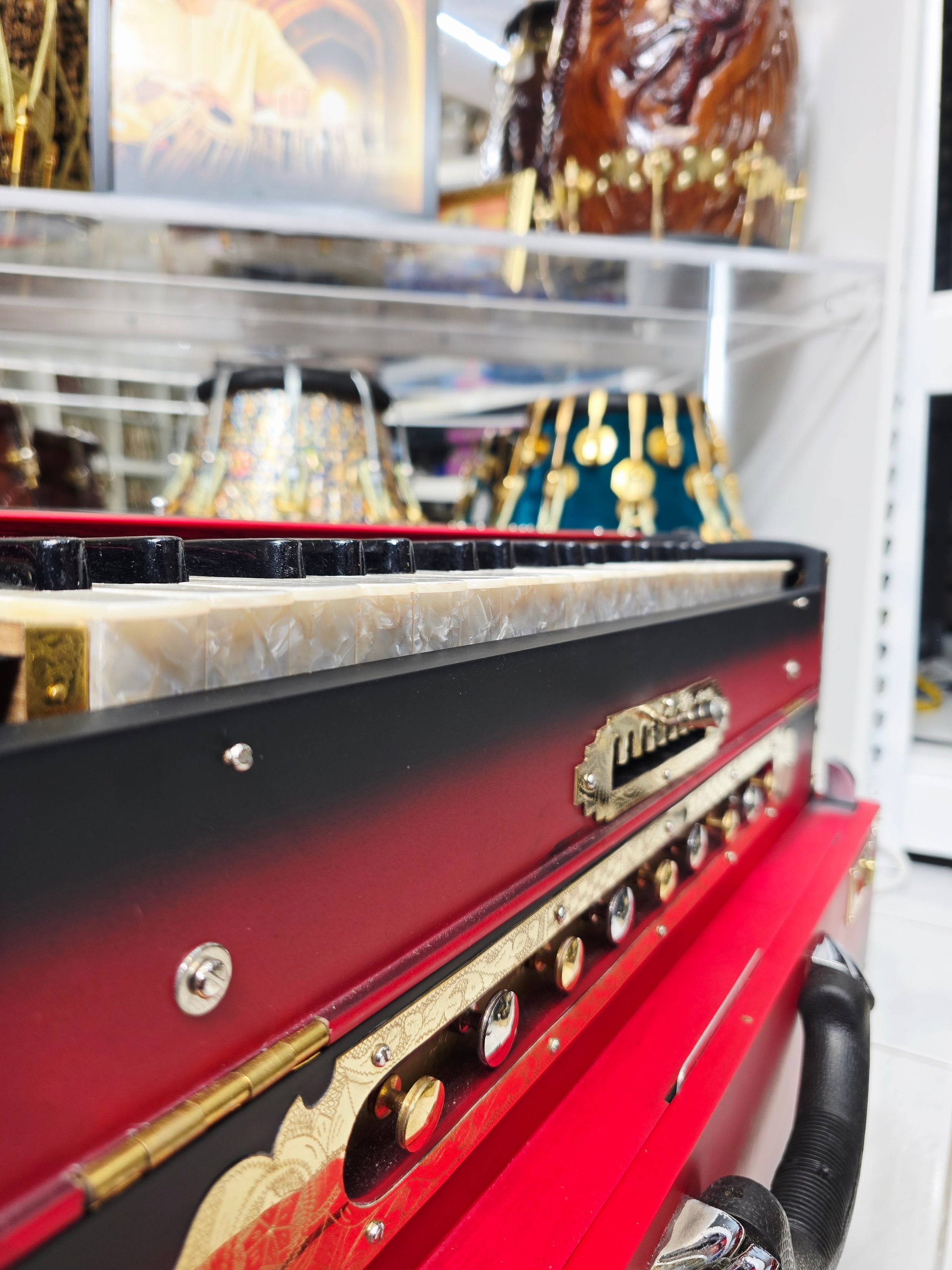 The Rakt Raag harmonium fuses bold aesthetics with classical versatility. Cloaked in a striking matte red-and-black blend, this powerhouse 3-reed (Bass, Male, Female) scale changer delivers resonant depth and dynamic range ideal for both studio and stage.