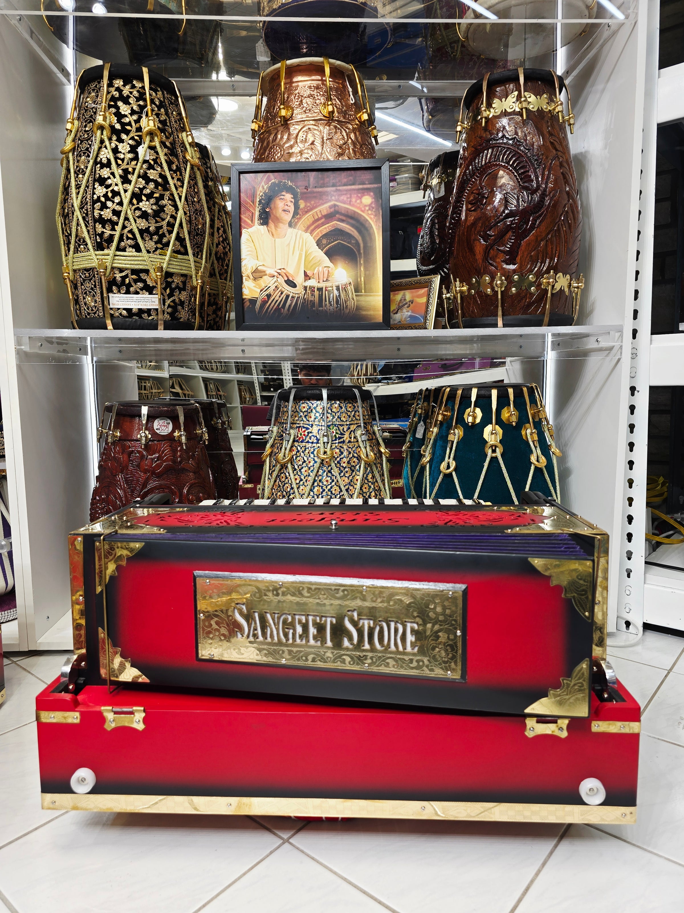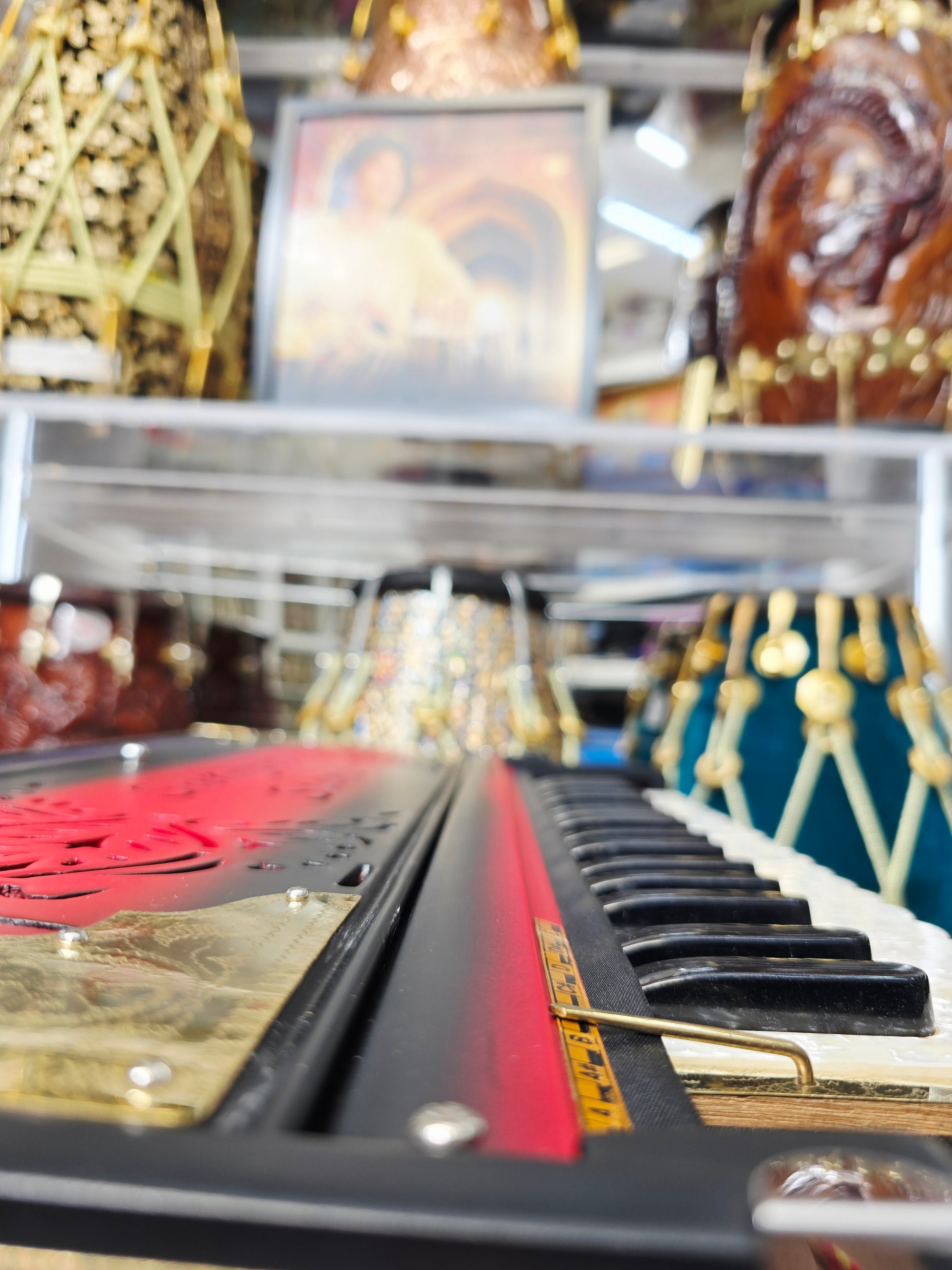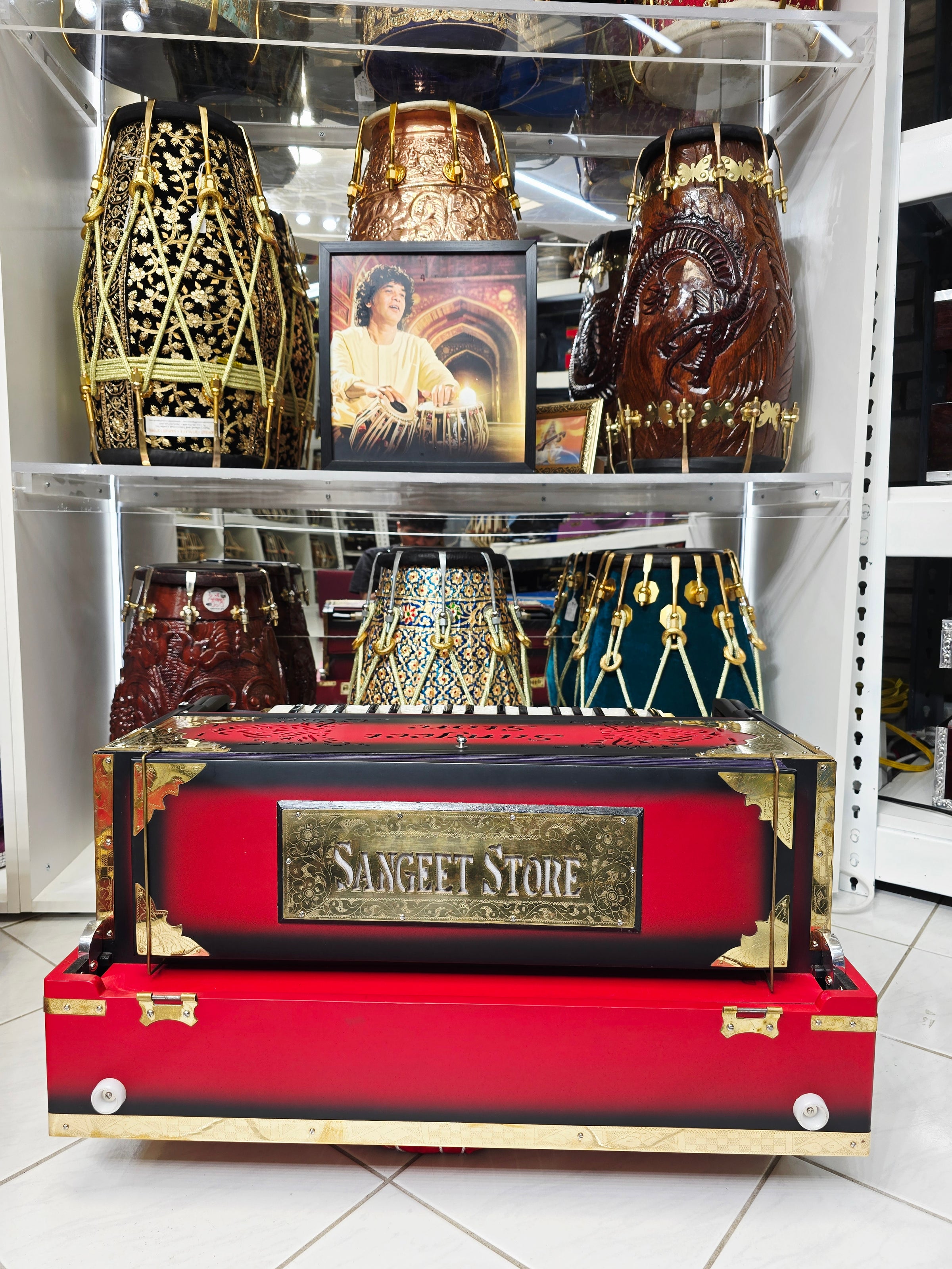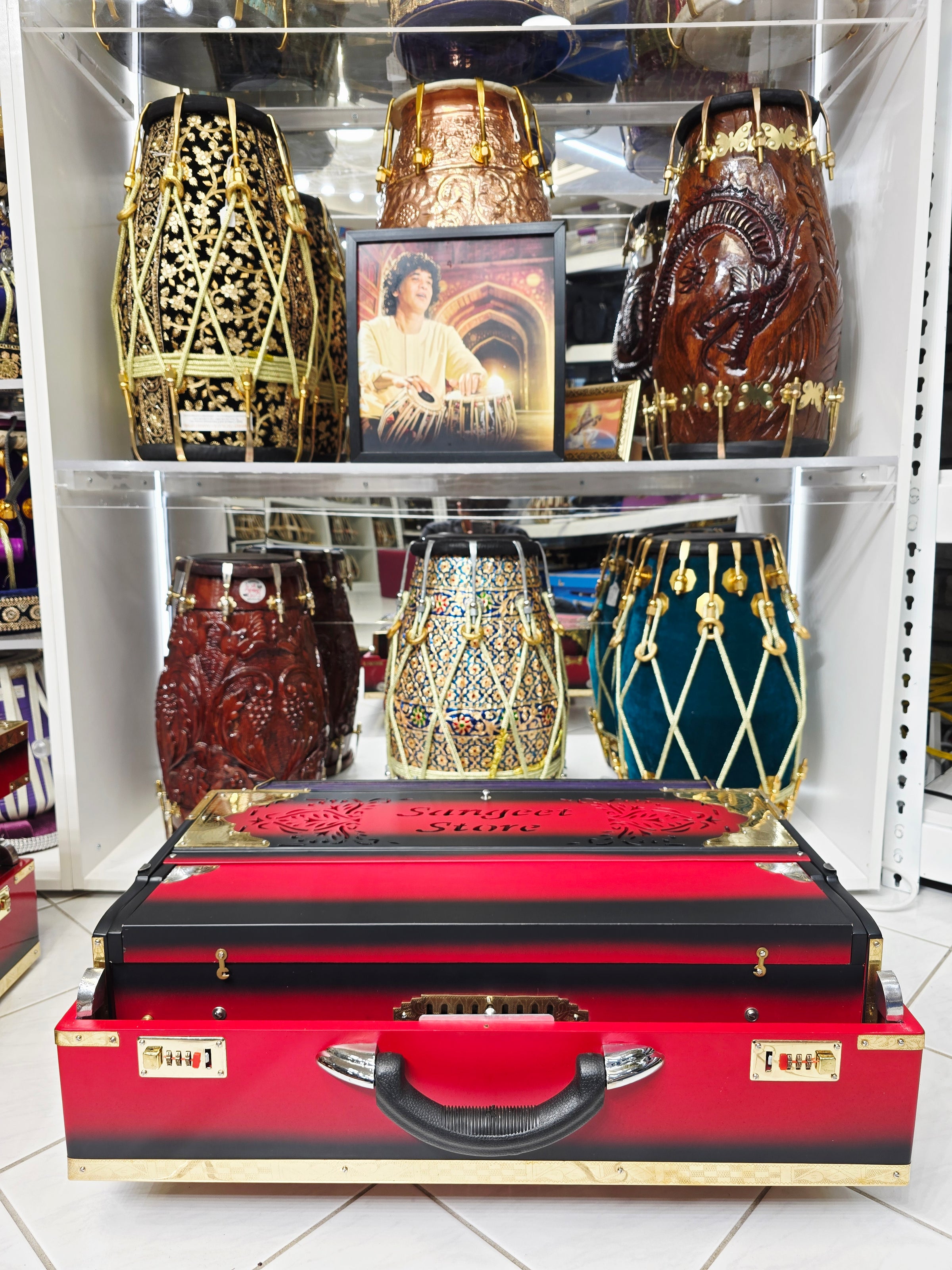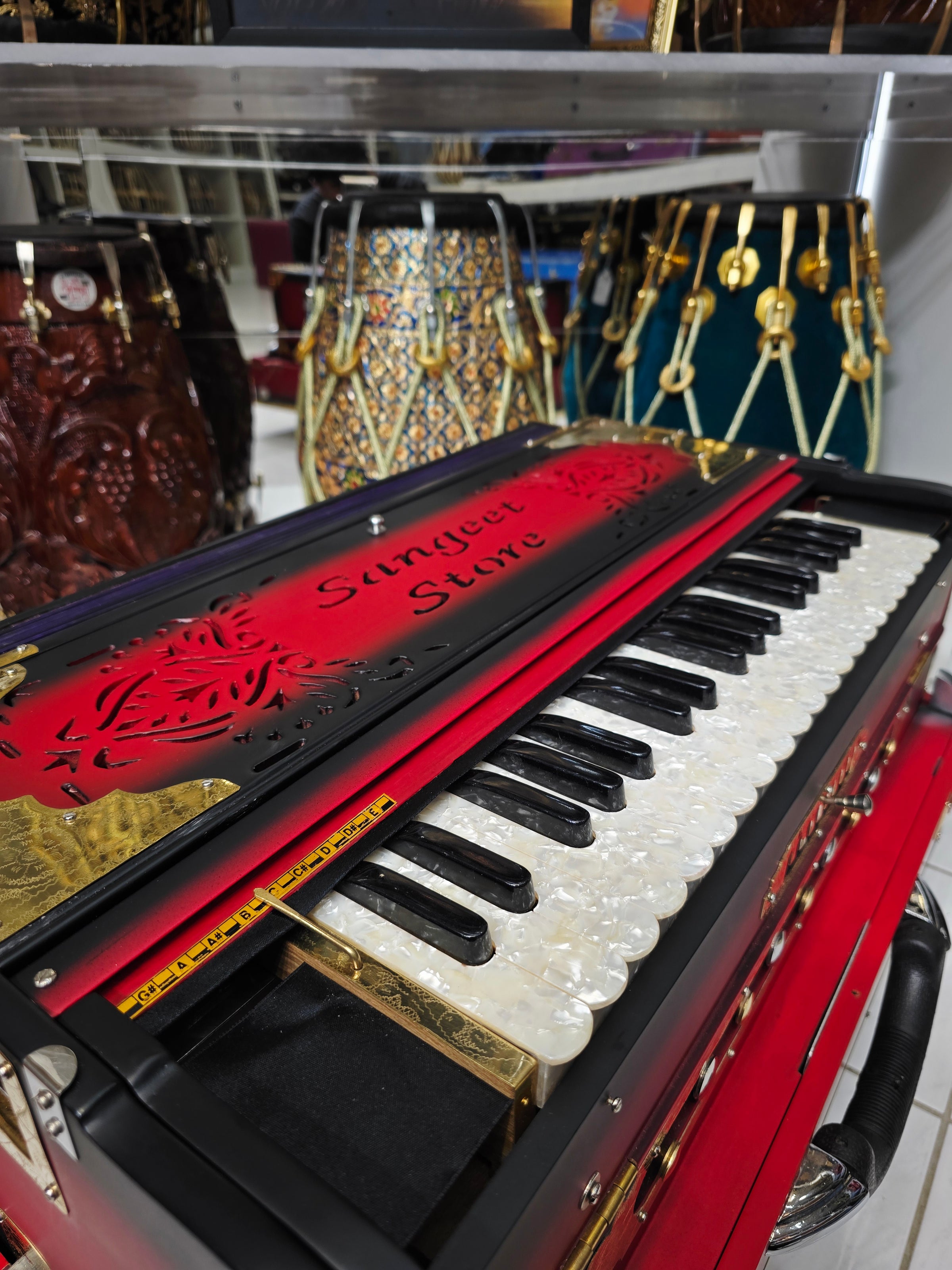 The Rakt Raag harmonium fuses bold aesthetics with classical versatility. Cloaked in a striking matte red-and-black blend, this powerhouse 3-reed (Bass, Male, Female) scale changer delivers resonant depth and dynamic range ideal for both studio and stage.