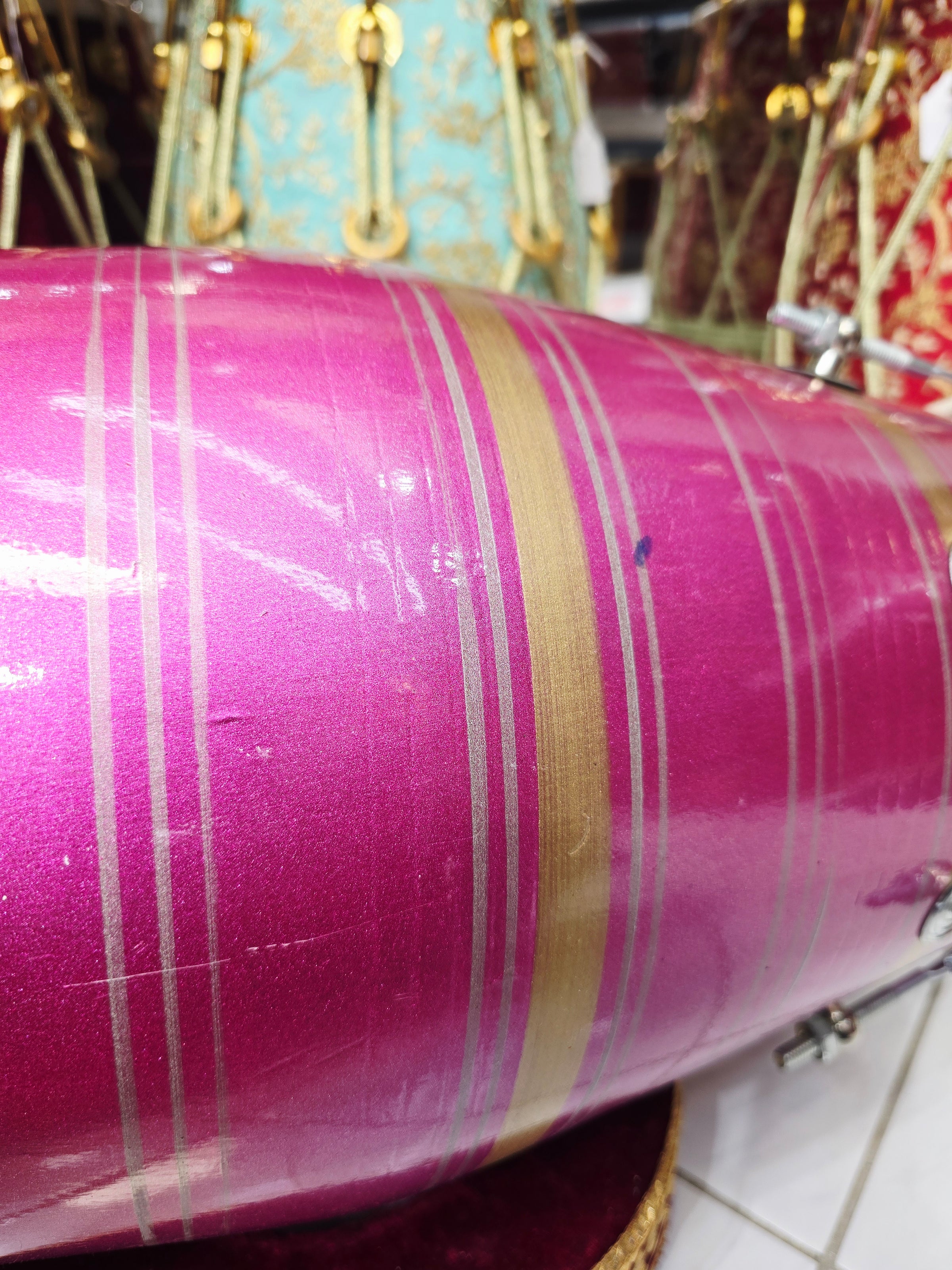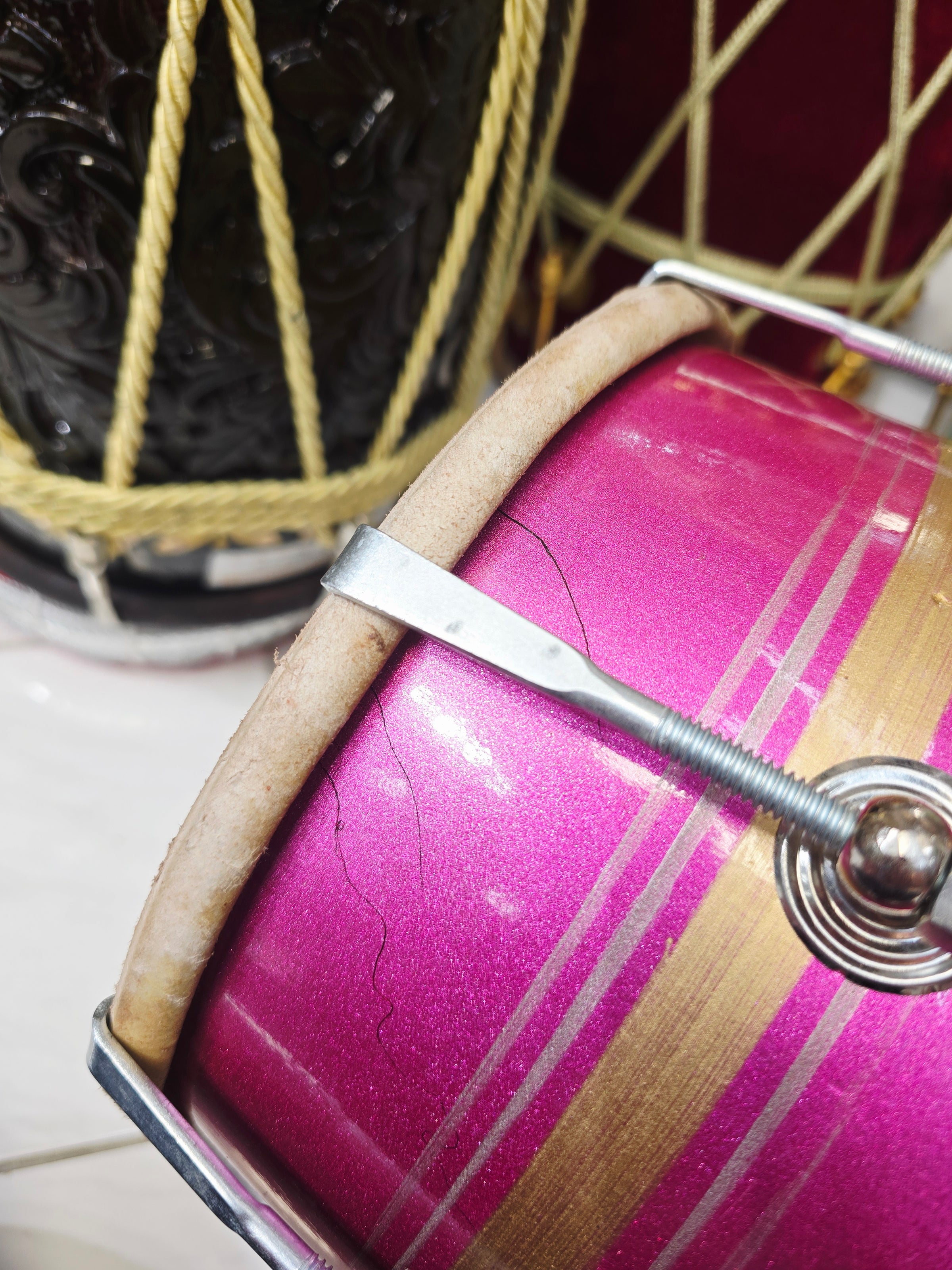 The Blush Taal offers the same design as the Rose Rhythm — a pink painted red sheesham student-quality dholak fitted with chrome bolts and a side handle for convenience. This edition carries cosmetic defects, including a minor external crack, which do not affect its core durability or playability. Best suited for students and casual practice, the Blush Taal maintains a bright, cheerful aesthetic while providing reliable functionality at a more accessible value.