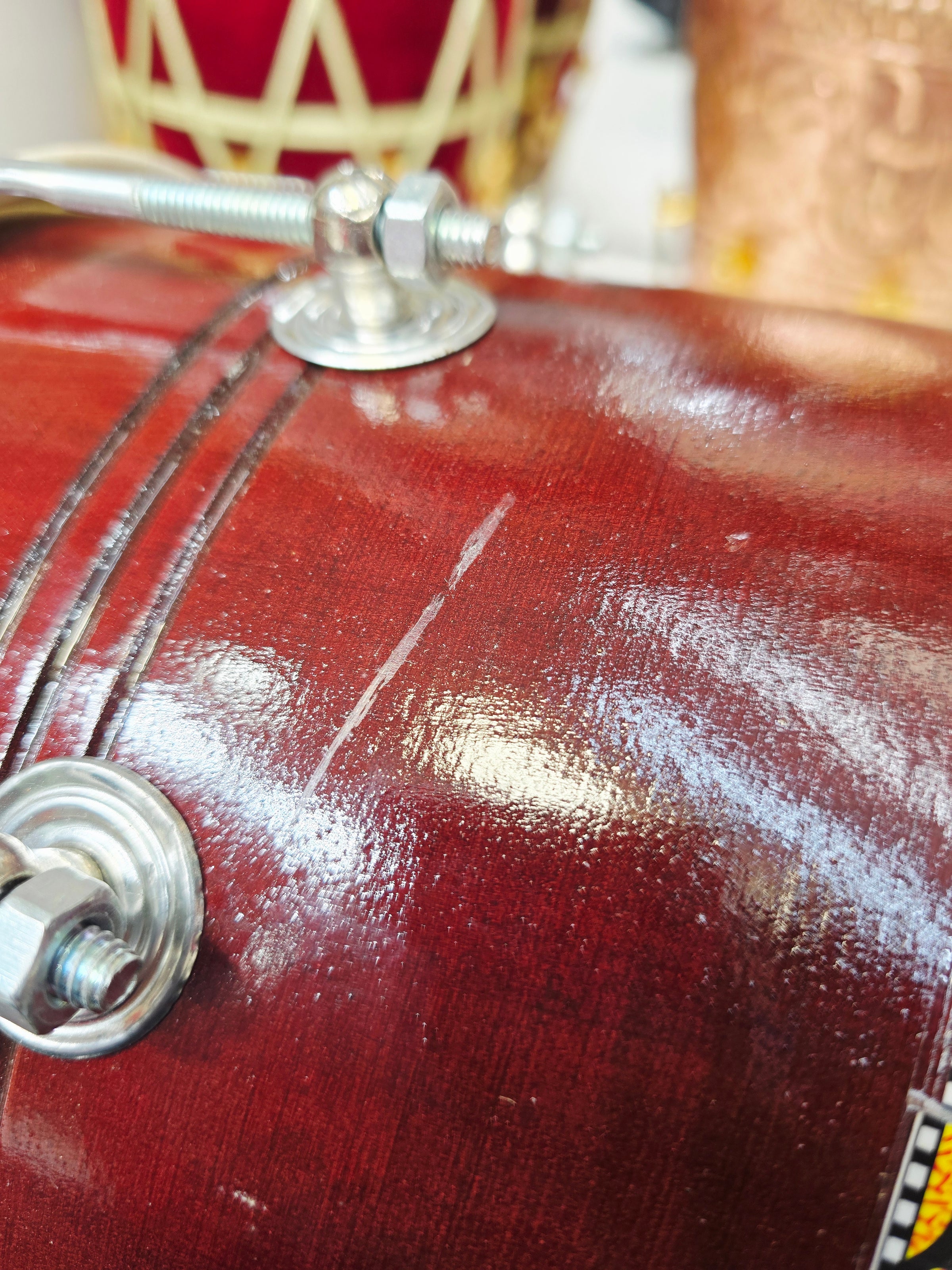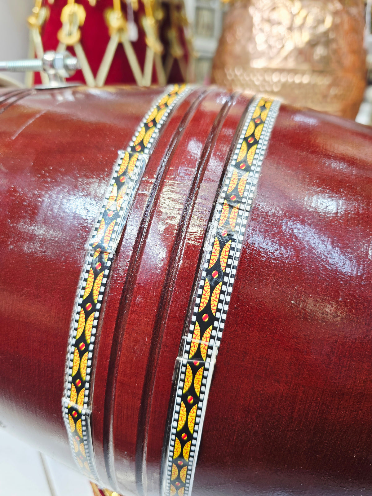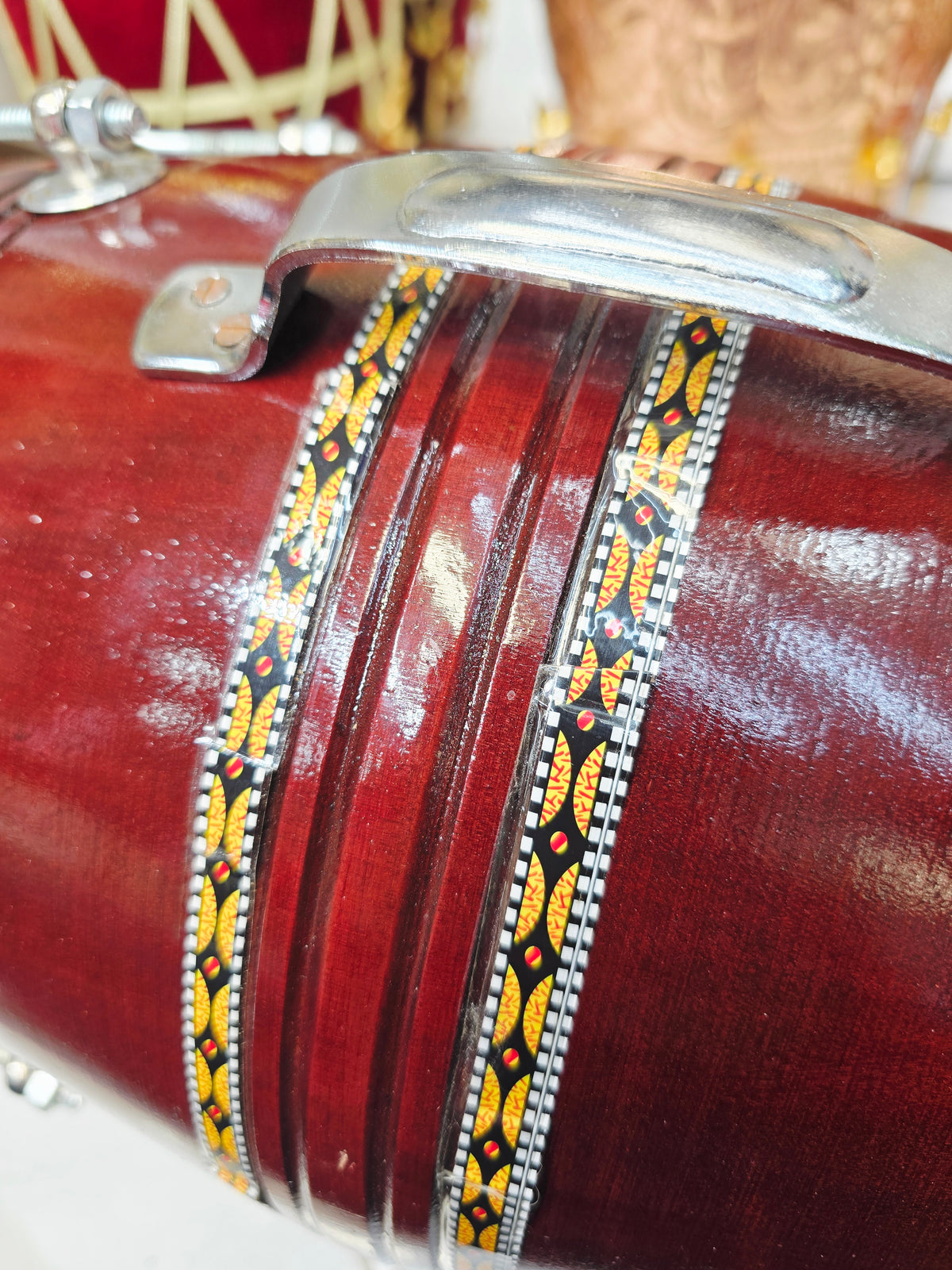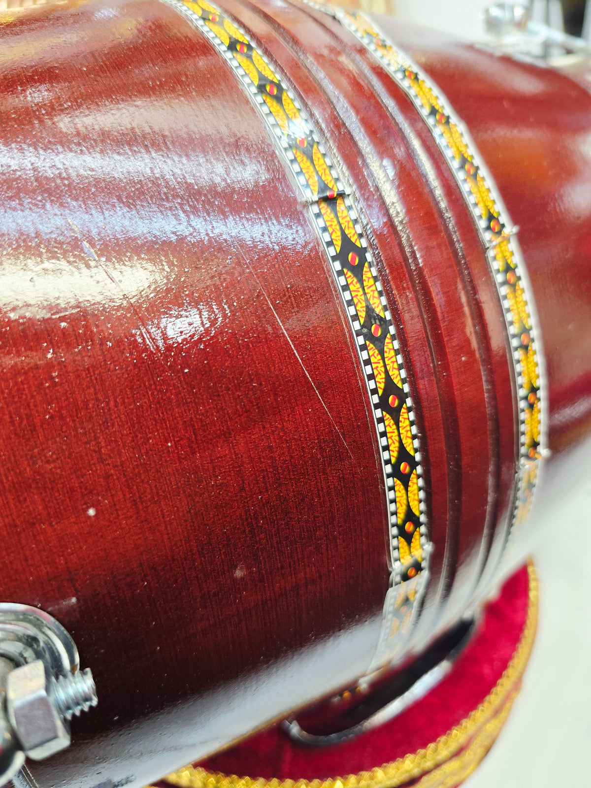 The Rustic Reinforced Dholak is a traditional red sheesham wood instrument with a classic brown finish, designed for musicians who value both durability and authenticity. Featuring metal rings around the rims for added structural strength, chrome tuning bolts for precise adjustments, and a sturdy metal handle for easy transport, this dholak is built to last. Its deep bass and crisp treble tones make it ideal for folk, devotional, and casual performances. While minor cosmetic defects give each piece its own unique character, they do not affect the instrument’s playability, making it a reliable choice for students and performers alike.