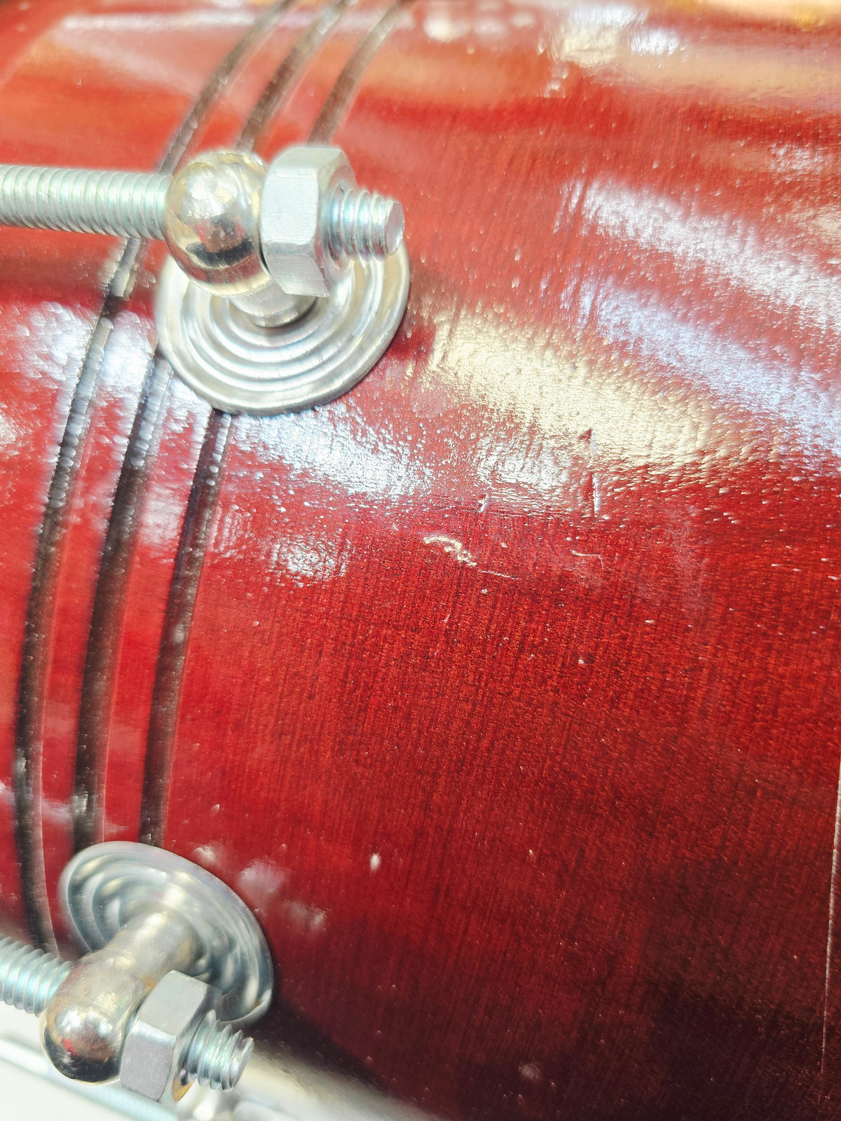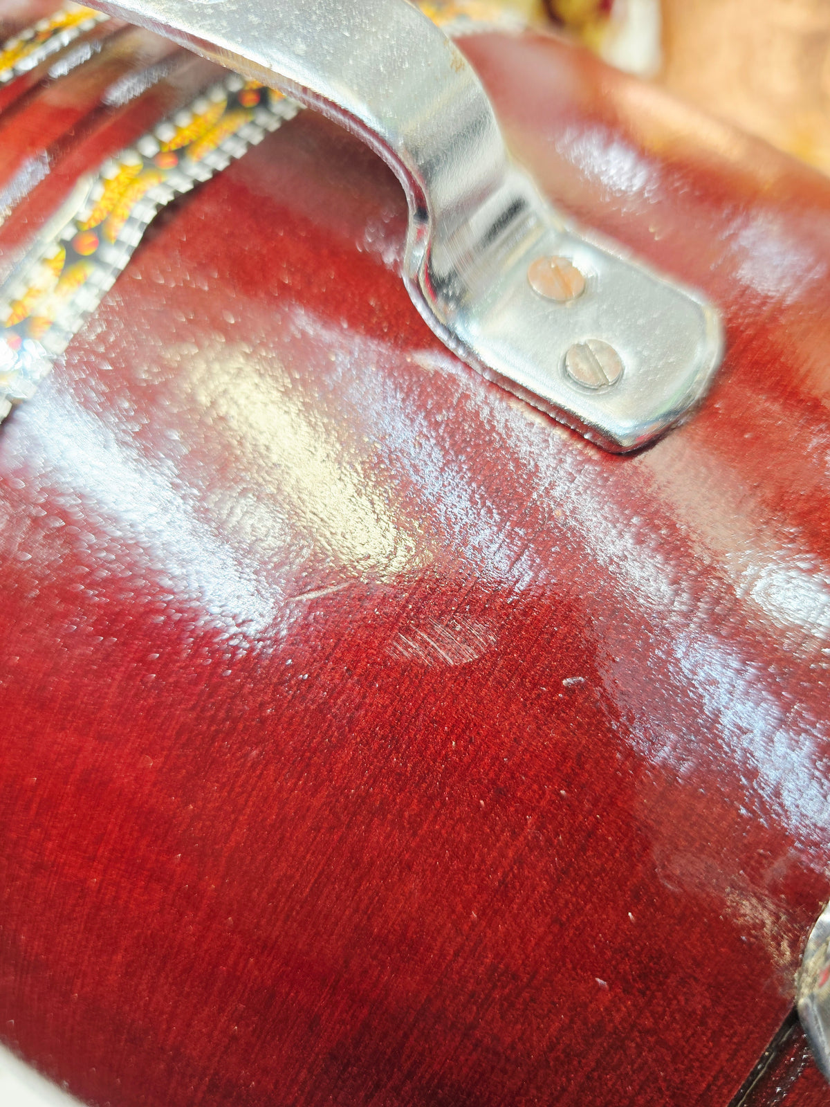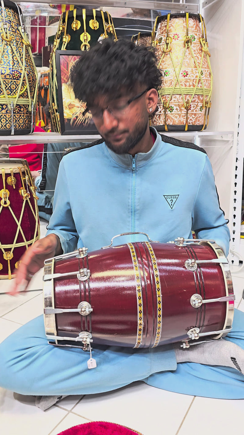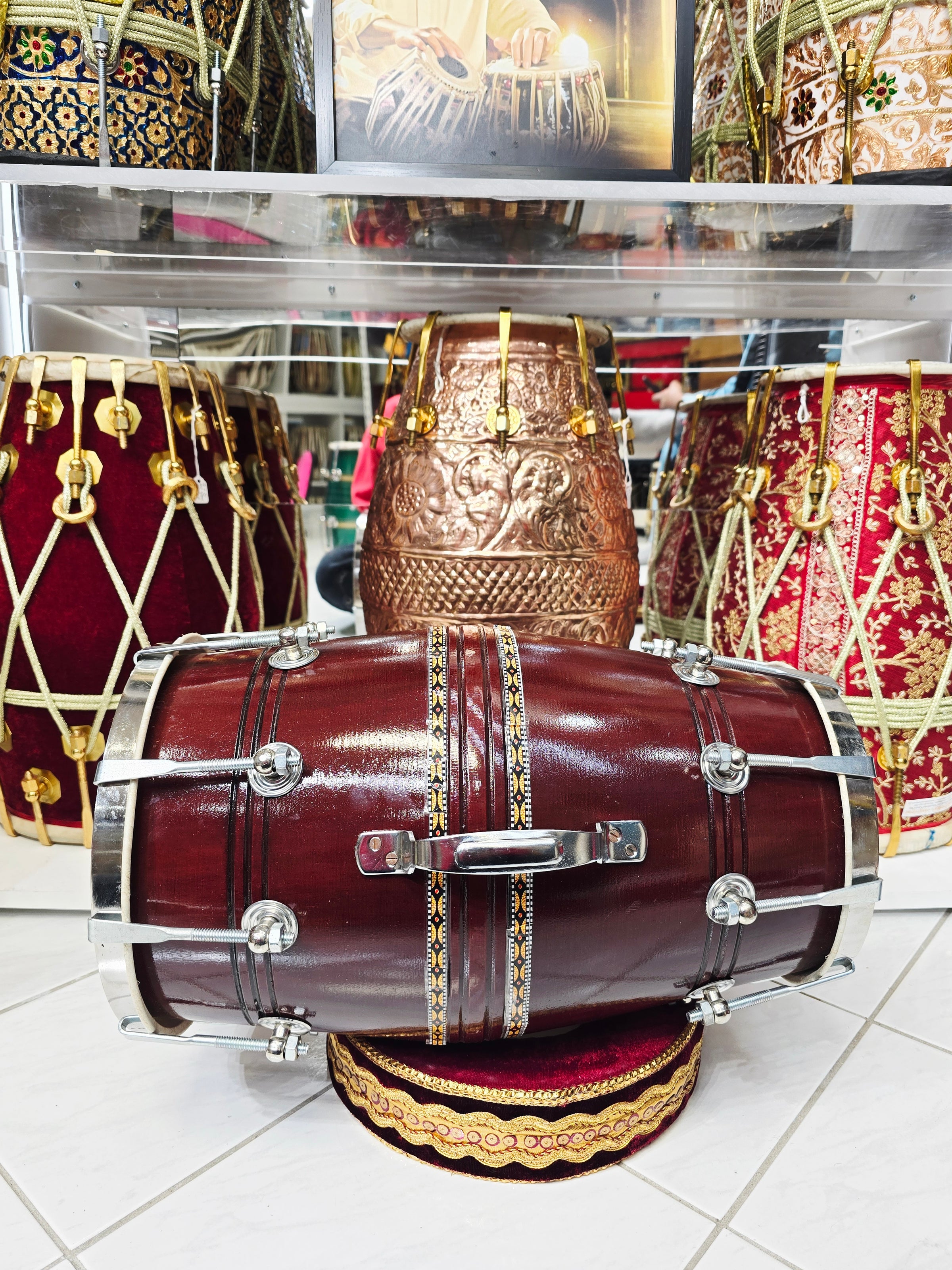 The Rustic Reinforced Dholak is a traditional red sheesham wood instrument with a classic brown finish, designed for musicians who value both durability and authenticity. Featuring metal rings around the rims for added structural strength, chrome tuning bolts for precise adjustments, and a sturdy metal handle for easy transport, this dholak is built to last. Its deep bass and crisp treble tones make it ideal for folk, devotional, and casual performances. While minor cosmetic defects give each piece its own unique character, they do not affect the instrument’s playability, making it a reliable choice for students and performers alike.