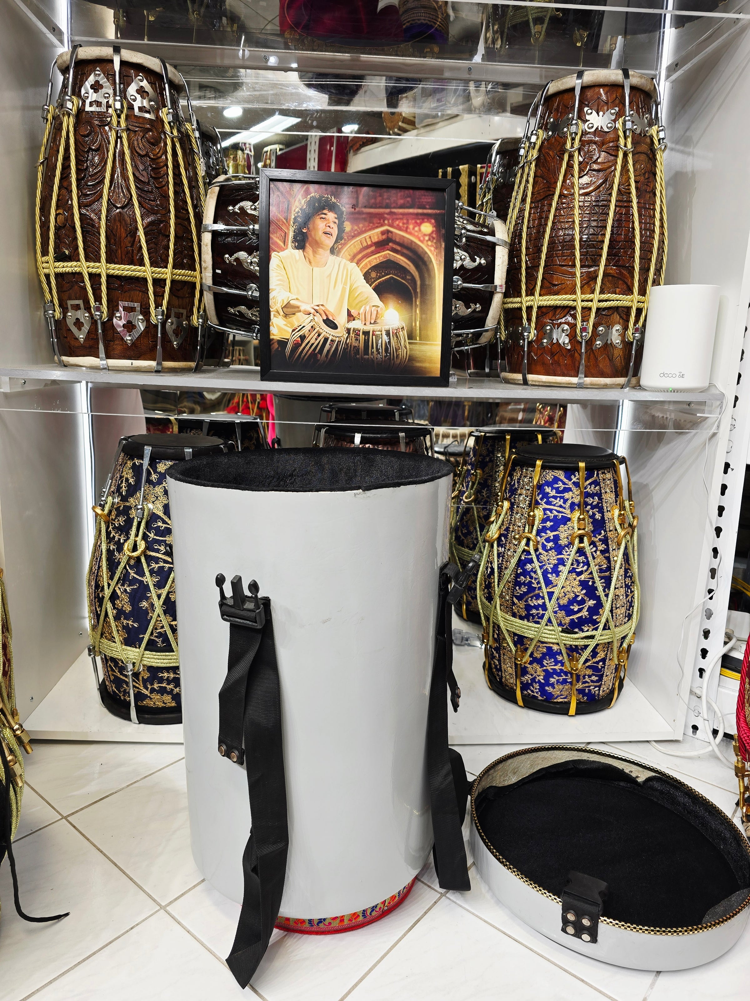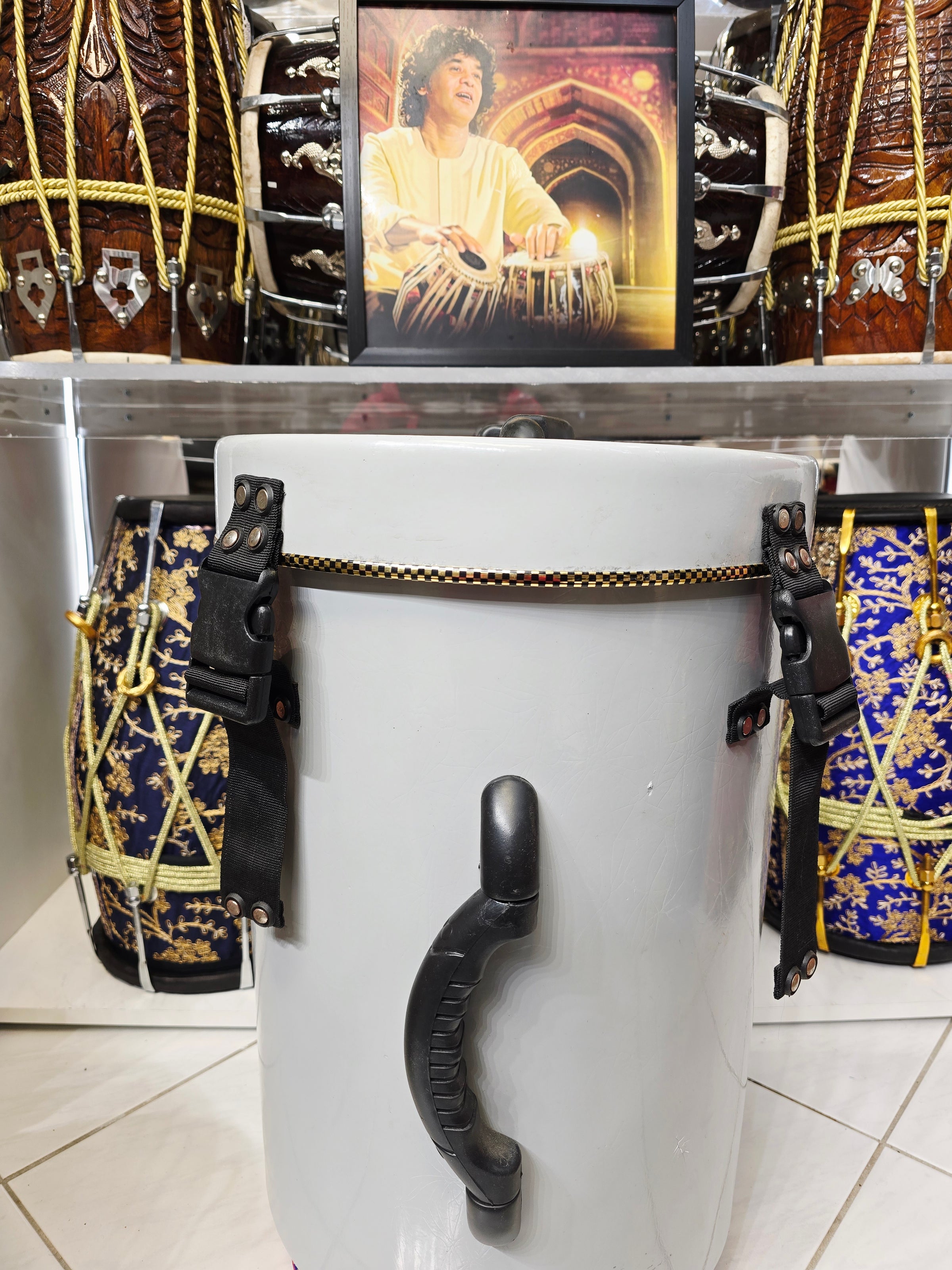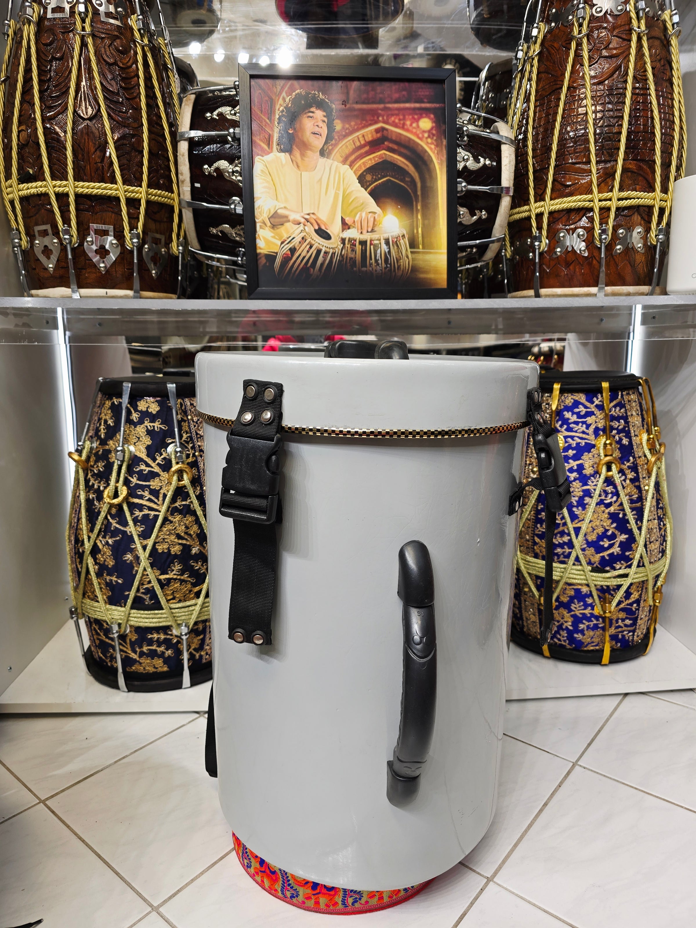 This rigid dholak hard case features a smooth ash-grey exterior with a reinforced cylindrical build designed for dependable protection during transport and storage. Built to fit dholaks 18″ and under, it’s secured with 4 heavy-duty buckles and equipped with dual side handles for balanced carrying.