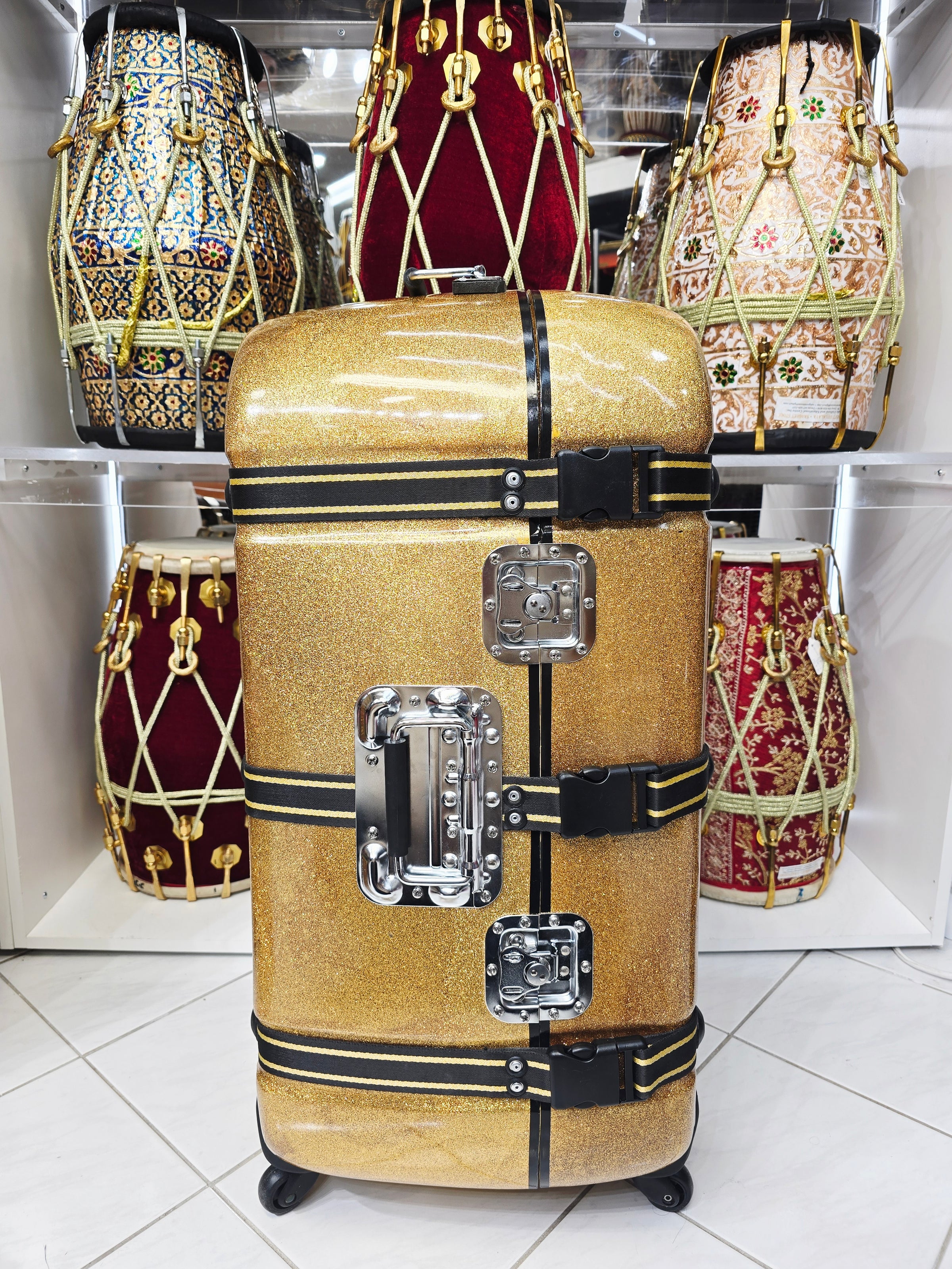 The Golden Voyager is a premium sparkle-finished travel case designed to protect tabla and dholak instruments with maximum durability and style. Built with a reinforced hard-shell body, secure locking latches, and protective edge guards, it ensures your instruments remain safe during airline travel, road gigs, and studio transport. The 360° wheels and sturdy side/top handles provide smooth, effortless mobility, while the gold glitter finish gives the case a striking, high-visibility look. Reliable, rugged, and visually stunning—this case is crafted for musicians who want both protection and standout presentation.