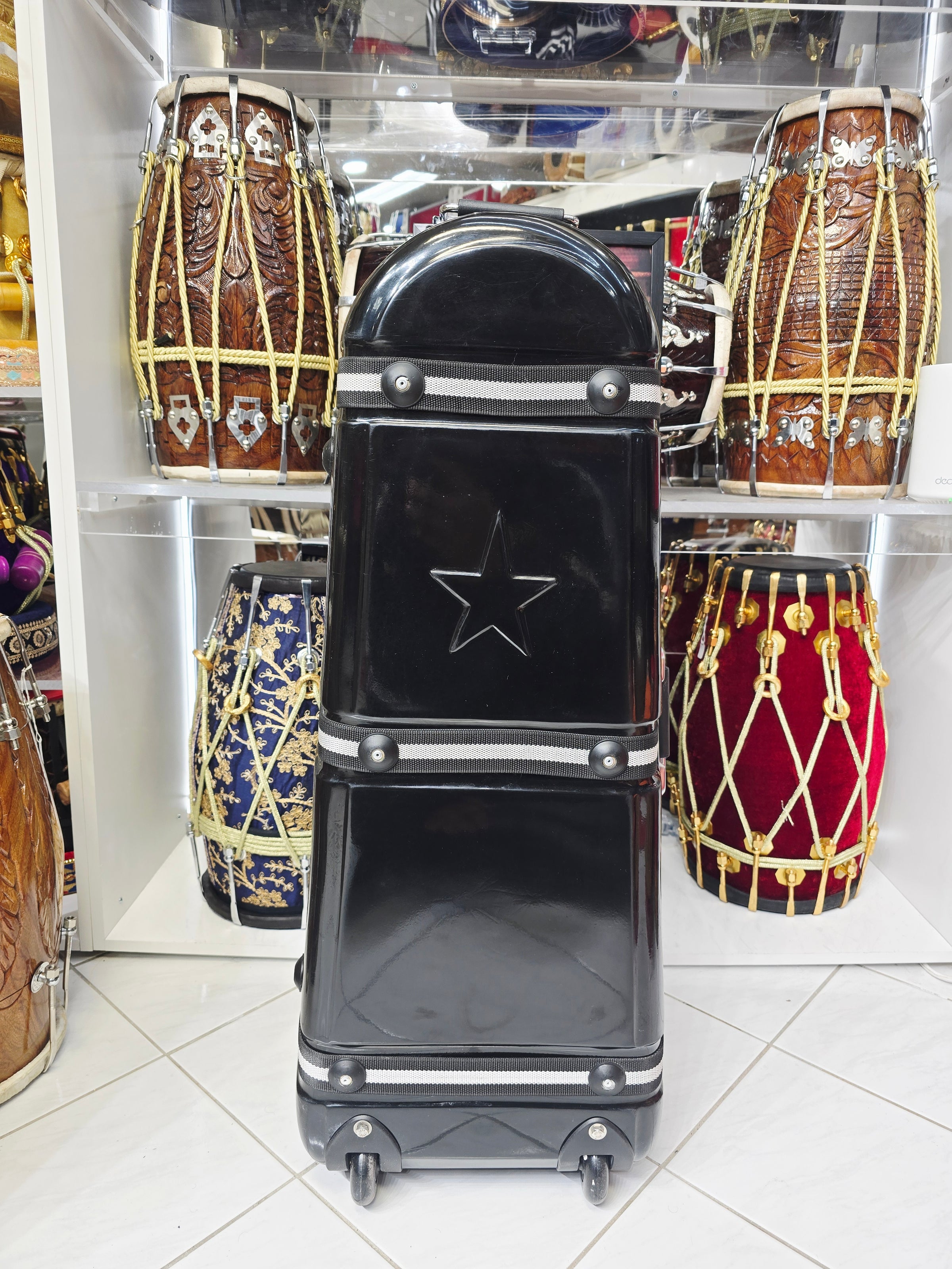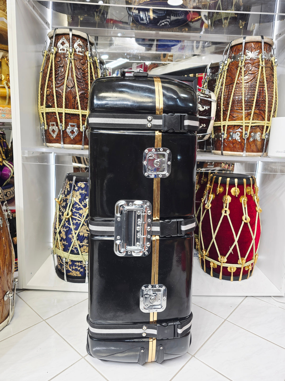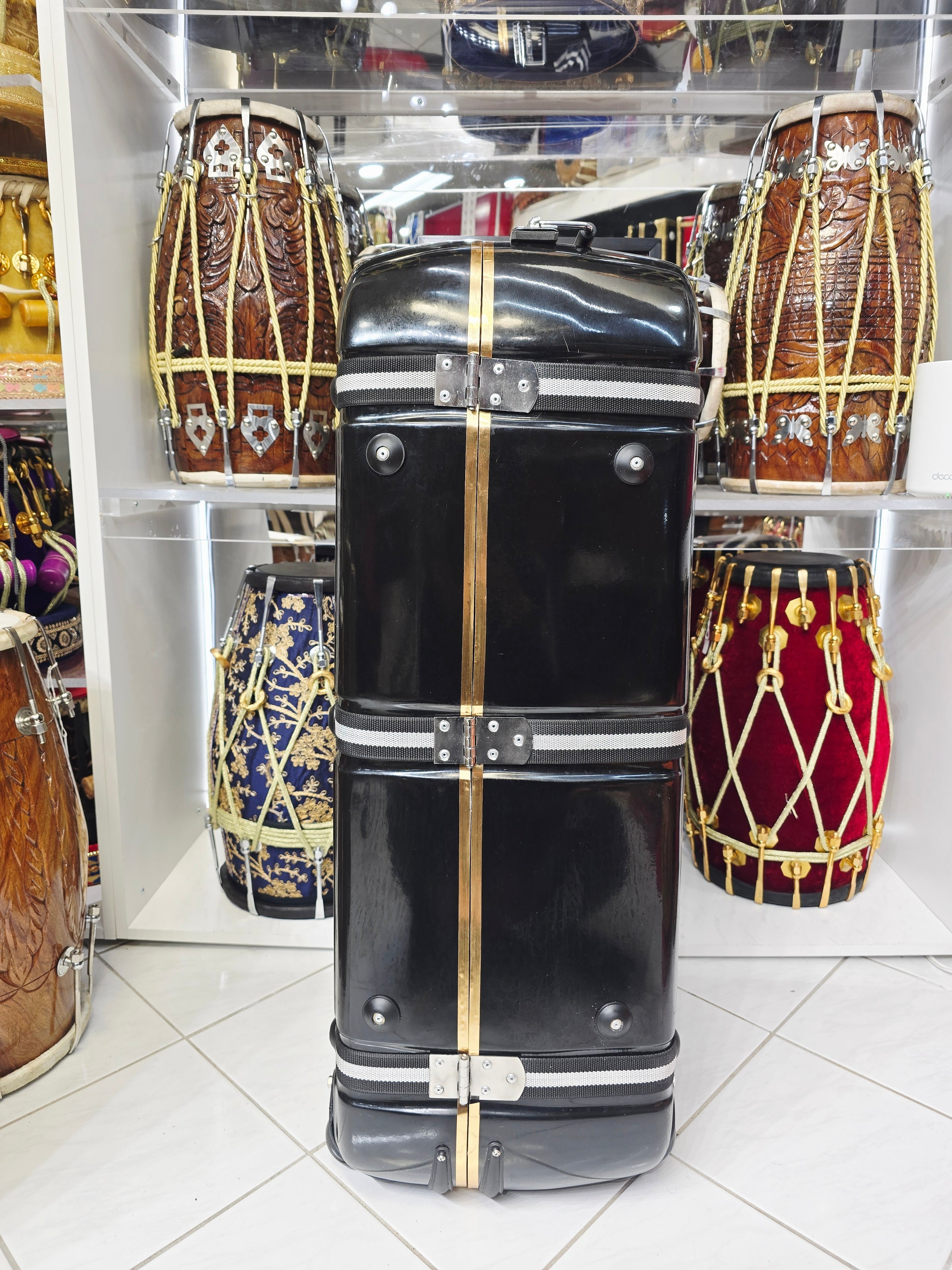 Embark on a journey with your percussion companions securely nestled within the Rhythmic Guardian, an unparalleled 3-piece tabla/dholak case designed for the discerning musician. Crafted with resilient black material and adorned with contrasting black and white straps, this case exudes elegance and functionality. It boasts two sturdy locks and three buckles ensuring utmost security for your instruments. Unveil the vibrant red felt interior, a luxurious cradle offering unparalleled protection and a touch of opulence. Equipped with two handles—vertical for easy lifting and horizontal for seamless maneuverability—and wheels for effortless transportation, this case embodies convenience and reliability. Elevate your musical experience with the epitome of style and safeguarding—the Rhythmic Guardian.