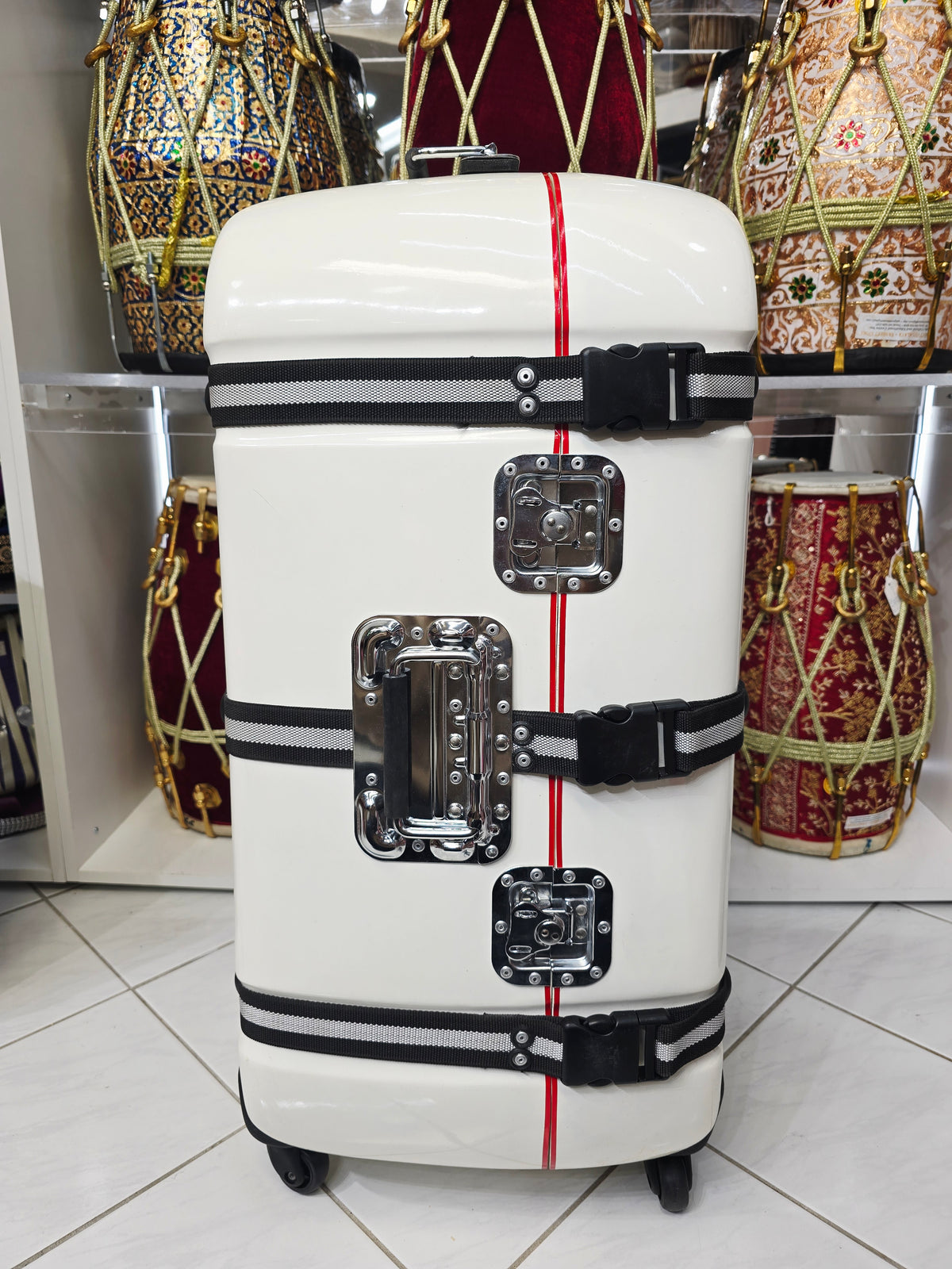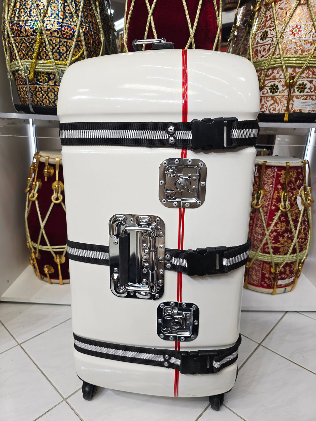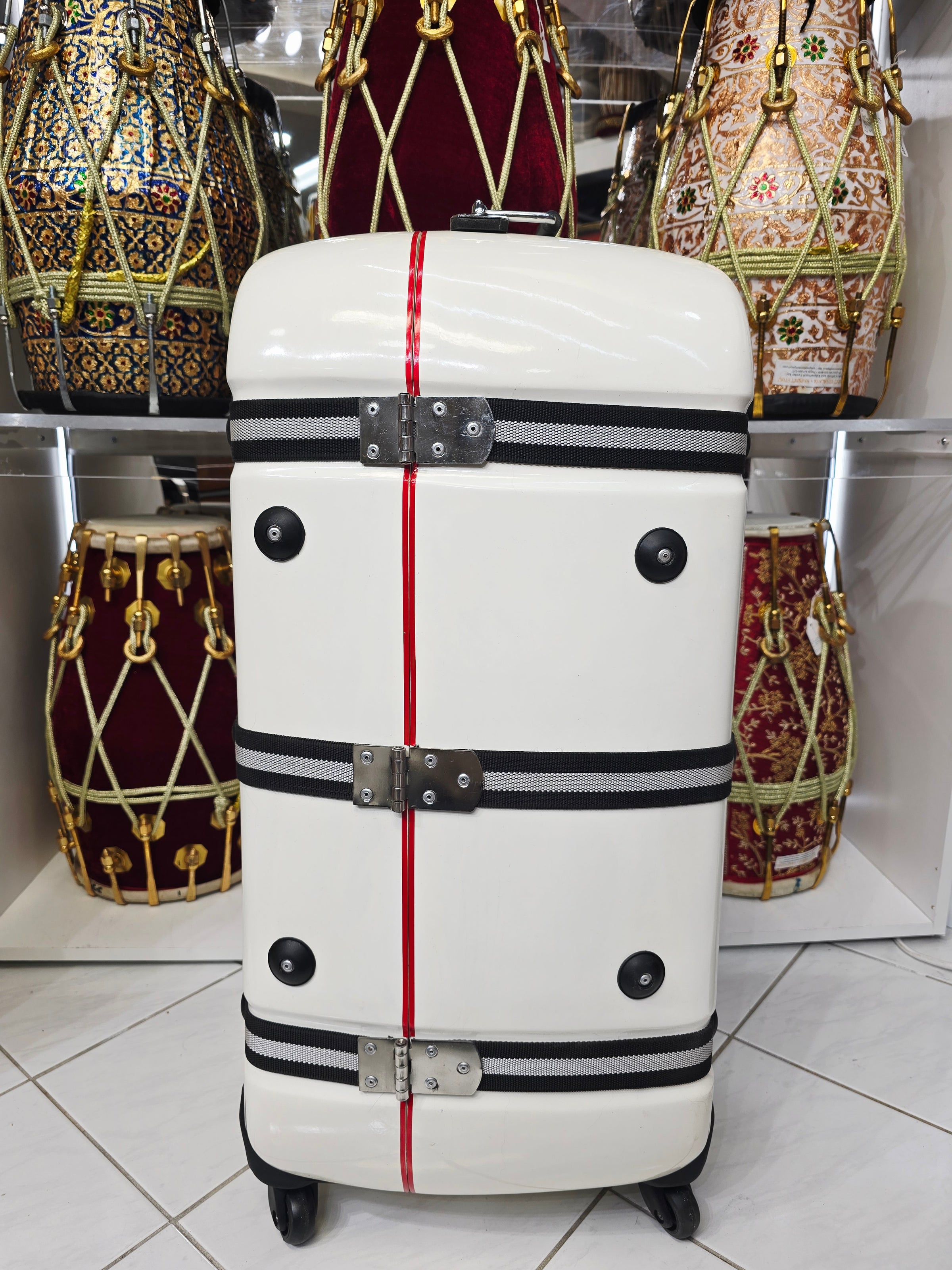The PolarVoyager is a premium white hard-shell travel case built to protect tabla and dholak instruments with maximum durability and a clean, modern aesthetic. Constructed with reinforced impact-resistant panels, chrome locking latches, and secure edge guards, this case is engineered for road travel, flights, and stage touring. Its smooth 360° wheels and sturdy top/side handles ensure effortless mobility, while the sharp black straps and red accent line give it a striking, high-end finish. Rugged, reliable, and visually standout, the PolarVoyager is the perfect travel companion for musicians who demand protection and style.
