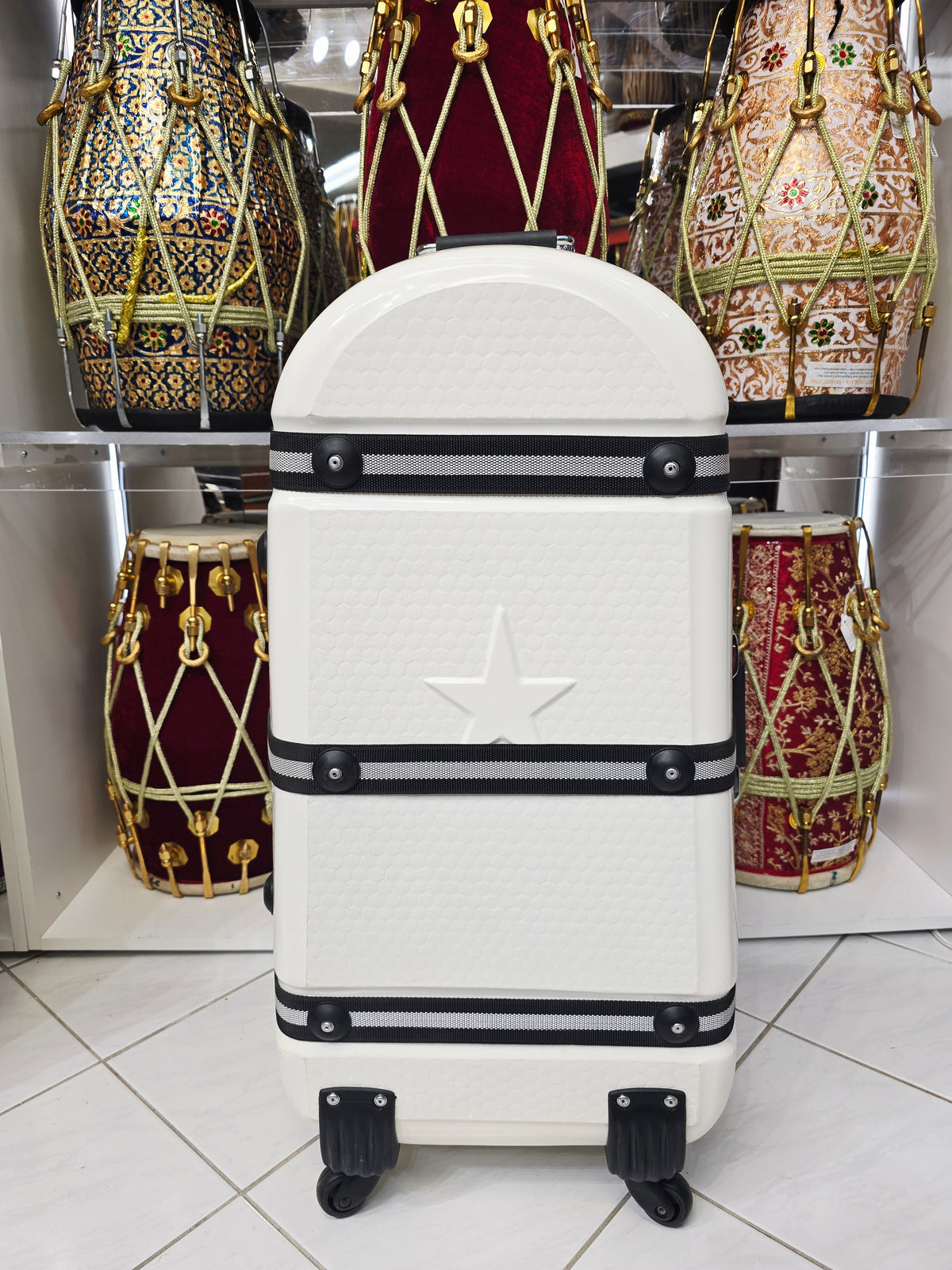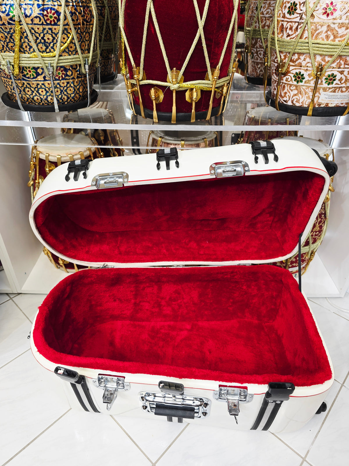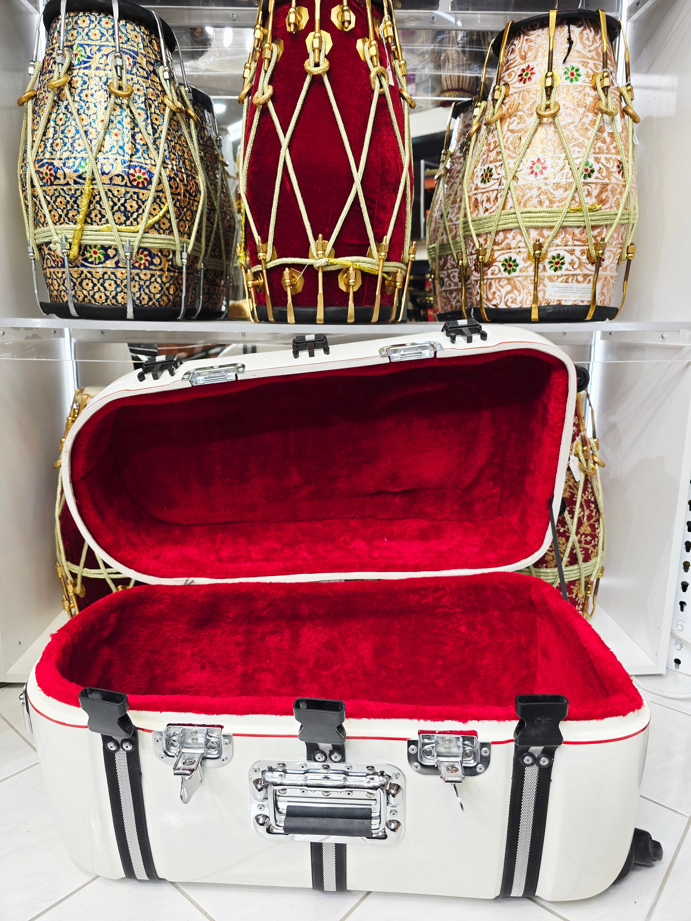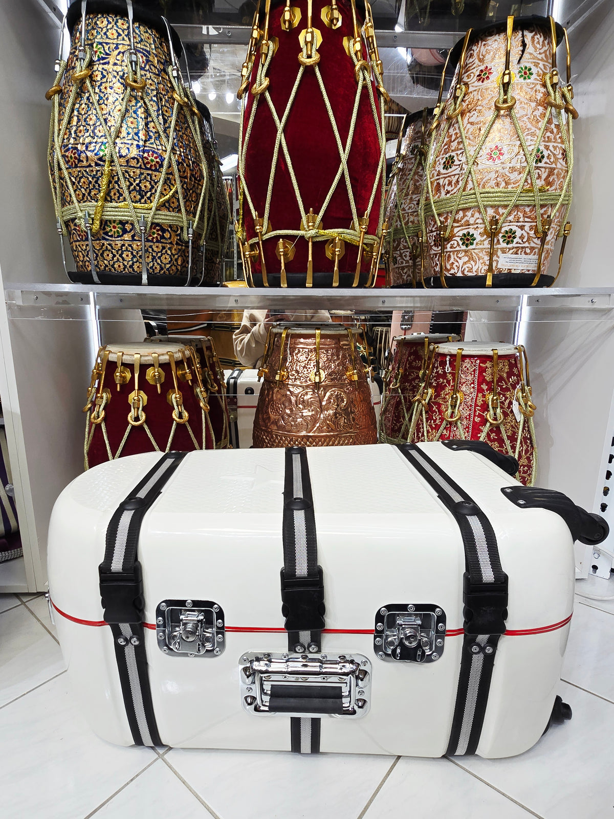 The PolarVoyager is a premium white hard-shell travel case built to protect tabla and dholak instruments with maximum durability and a clean, modern aesthetic. Constructed with reinforced impact-resistant panels, chrome locking latches, and secure edge guards, this case is engineered for road travel, flights, and stage touring. Its smooth 360° wheels and sturdy top/side handles ensure effortless mobility, while the sharp black straps and red accent line give it a striking, high-end finish. Rugged, reliable, and visually standout, the PolarVoyager is the perfect travel companion for musicians who demand protection and style.