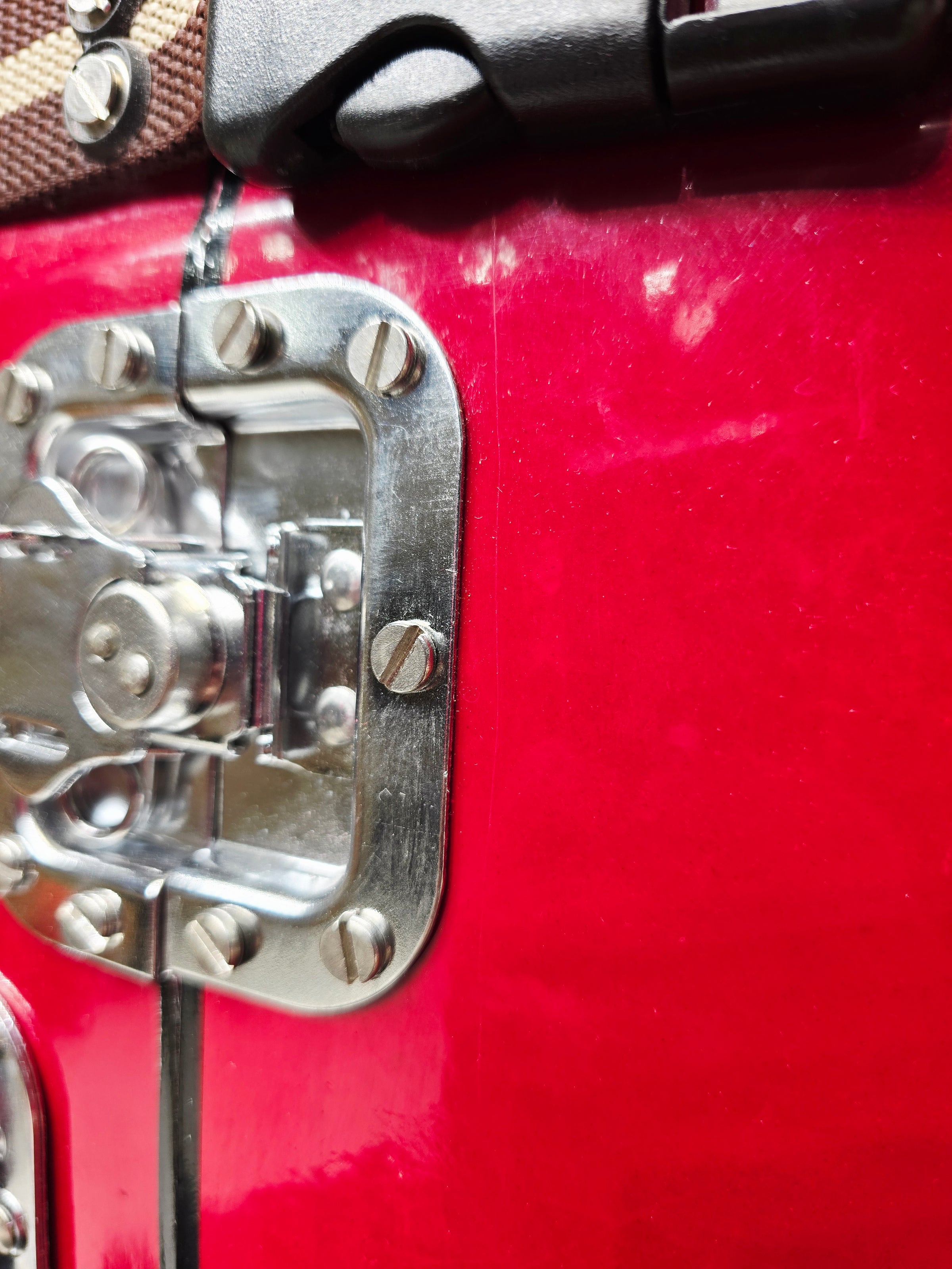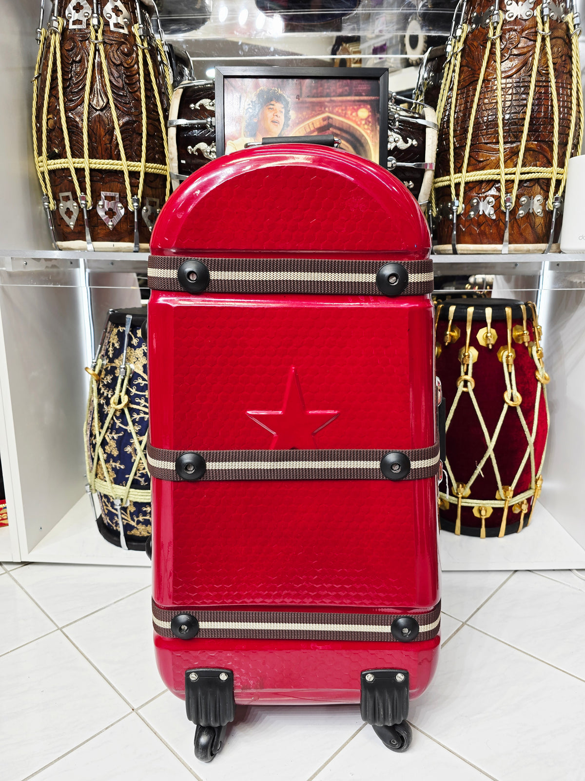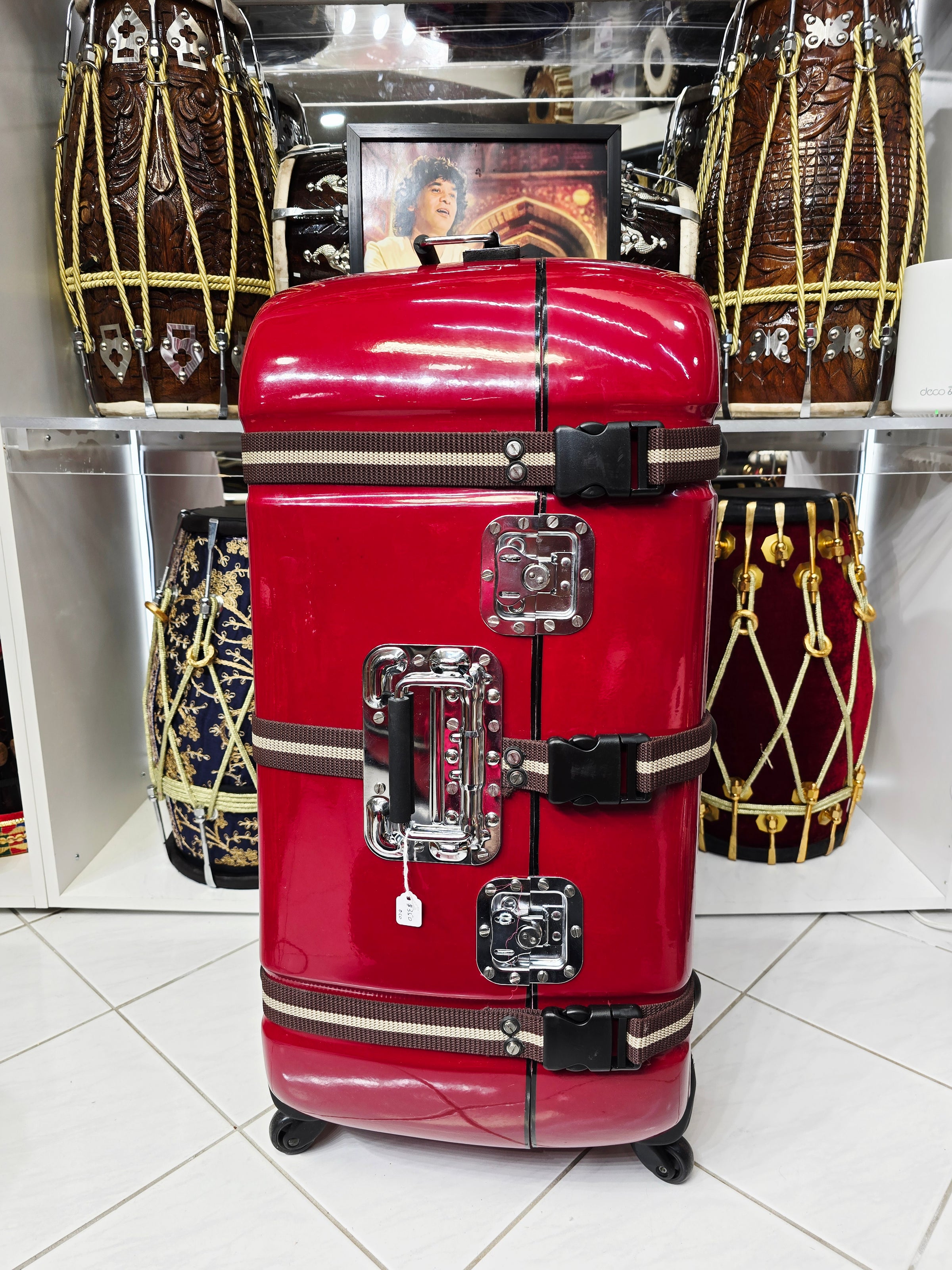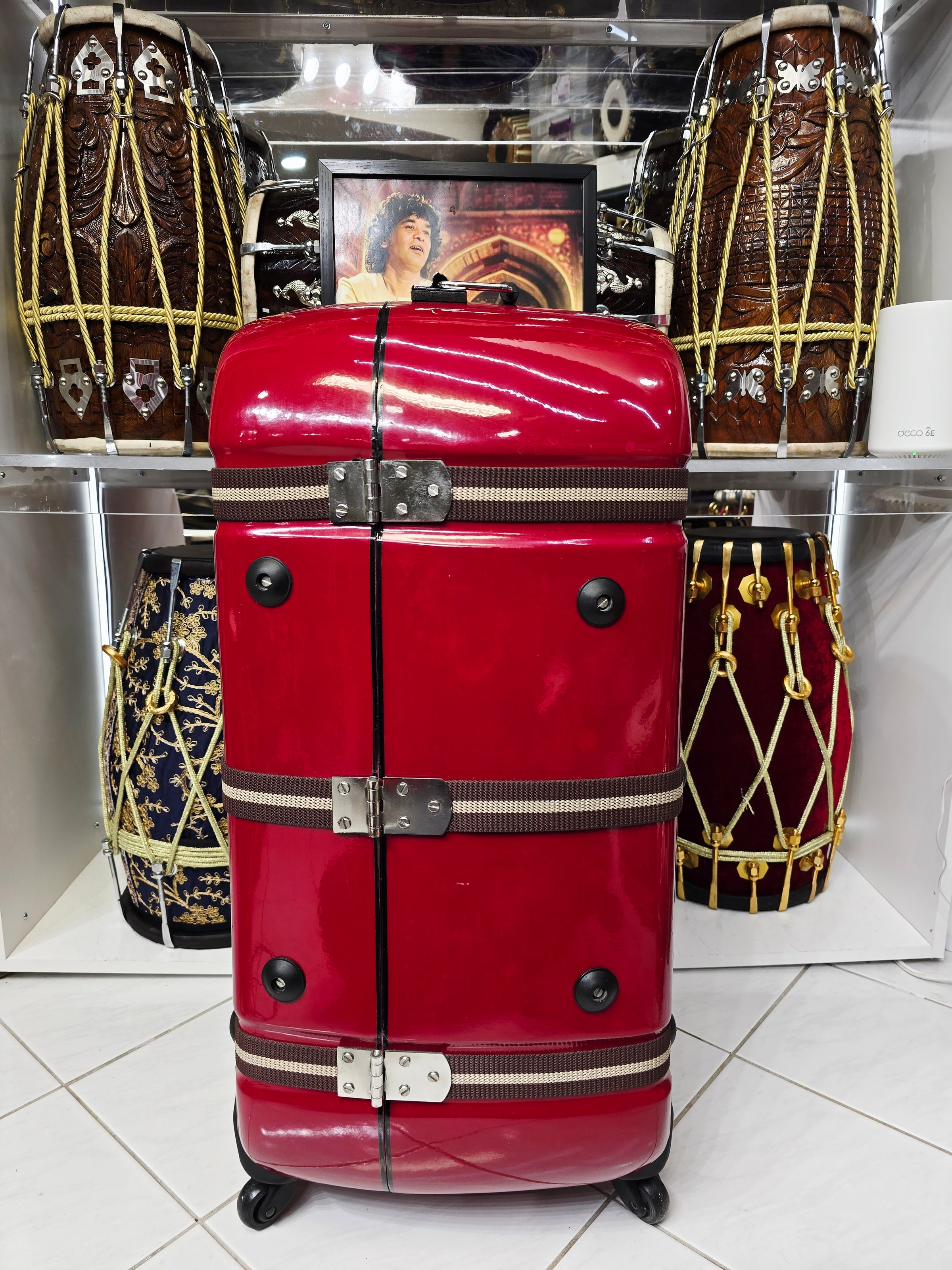 Redline Vault — Deep Red Tabla Hard Case · 360° Spinner Wheels · Dual Handles · Fixed Strap Bands · Very Minor Cosmetic Blemishes (g)